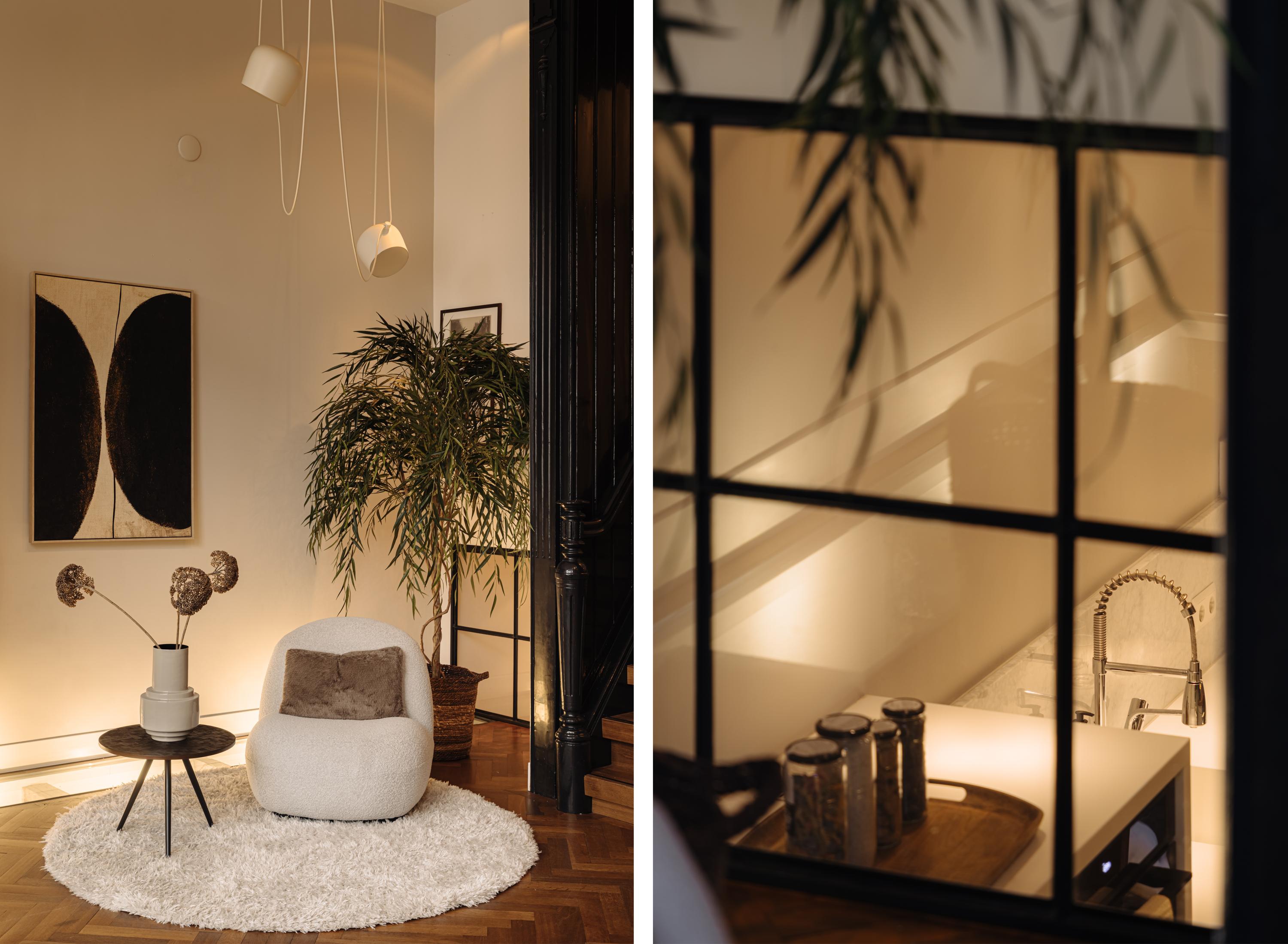 تشير الواجهة المستعادة إلى التراث المعماري لأمستردام، بينما تنفتح المساحات الداخلية في تسلسل من الغرف ذات الأسقف العالية، وأرضيات الباركيه المنسوخة، والمدافئ المزخرفة، والشرفات الفرنسية المضيئة. في الطابق الأرضي، يؤدي مدخل رحب إلى سلسلة من مناطق الجلوس والمعيشة، كلٌ منها معزز بخزائن مصممة خصيصاً وتفاصيل كلاسيكية. الطابق السفلي مخصص للترفيه والتجمع، مع مطبخ مفتوح ومنطقة طعام تحت عوارض مكشوفة، ويجمع بين المساحات الداخلية وفناء هادئ في تواصل سلس. وتوفر وسائل الراحة الحديثة مثل الزجاج المزدوج والتهوية الطبيعية إقامات مريحة على مدار السنة.