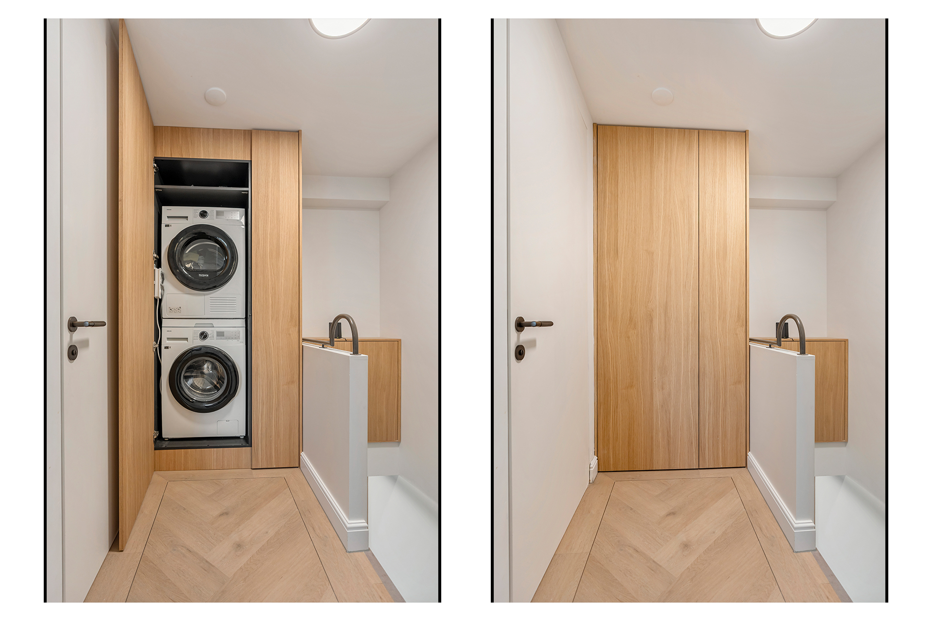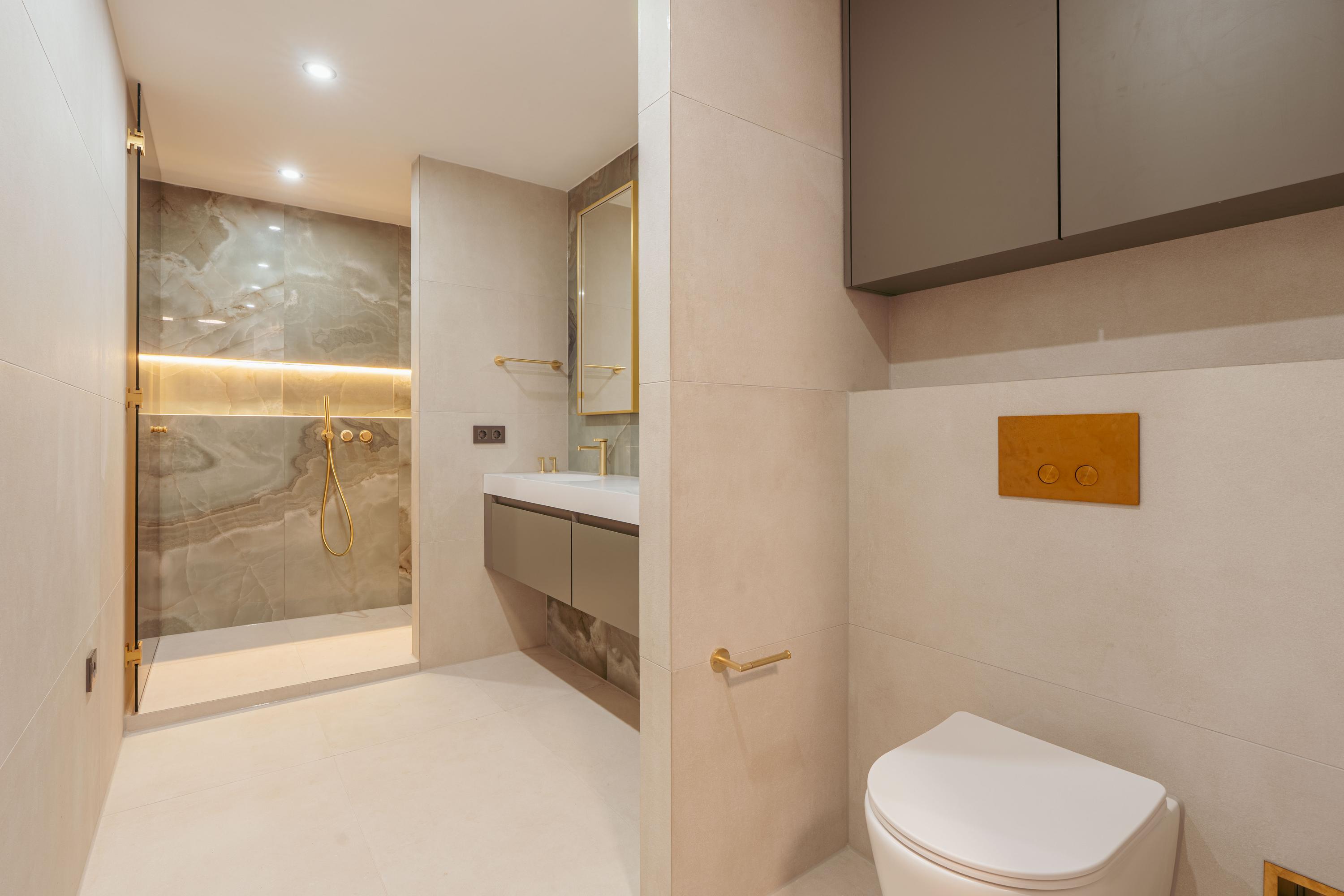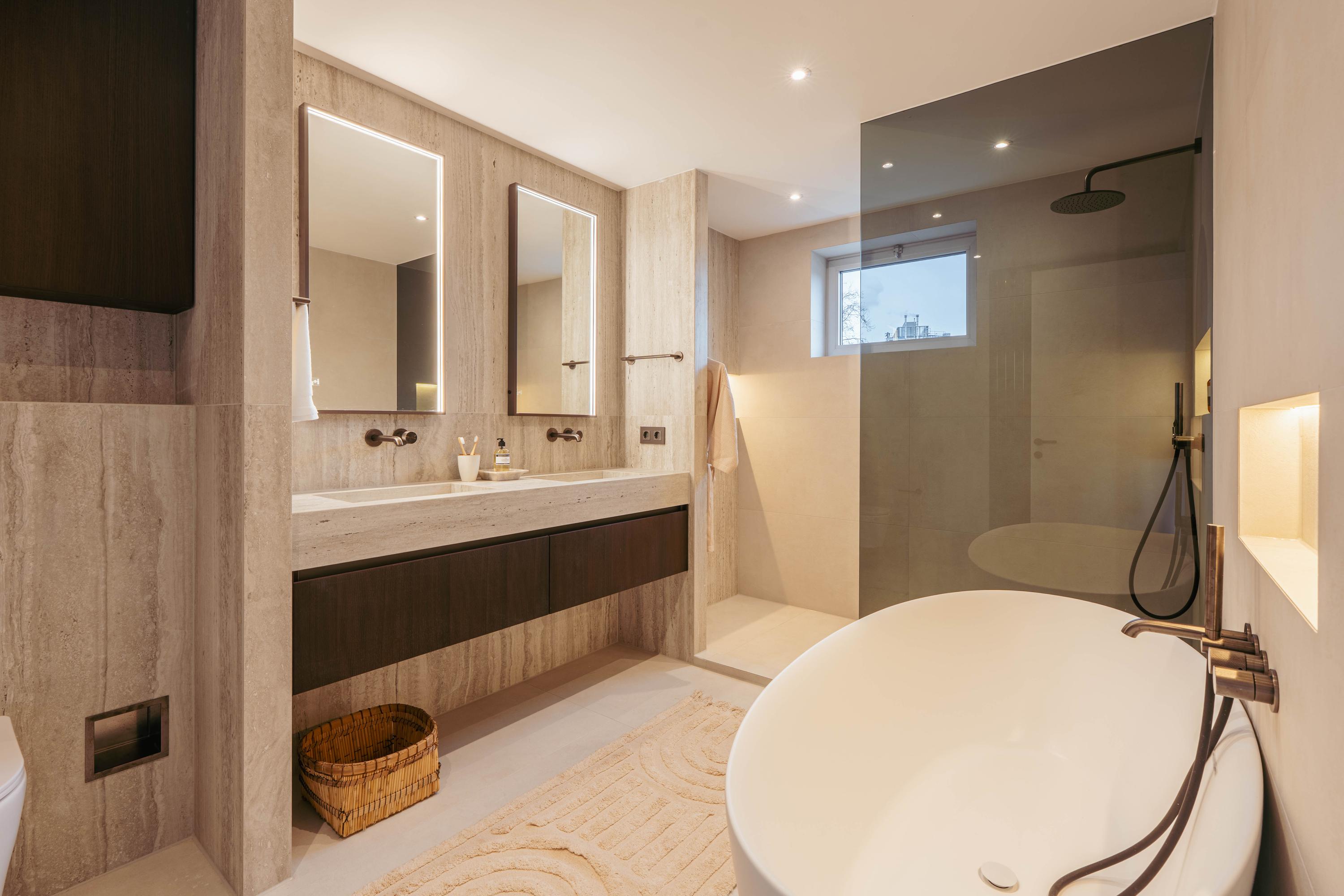 جزيرة المطبخ الأنيقة تدعمها مجموعة من الأجهزة الحديثة، وتغمرها إضاءة هادئة طوال المساء. الجناح الرئيسي بمساحة تقارب 22 متر مربع، مع إطلالة على سينجلغراخت، ويخدمه حمام داخلي هادئ مزود بحوض مستقل ودش مشي. في الطابق العلوي، تحافظ غرفتا نوم إضافيتان وحمام ثانٍ على توازن الشقة وخصوصيتها.