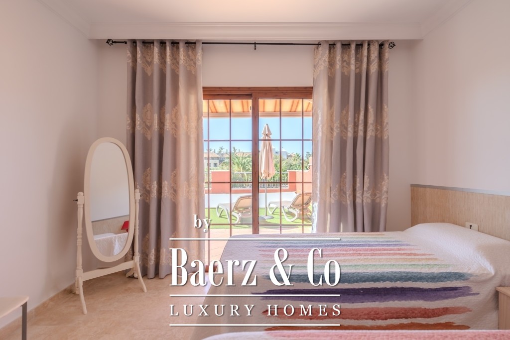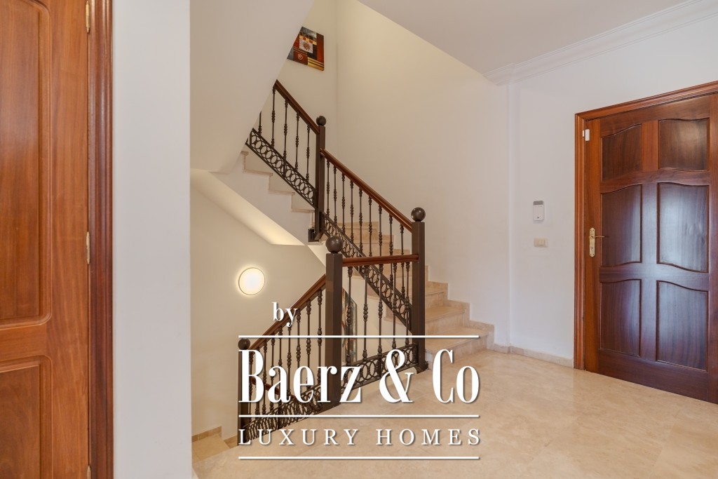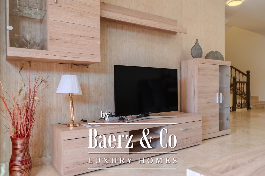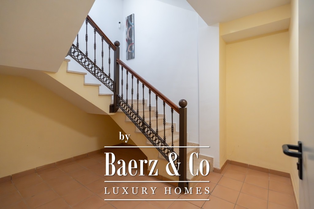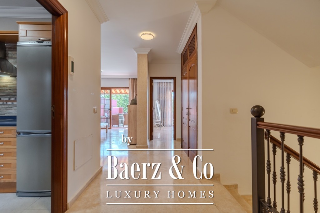 يضم الطابق الأرضي ردهة استقبال أنيقة مع خزائن حائط، ومطبخاً مستقلاً وغرفة غسيل، وصالة للمعيشة وتناول الطعام. توجد أيضاً غرفة نوم وحمام يكملان الطابق، مع منفذ مباشر إلى شرفة مشمسة تطل على مسبح خاص ومنطقة شواء وسط المساحات الخضراء المزدهرة. في الطابق العلوي هناك غرفتا نوم إضافيتان، كل واحدة منها مع خزائن حائط وإطلالة مميزة—إحداهما تطل على شرفة بمنظر الحديقة وبريق البحر البعيد، والأخرى على شرفة صغيرة باتجاه الحدائق. يخدم هذا المستوى حمامان، أحدهما داخلي في غرفة النوم، إضافة إلى مساحة تخزينية واسعة في الممر.