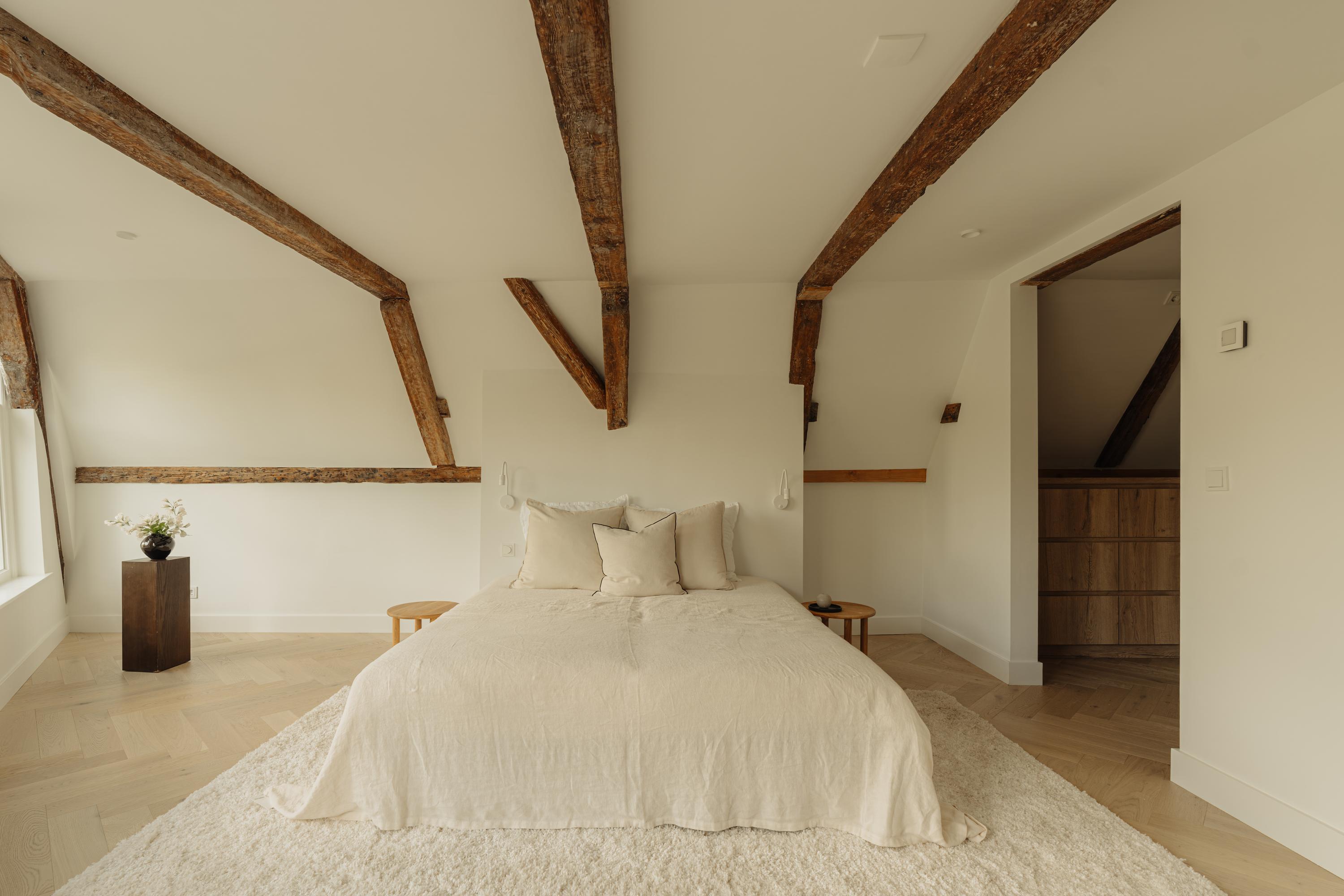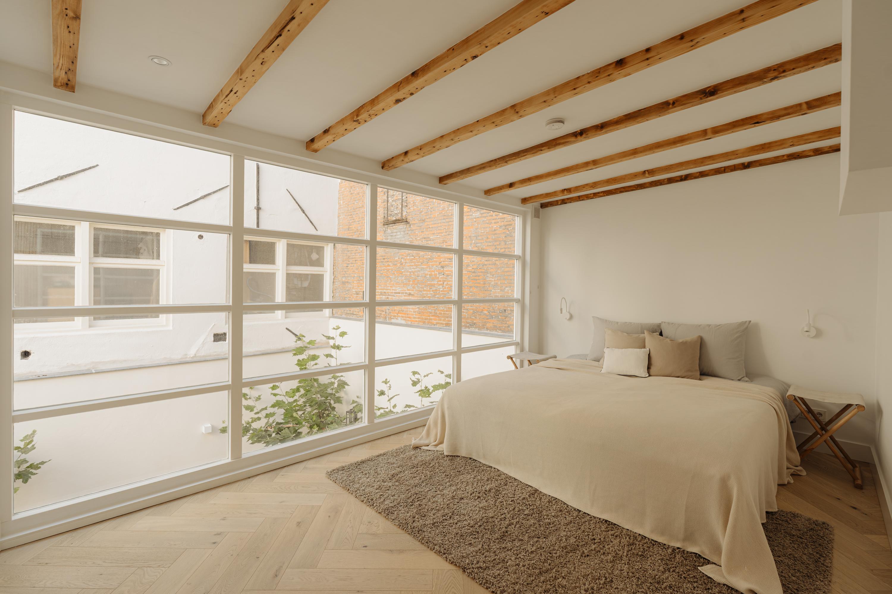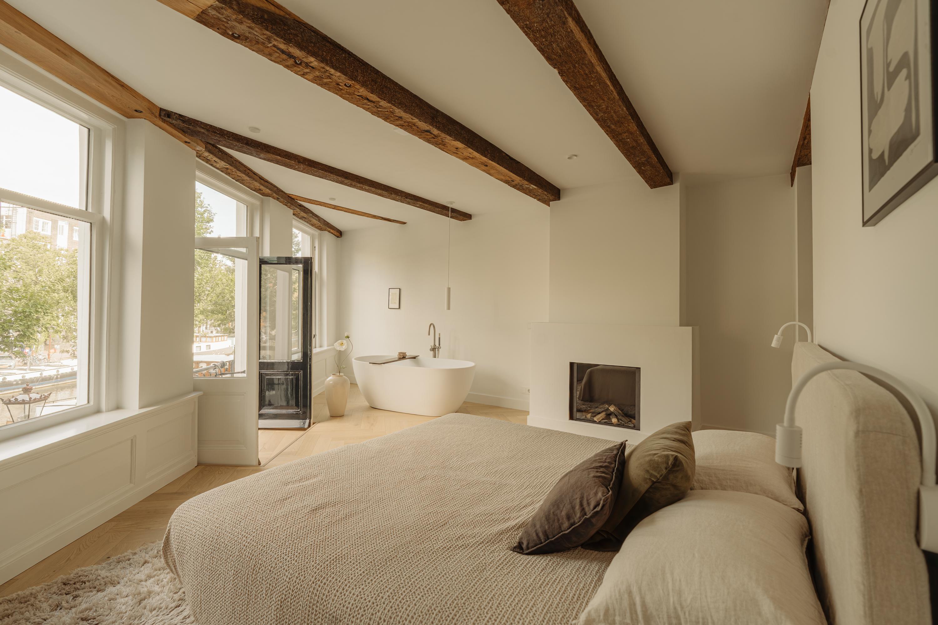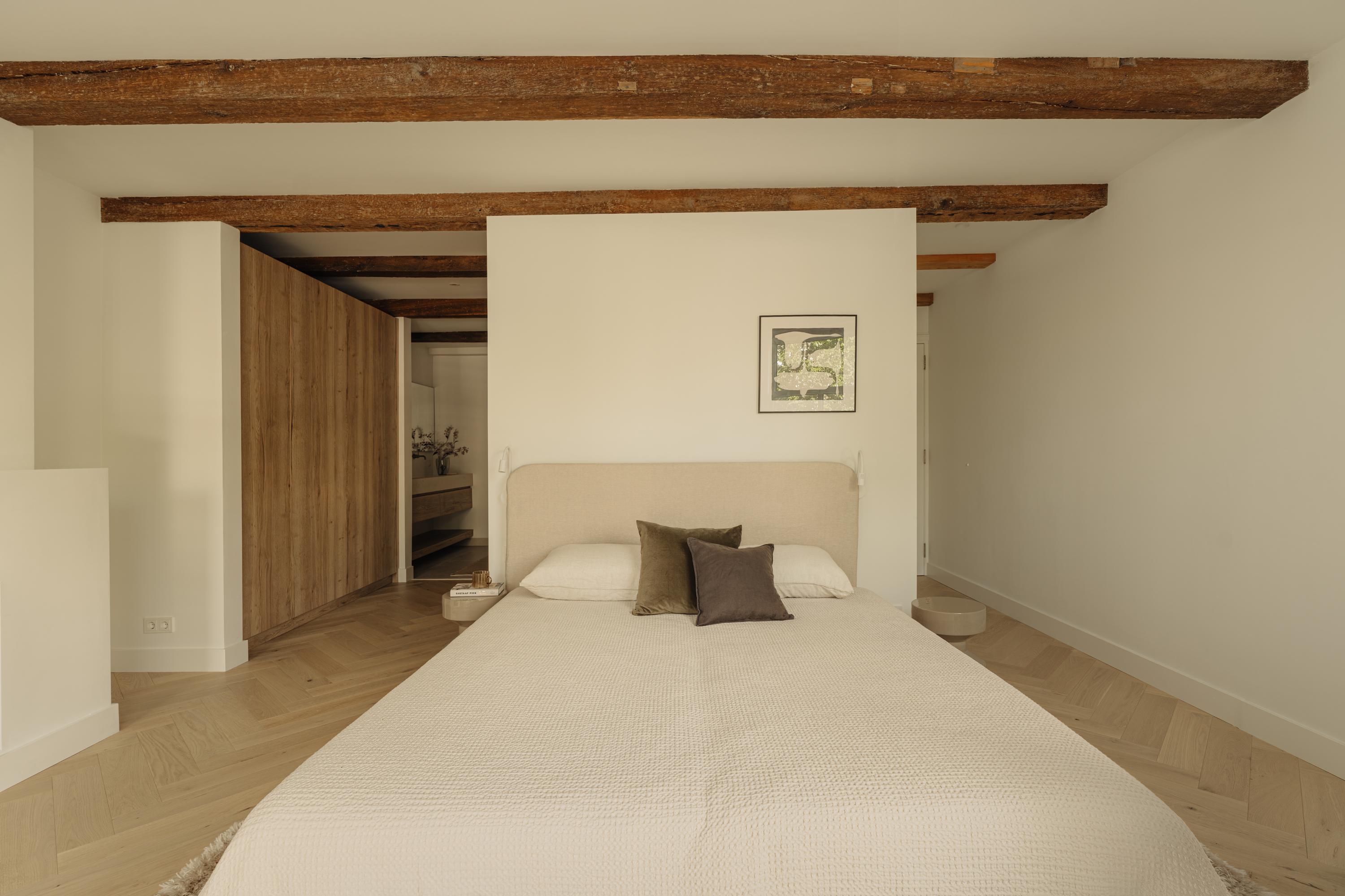 Die erste und zweite Etage beherbergen eine Reihe von Schlafzimmern, die jeweils mit ruhigen Materialien und maßgefertigten Einbauschränken ausgestattet sind. Die Hauptsuite bietet Ausblick zum Wasser, einen französischen Balkon, eine freistehende Badewanne und ein Ensuite-Bad aus Naturstein und Holz. Weitere Schlafzimmer blicken auf die Innenhöfe und eignen sich für Gäste oder flexible Nutzung. Das dritte Obergeschoss umfasst zwei weitere Zimmer, wobei der rückwärtige Bereich Zugang zur Dachterrasse mit Blick über die historische Stadtsilhouette bietet.