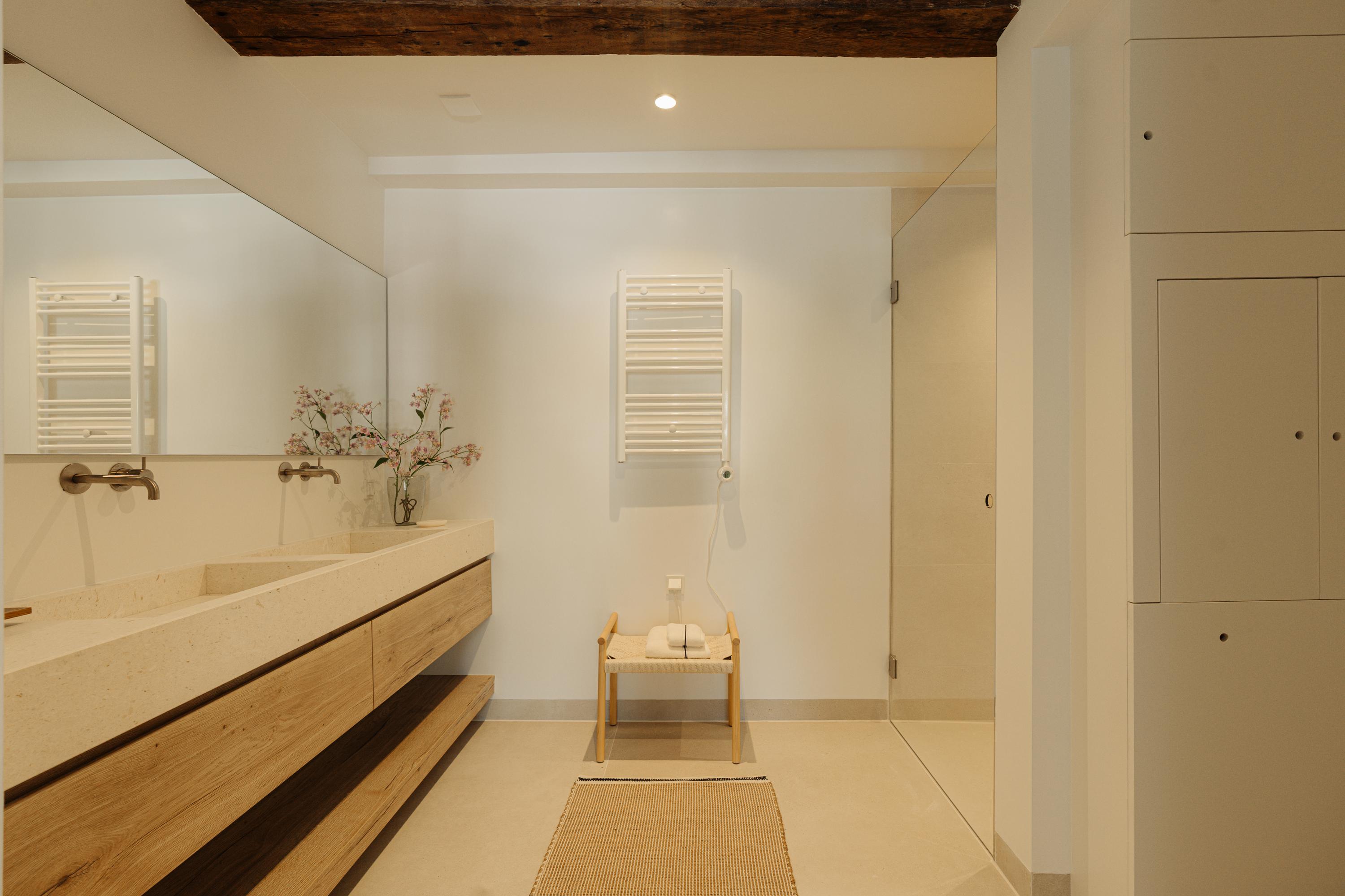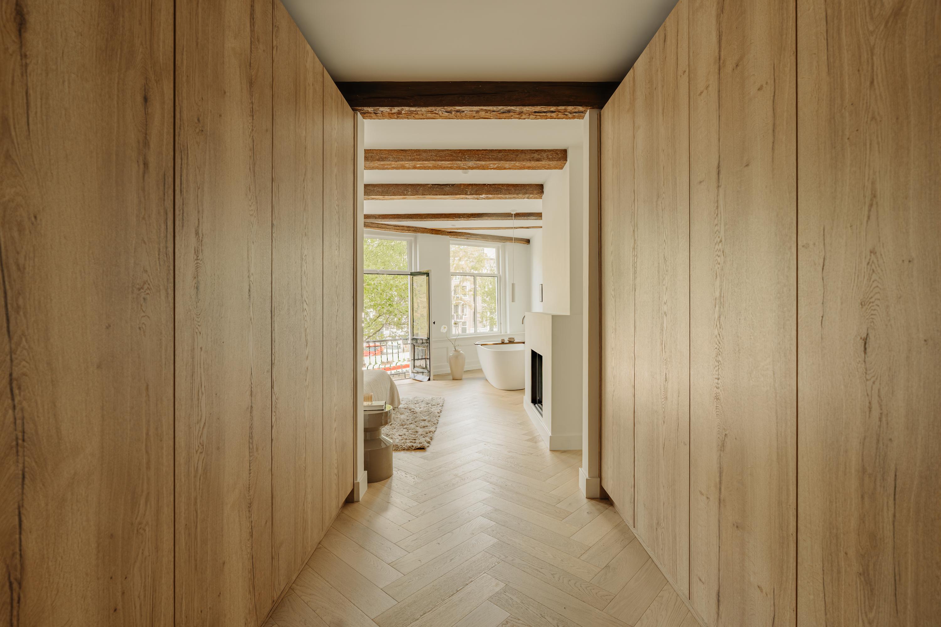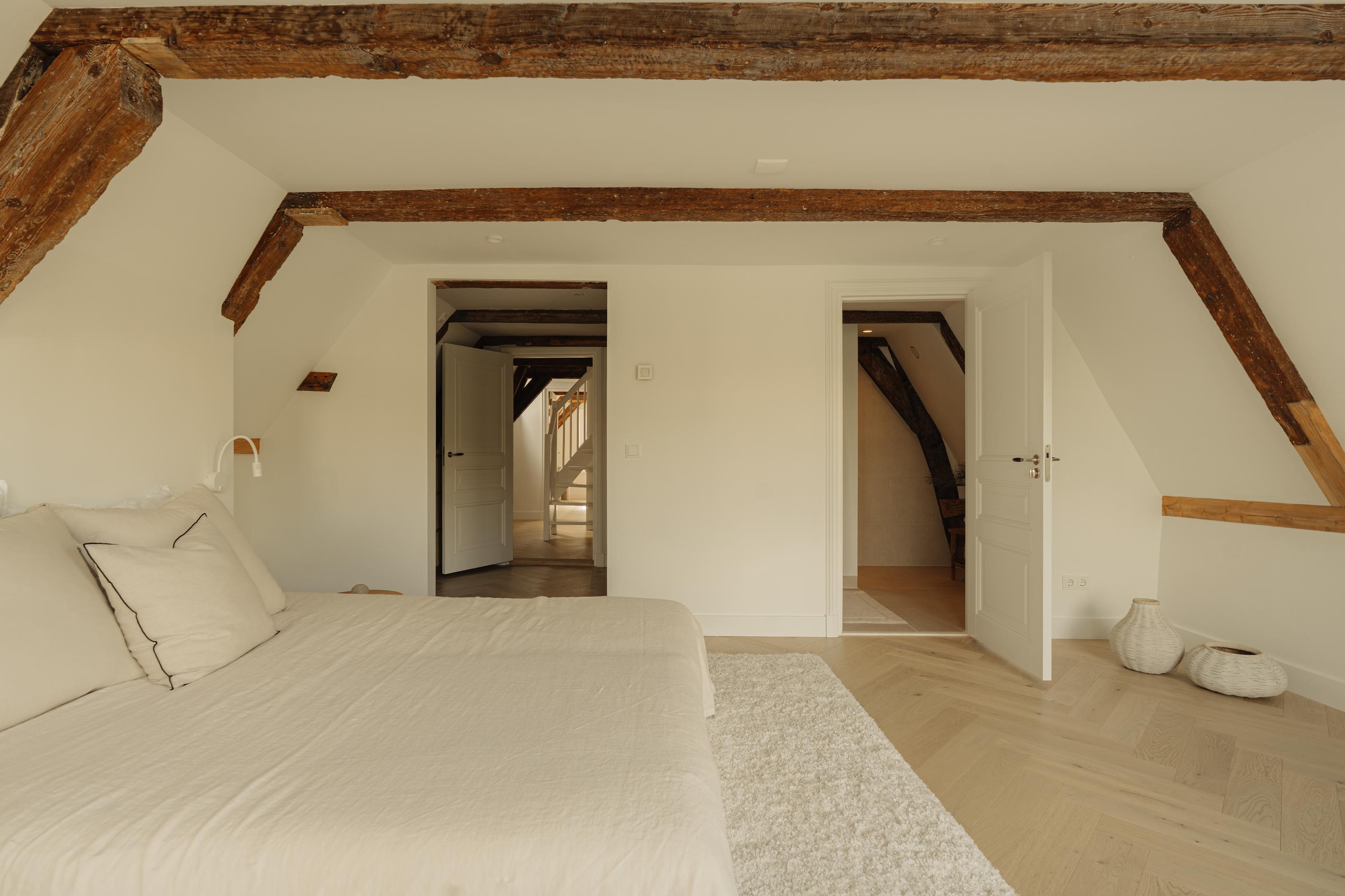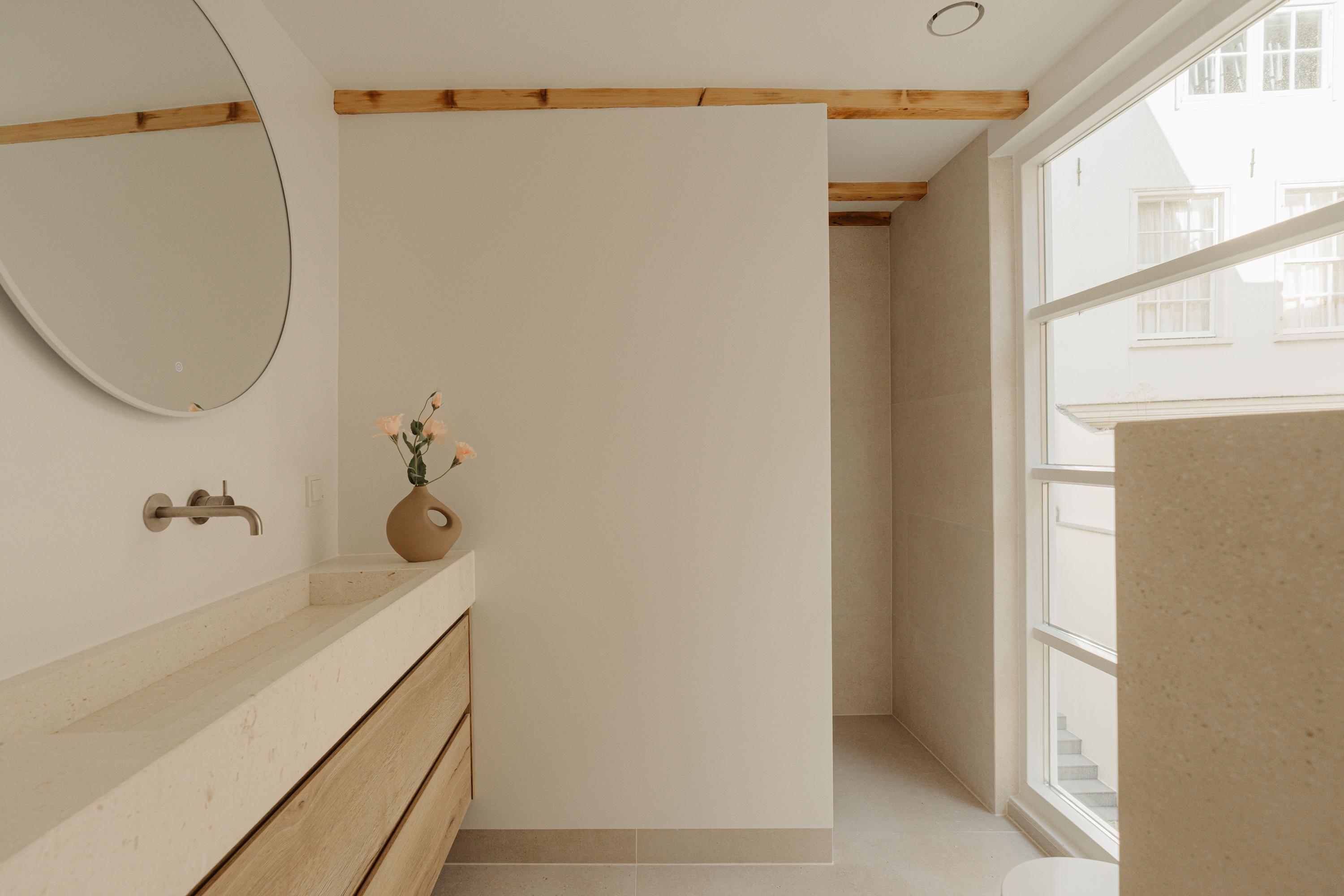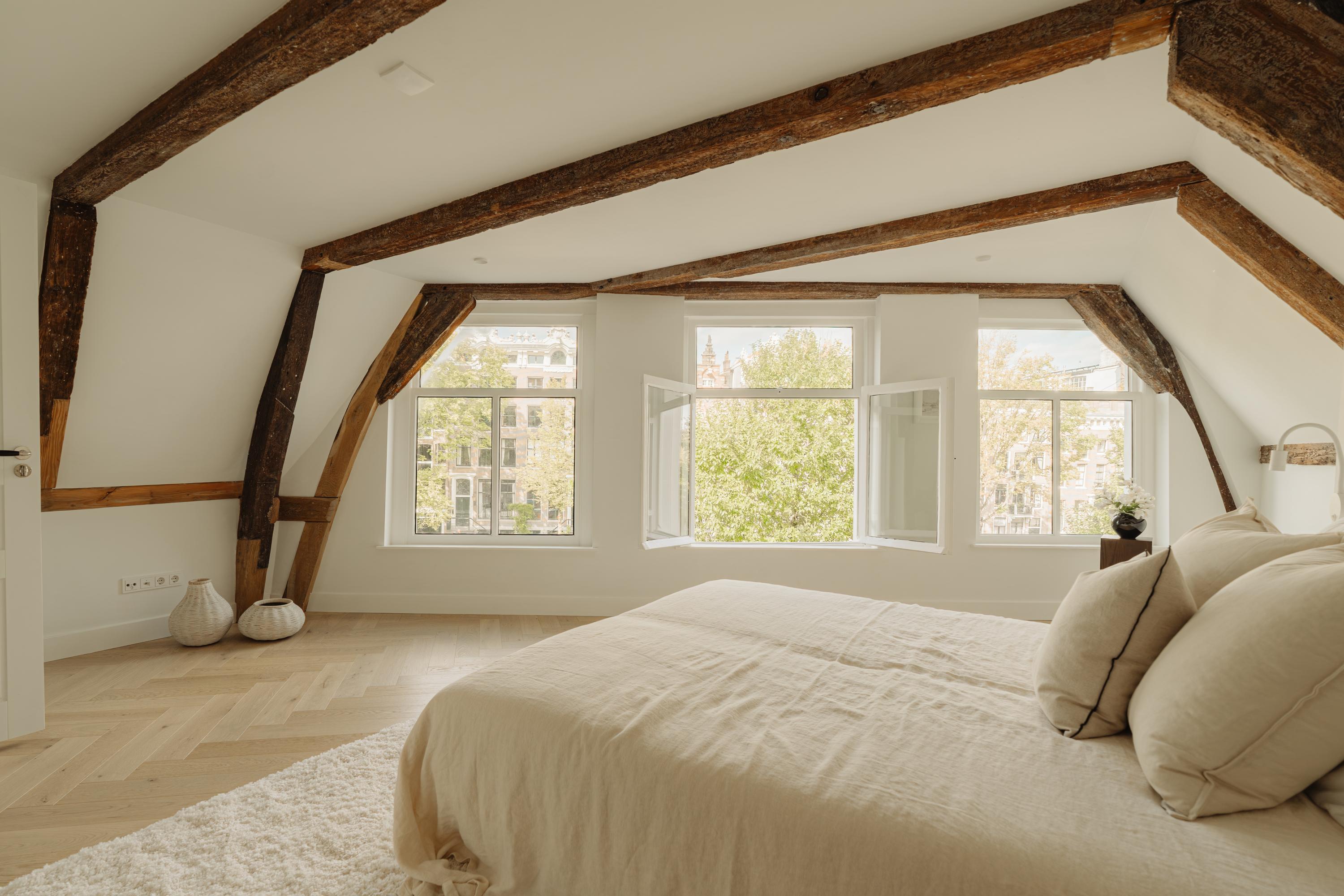 Die erste und zweite Etage beherbergen eine Reihe von Schlafzimmern, die jeweils mit ruhigen Materialien und maßgefertigten Einbauschränken ausgestattet sind. Die Hauptsuite bietet Ausblick zum Wasser, einen französischen Balkon, eine freistehende Badewanne und ein Ensuite-Bad aus Naturstein und Holz. Weitere Schlafzimmer blicken auf die Innenhöfe und eignen sich für Gäste oder flexible Nutzung. Das dritte Obergeschoss umfasst zwei weitere Zimmer, wobei der rückwärtige Bereich Zugang zur Dachterrasse mit Blick über die historische Stadtsilhouette bietet.