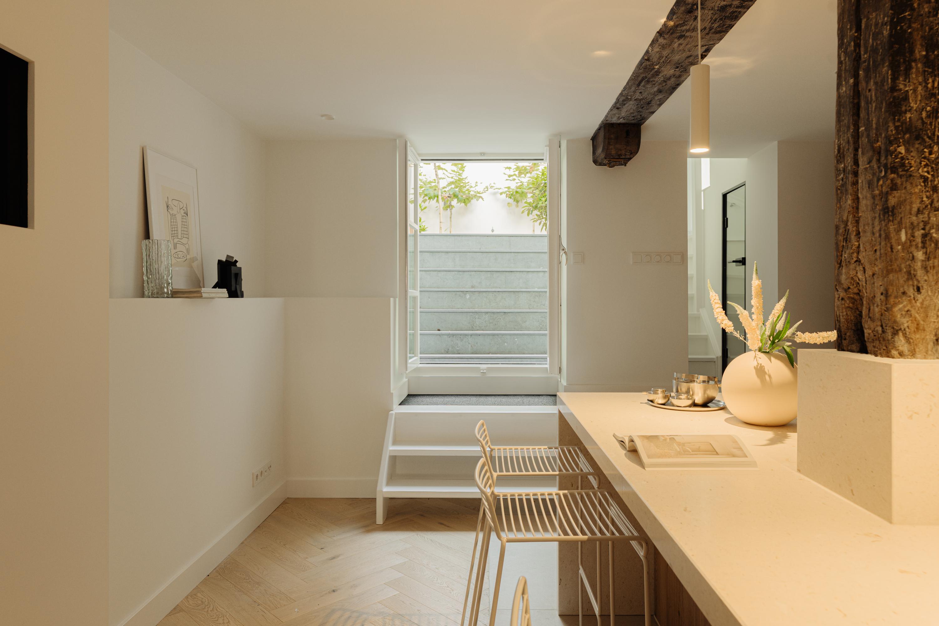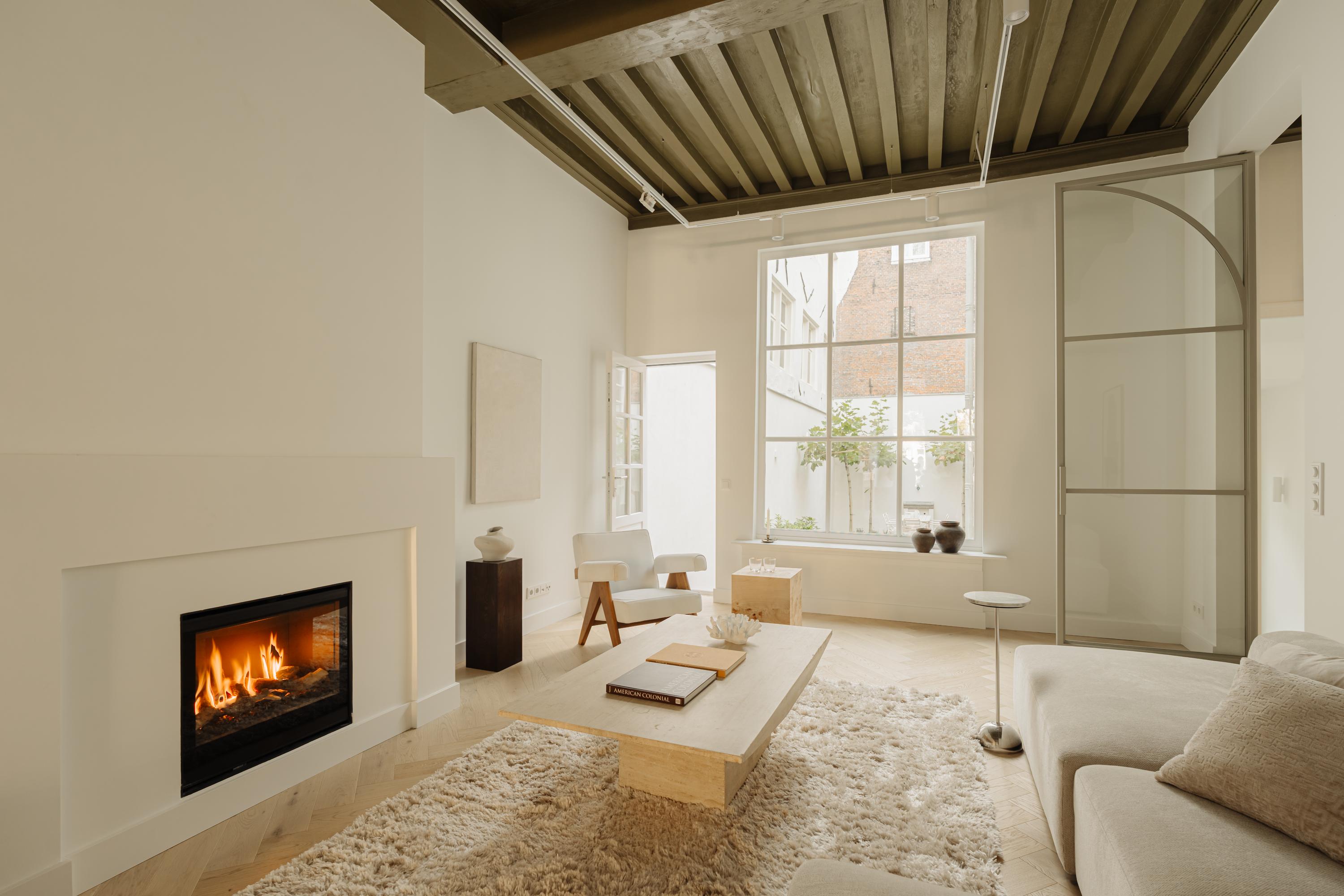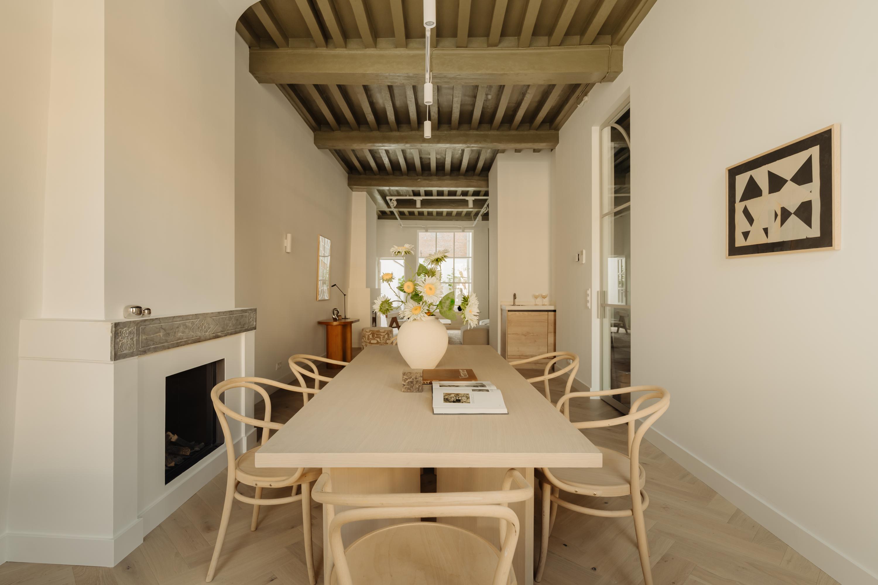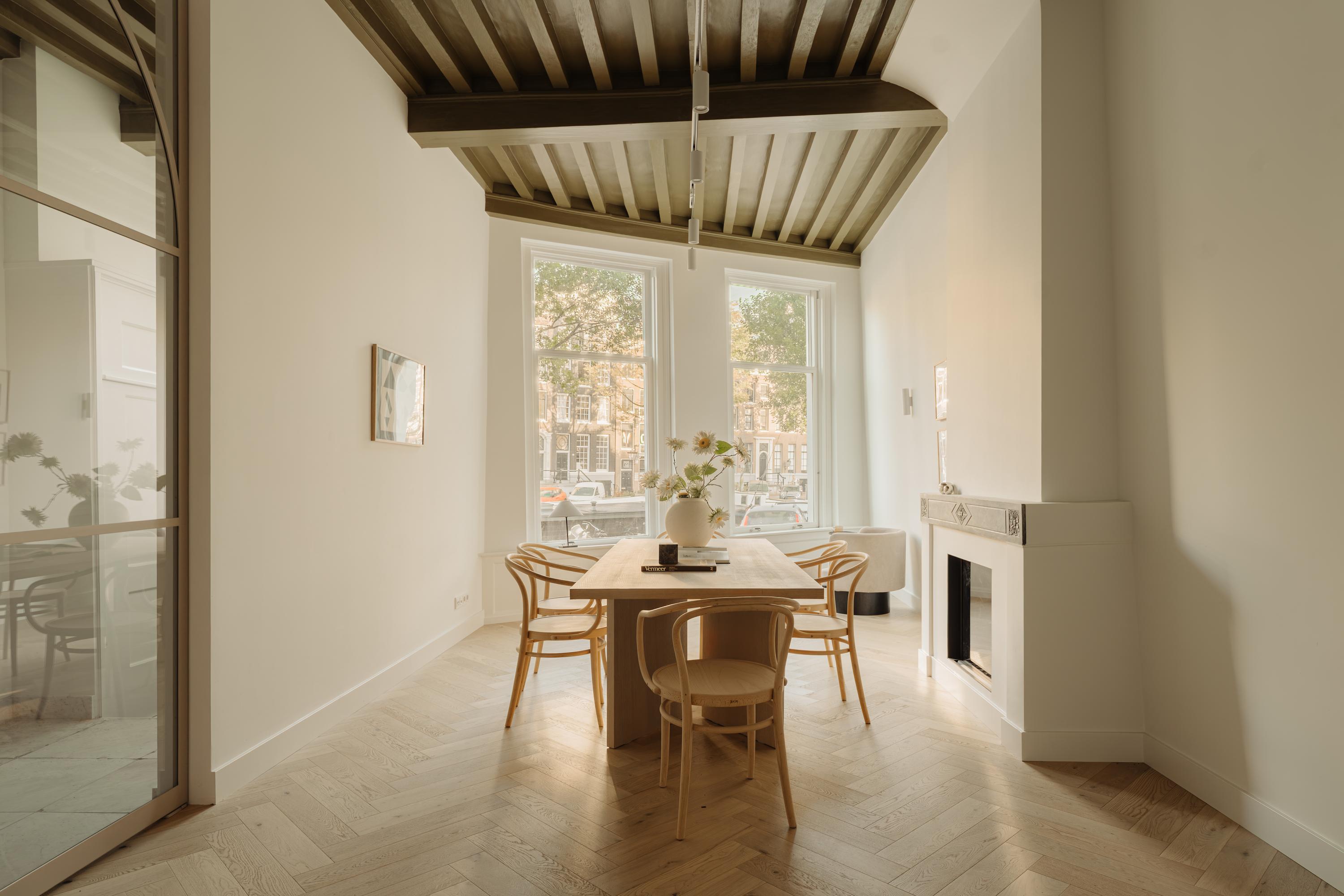 Das Souterrain zeichnet sich durch eine Küche und einen Essbereich aus, die von natürlichen Materialien und maßgefertigten Einbauten geprägt sind, ergänzt durch einen Kamin und den Zugang zum abgeschiedenen Stadtgarten. Funktionalität und Eleganz gehen eine gelungene Verbindung ein, sichtbar an hochwertigen Geräten, einer Kochinsel aus Naturstein und einem eleganten Eichenparkett im Fischgrätmuster. Das Hochparterre empfängt mit einer Marmordiele und einem Wohnbereich mit über 3,4 Meter hohen Decken, Blick auf die Gracht und zwei Kaminen, die Großzügigkeit nahtlos mit Geborgenheit verbinden.