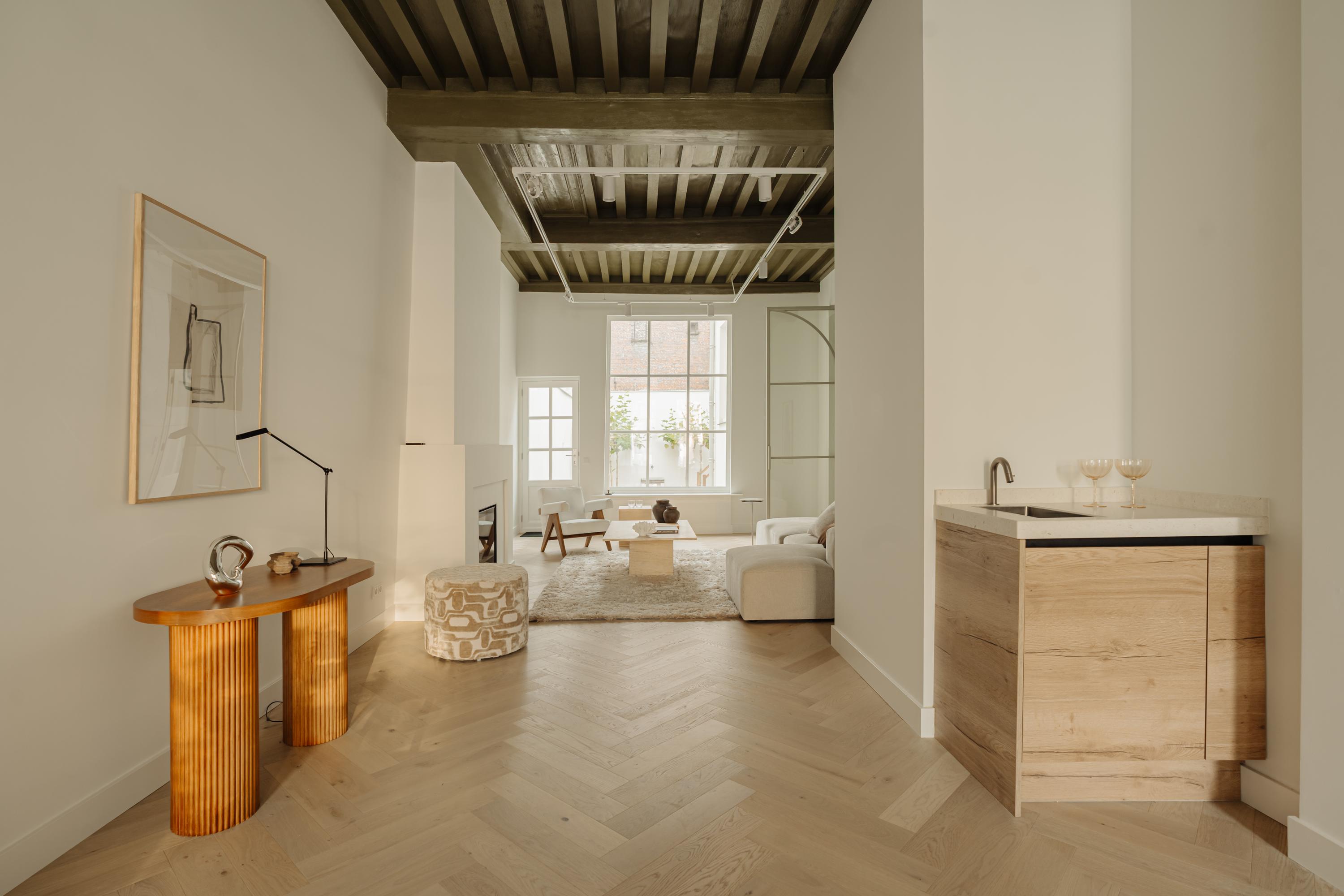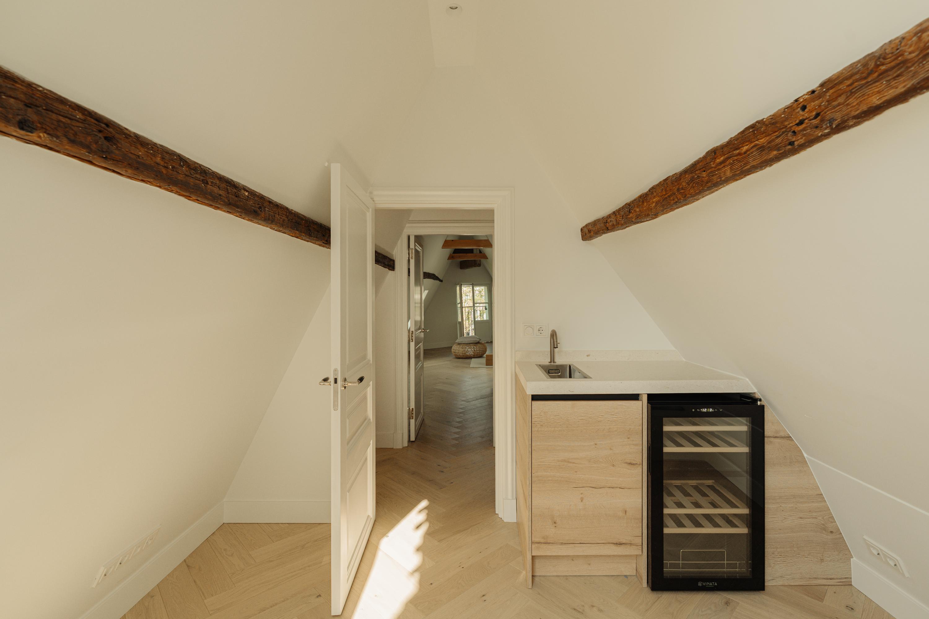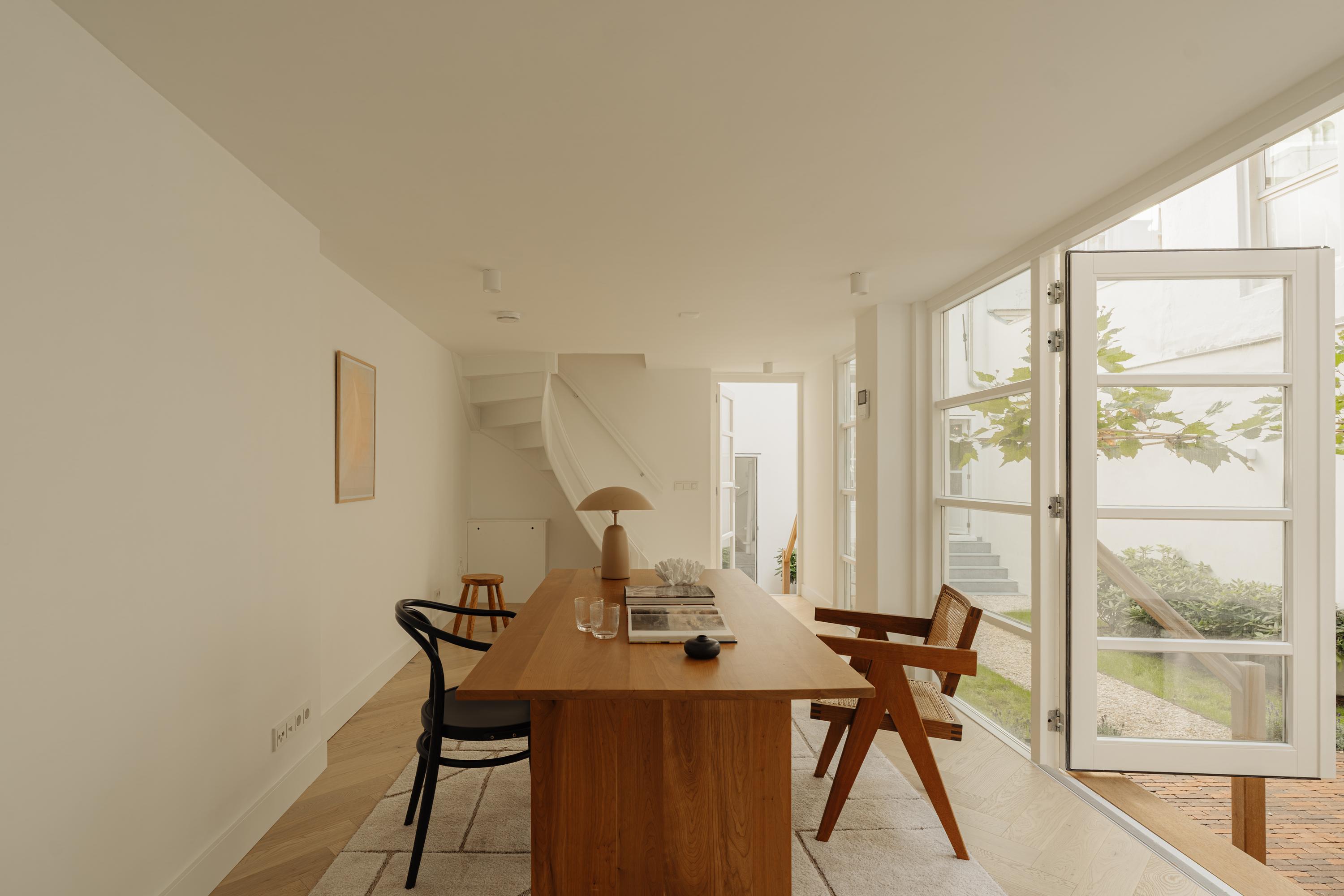 Das Souterrain zeichnet sich durch eine Küche und einen Essbereich aus, die von natürlichen Materialien und maßgefertigten Einbauten geprägt sind, ergänzt durch einen Kamin und den Zugang zum abgeschiedenen Stadtgarten. Funktionalität und Eleganz gehen eine gelungene Verbindung ein, sichtbar an hochwertigen Geräten, einer Kochinsel aus Naturstein und einem eleganten Eichenparkett im Fischgrätmuster. Das Hochparterre empfängt mit einer Marmordiele und einem Wohnbereich mit über 3,4 Meter hohen Decken, Blick auf die Gracht und zwei Kaminen, die Großzügigkeit nahtlos mit Geborgenheit verbinden.