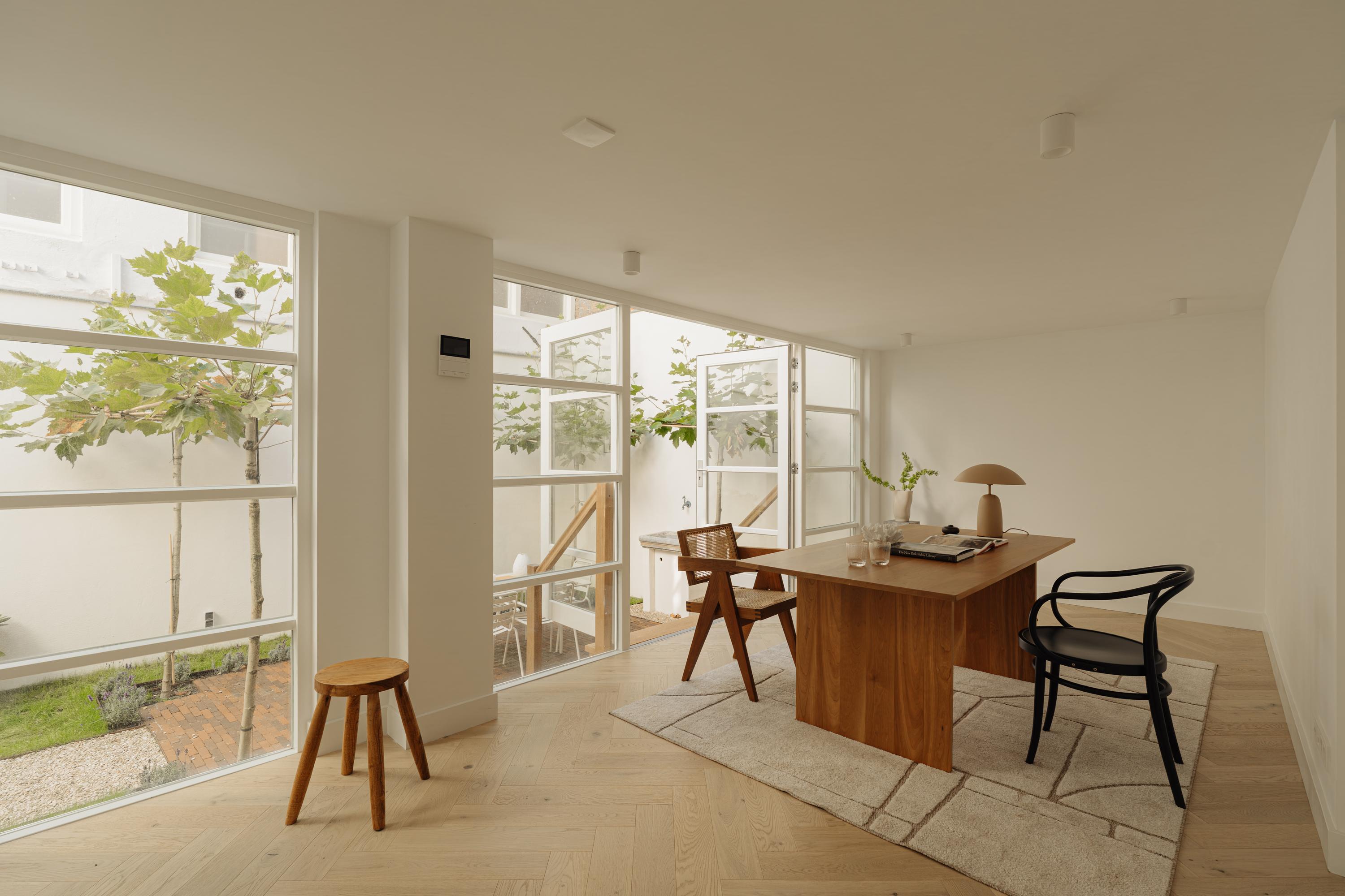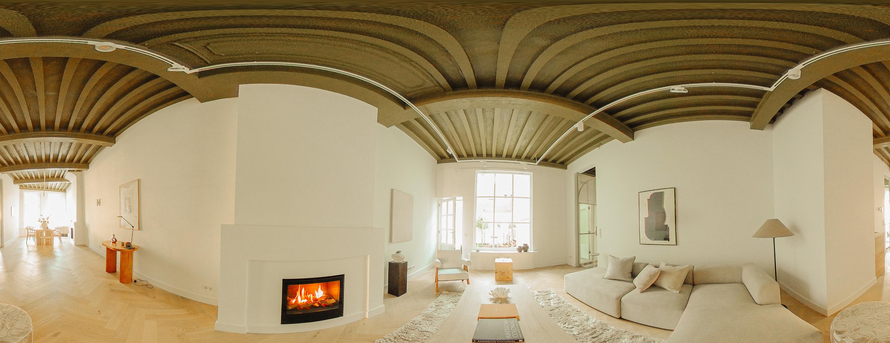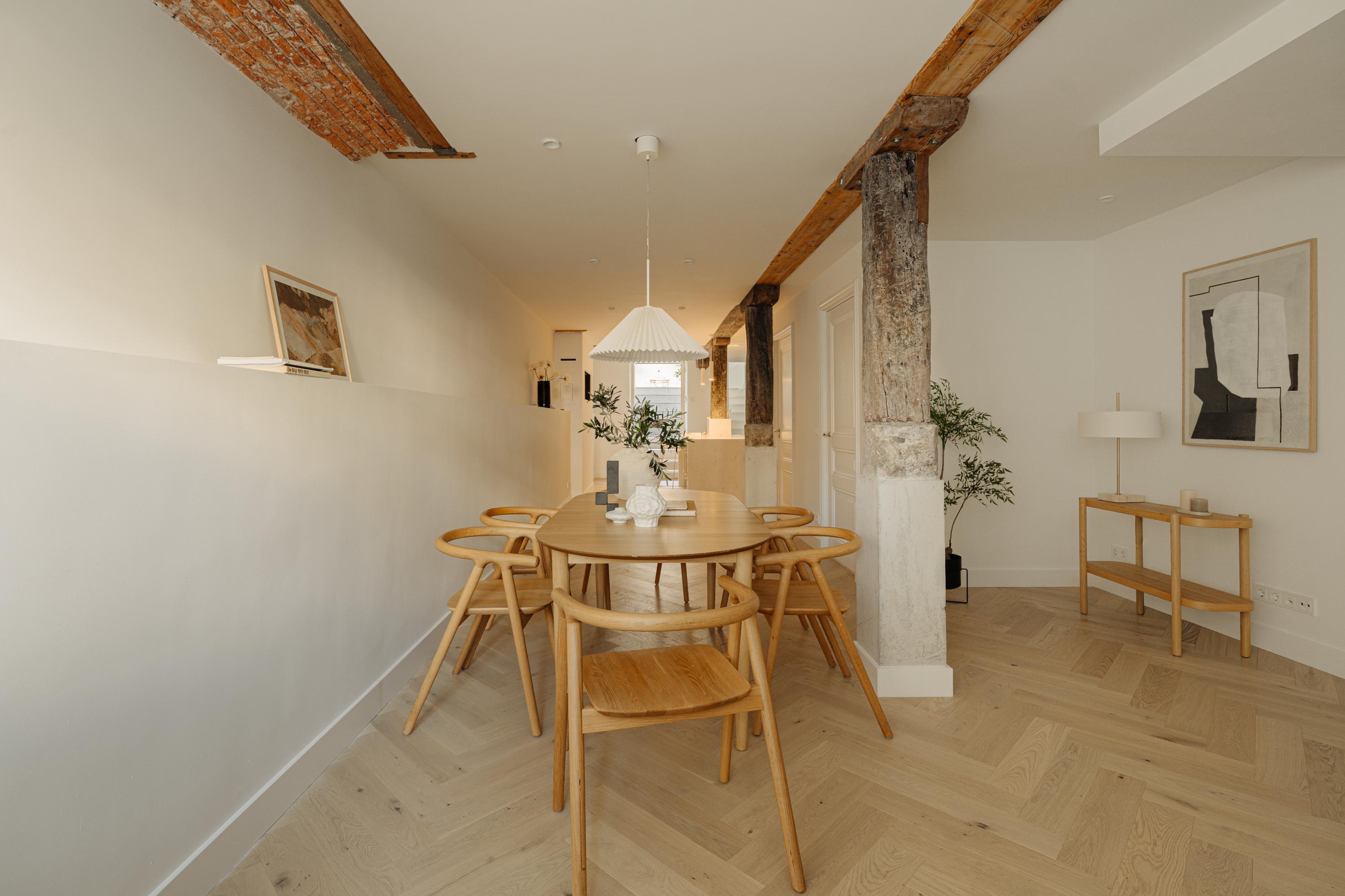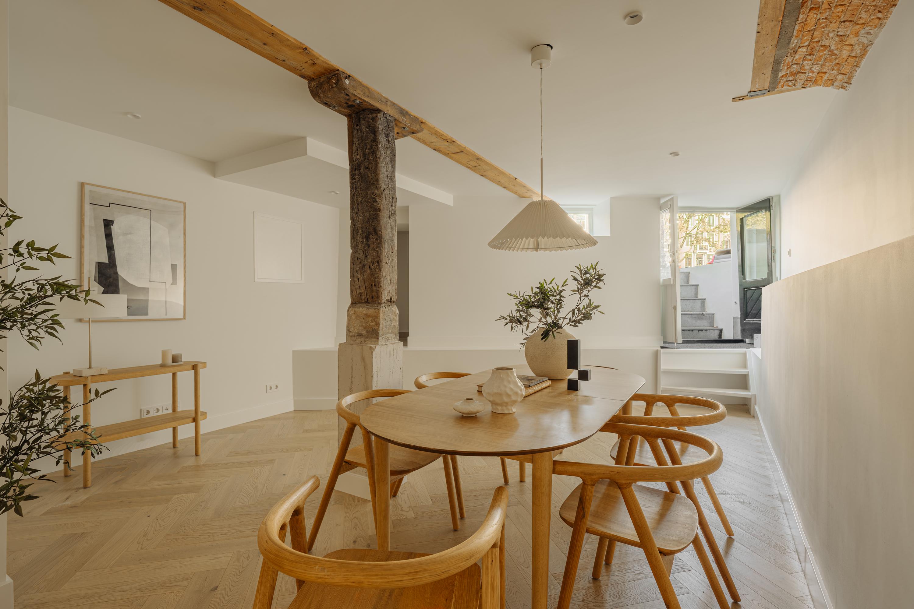 Das Souterrain zeichnet sich durch eine Küche und einen Essbereich aus, die von natürlichen Materialien und maßgefertigten Einbauten geprägt sind, ergänzt durch einen Kamin und den Zugang zum abgeschiedenen Stadtgarten. Funktionalität und Eleganz gehen eine gelungene Verbindung ein, sichtbar an hochwertigen Geräten, einer Kochinsel aus Naturstein und einem eleganten Eichenparkett im Fischgrätmuster. Das Hochparterre empfängt mit einer Marmordiele und einem Wohnbereich mit über 3,4 Meter hohen Decken, Blick auf die Gracht und zwei Kaminen, die Großzügigkeit nahtlos mit Geborgenheit verbinden.