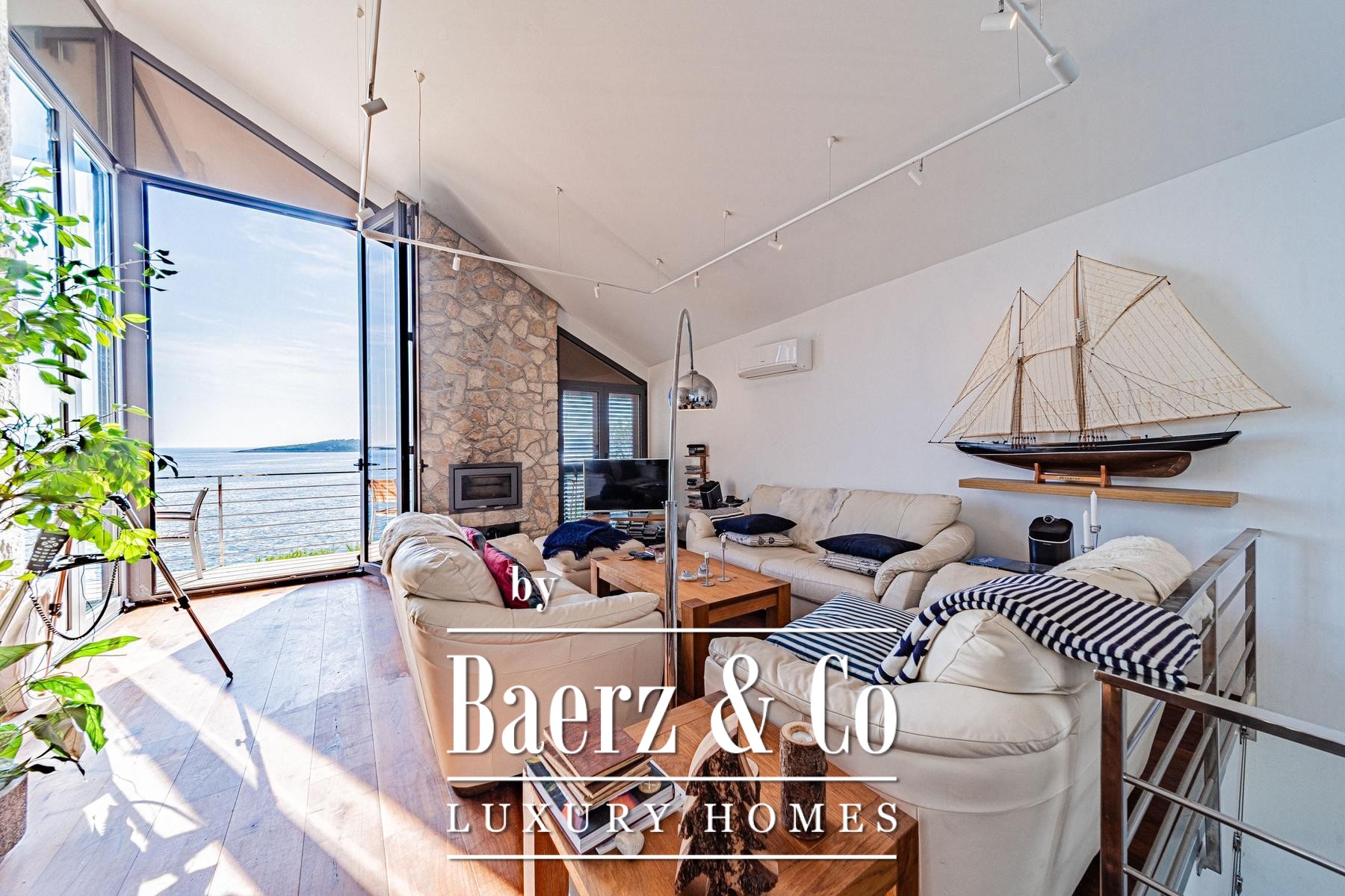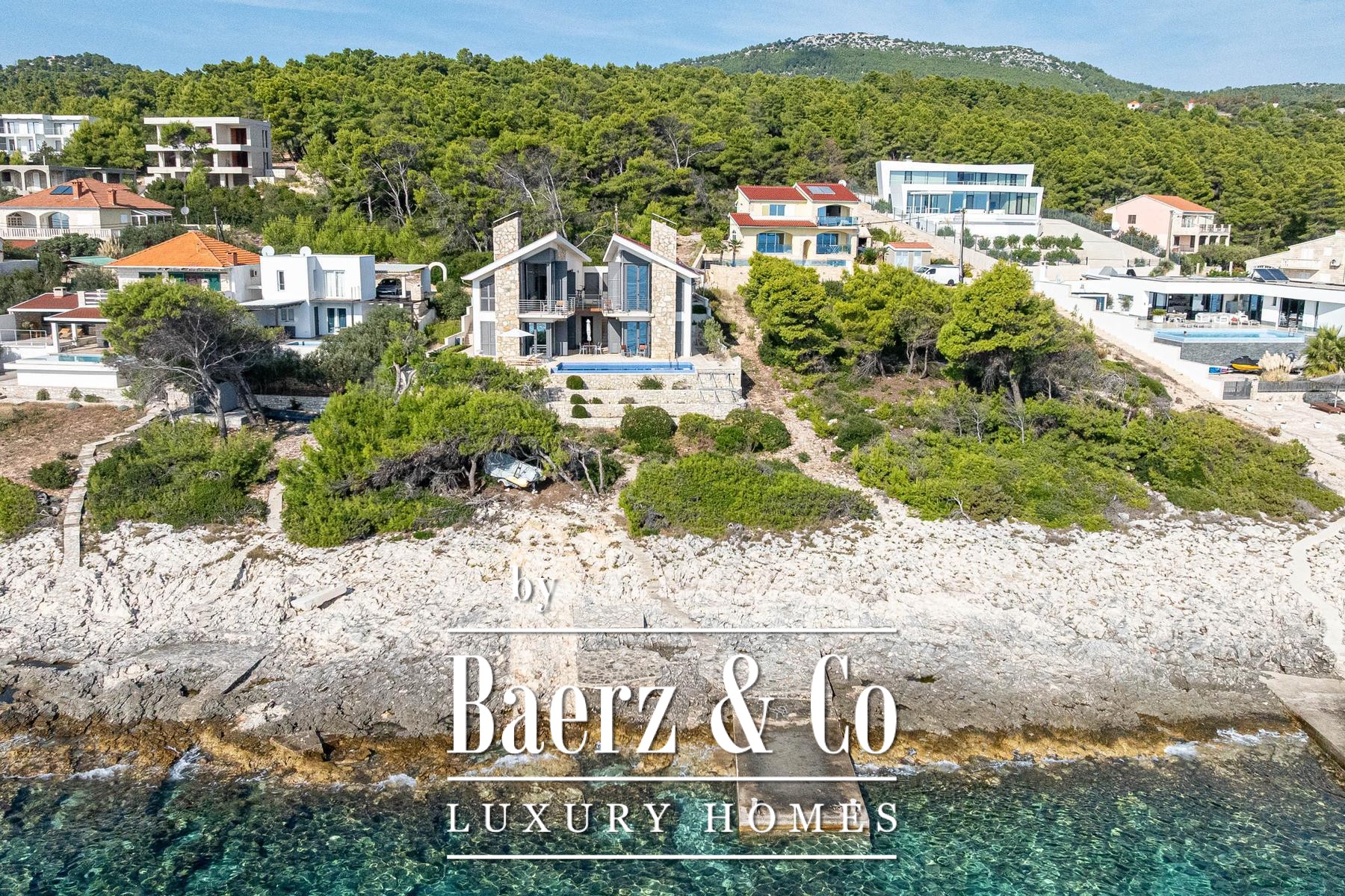 Die Außenanlage vor der Villa zeichnet sich durch hellen Natursteinbelag, einen Swimmingpool und ausgewiesene Sonnenbereiche aus, alles darauf ausgerichtet, das entspannte Leben am Meer zu fördern. Ein Fußweg führt Sie in nur 15 Metern direkt ans Wasser, wo ein kleiner Steg das Anlegen eines Bootes sowie private Rückzugsorte ermöglicht. Hochwertige Materialien und sorgfältig ausgewählte Innenausstattungen sorgen durchgehend für dezente Exklusivität.