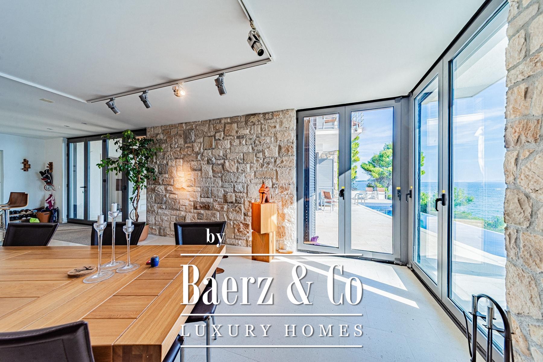 Blickachsen von Boden bis zur Decke eröffnen das Panorama der Adria und des Lastovo-Archipels und unterstreichen das Erlebnis der Villa Blato als Oase von Privatsphäre, Gelassenheit und ursprünglicher Schönheit – eine wahre Verkörperung kroatischen Küstenlebens.