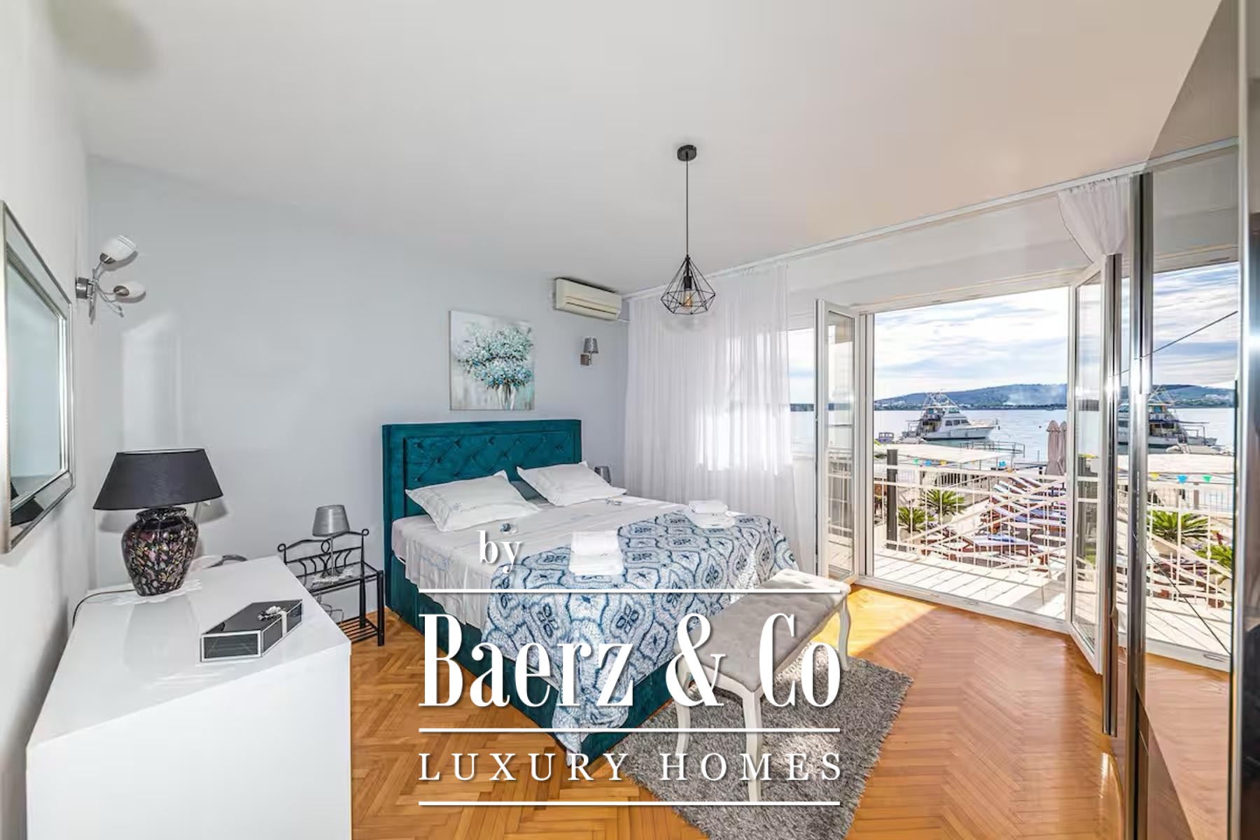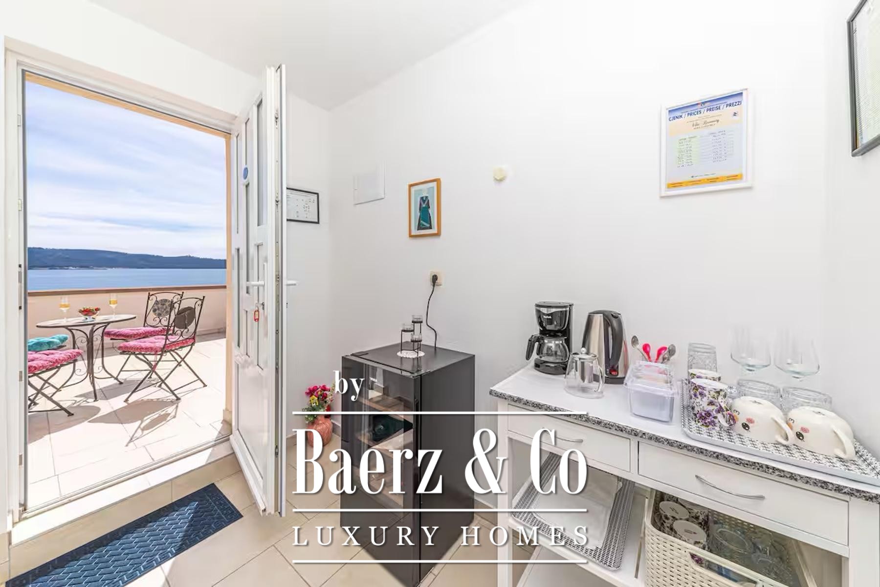 Wellness und Freizeit stehen im Mittelpunkt: Im Untergeschoss erwarten Sie eine private Garage, ein Fitnessbereich und ein Raum für Spiele. Im Außenbereich laden ein nach Süden ausgerichteter privater Pool und ein Jacuzzi zu entspannten Nachmittagen ein; ein mit Stein verkleideter, überdachter Lounge-Bereich mit Kamin befindet sich direkt am Wasser. Dieses Haus zeichnet sich durch ungestörten Meerblick und ein sorgfältig abgestimmtes Lebensgefühl aus – ein seltenes Seafront House zum Verkauf in Kaštela, in dem Eleganz leise spricht.