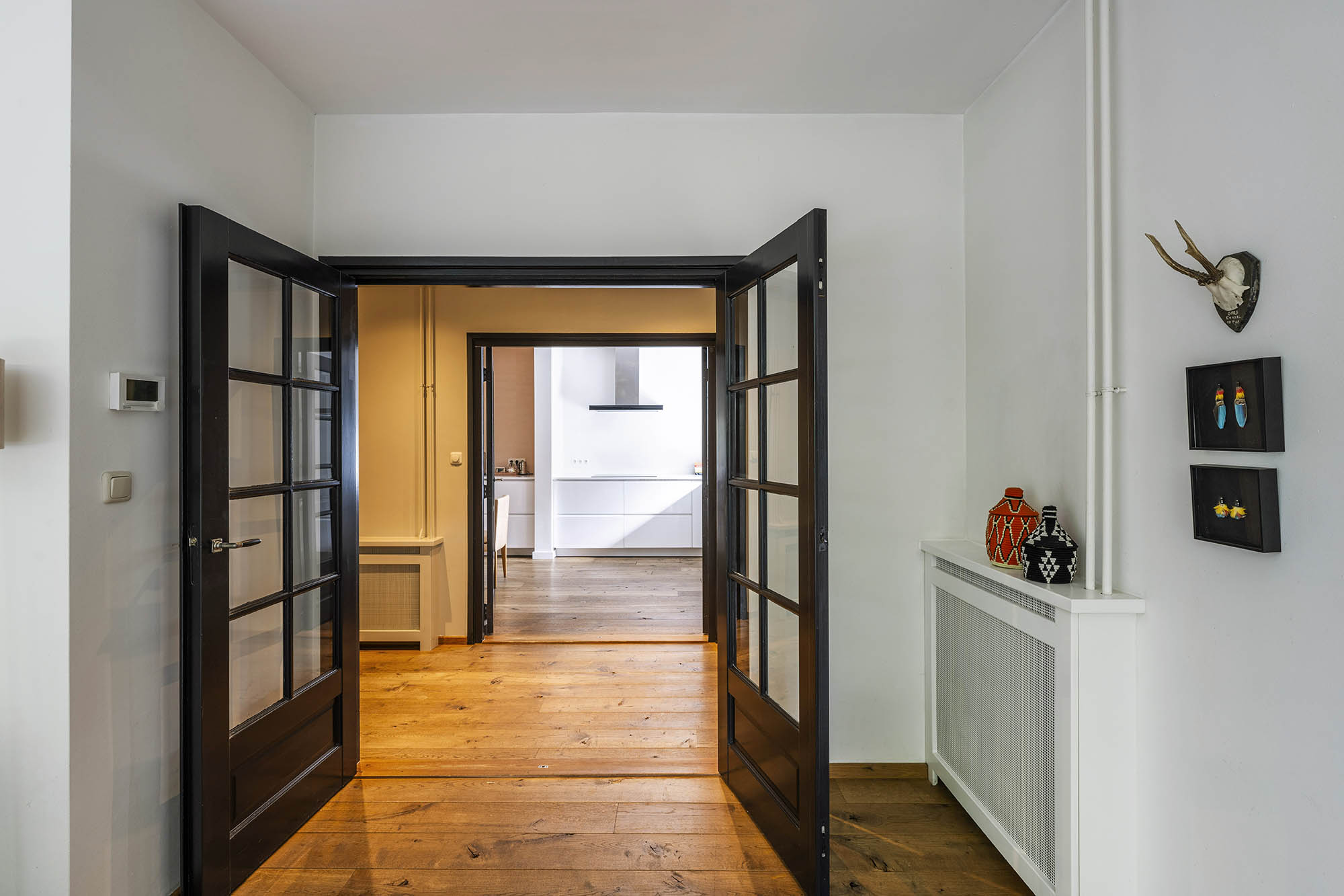 Das Familienhaus in Laren liegt ruhig hinter der Fassade eines reetgedeckten Bauernhauses, das nur über einen diskreten Kiesweg erreichbar ist. Diese abgeschiedene Lage bietet eine ausgewogene Kombination aus Privatsphäre und Komfort mit großzügigen Parkmöglichkeiten auf dem Grundstück sowie Zugang zum Ortszentrum. Schon beim Betreten des Hauses verspürt man ein Raumgefühl, das an diesem Standort selten zu finden ist. Das Wohnzimmer erstreckt sich über die gesamte Breite des Hauses und empfängt dank französischer Türen viel Licht, was einen fließenden Übergang in den sonnigen Garten mit Schatten spendenden Platanen schafft. Ein Kamin bildet den Mittelpunkt des Raumes, während eine separate Arbeitsecke Funktionalität und Wohnkomfort ergänzt. Die moderne, hochwertig ausgestattete Wohnküche sowie das separate Fernsehzimmer tragen zu einem entspannten Alltag bei. Im Obergeschoss sind drei Schlafzimmer durchdacht angeordnet, darunter ein Raum, der für die Wäsche genutzt wird. Das elegante Badezimmer ist mit Badewanne, Waschtisch und WC ausgestattet. Eine feste Treppe führt ins oberste Geschoss, wo sich die Master Suite mit maßgefertigtem Schrank und eigenem Bad als privater Rückzugsort präsentiert. Flexibilität ist das Herzstück dieser Immobilie: Der großzügige Grundriss erlaubt Schlafmöglichkeiten im Erdgeschoss und macht das Haus generationenübergreifend nutzbar. Das Haus umfasst 157 m² Wohnfläche auf einem 310 m² großen Grundstück sowie natürliche Belüftung, gedämmte Dächer und Böden, teilweise doppelt verglaste Fenster und Komfort der Energieklasse C. Alle Annehmlichkeiten des Ortes sind schnell erreichbar, während Wald und offene Landschaft nur eine kurze Radtour entfernt liegen. Für alle, die ein vielseitiges und einladendes Zuhause im Herzen von Laren suchen, bietet dieses Familienhaus diskreten Charme und ruhigen Luxus.
