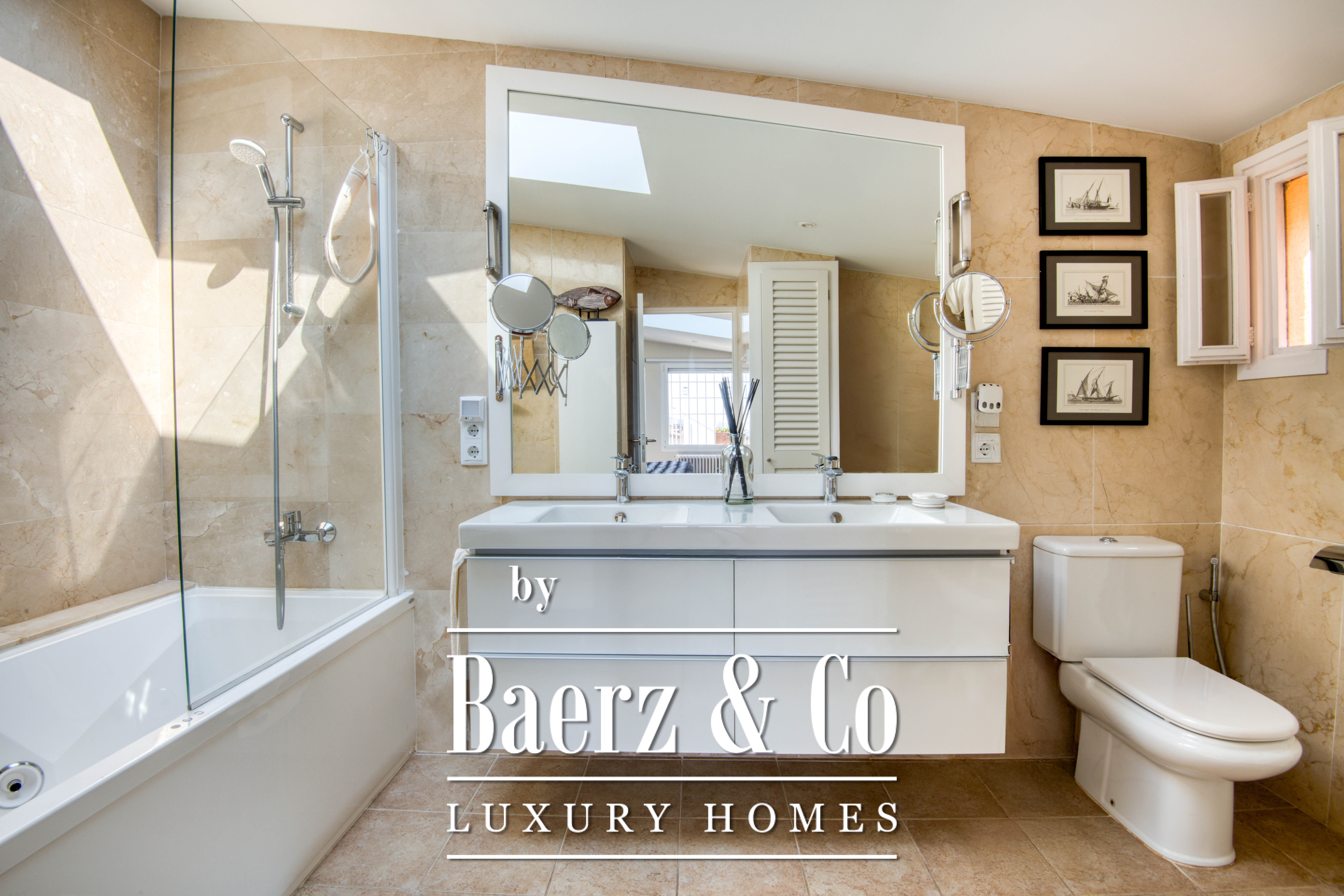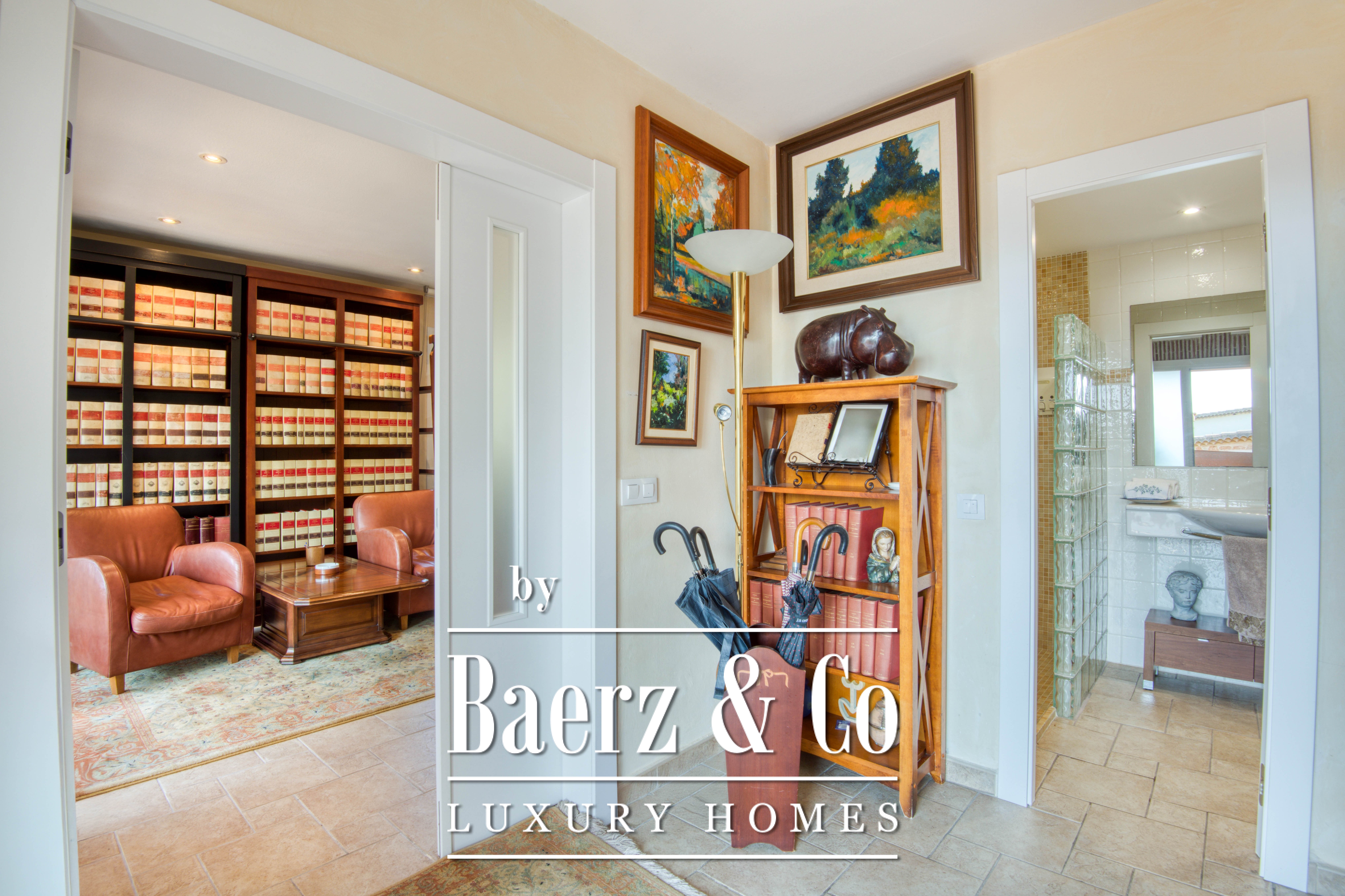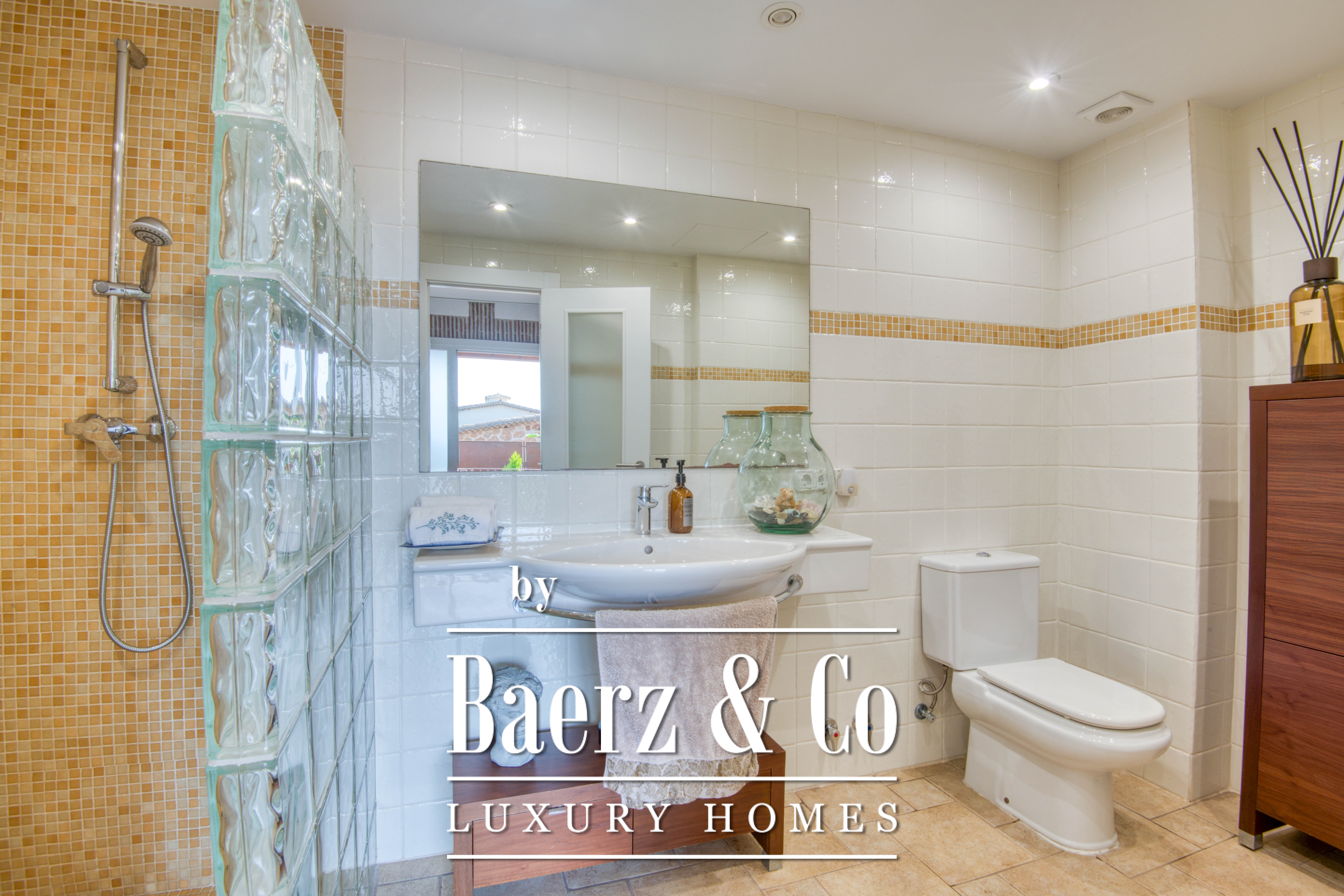 Im Obergeschoss teilen sich zwei Doppelschlafzimmer mit maßgefertigten Einbauschränken und ein komplett ausgestattetes Bad den Flur mit einer Hauptsuite. Diese Hauptsuite bietet einen begehbaren Kleiderschrank, ein eigenes Bad, einen Arbeitsbereich und exklusiven Zugang zu einer Terrasse, die einen weiten Blick über Platja d’Aro und die umliegende Landschaft eröffnet.