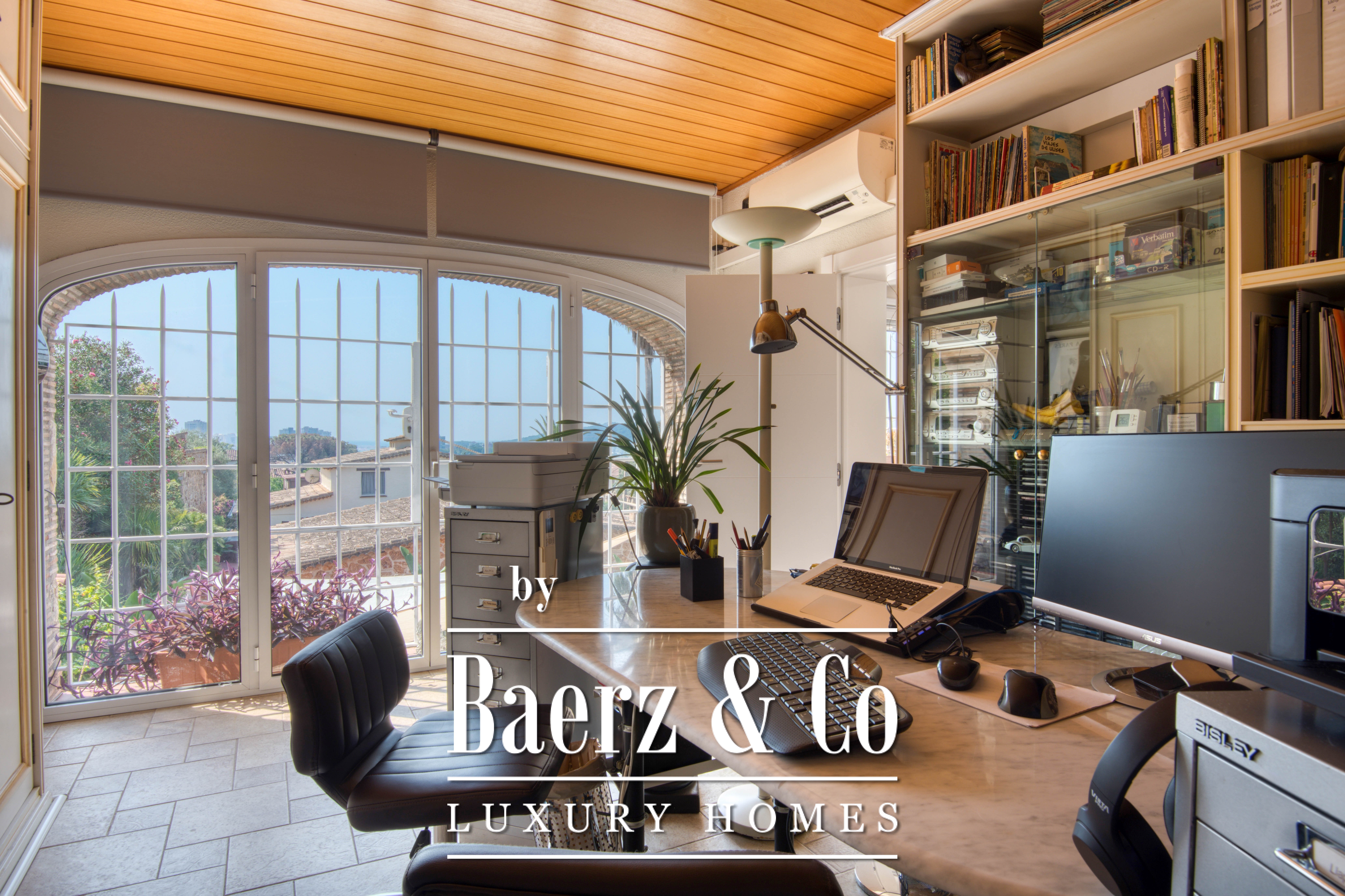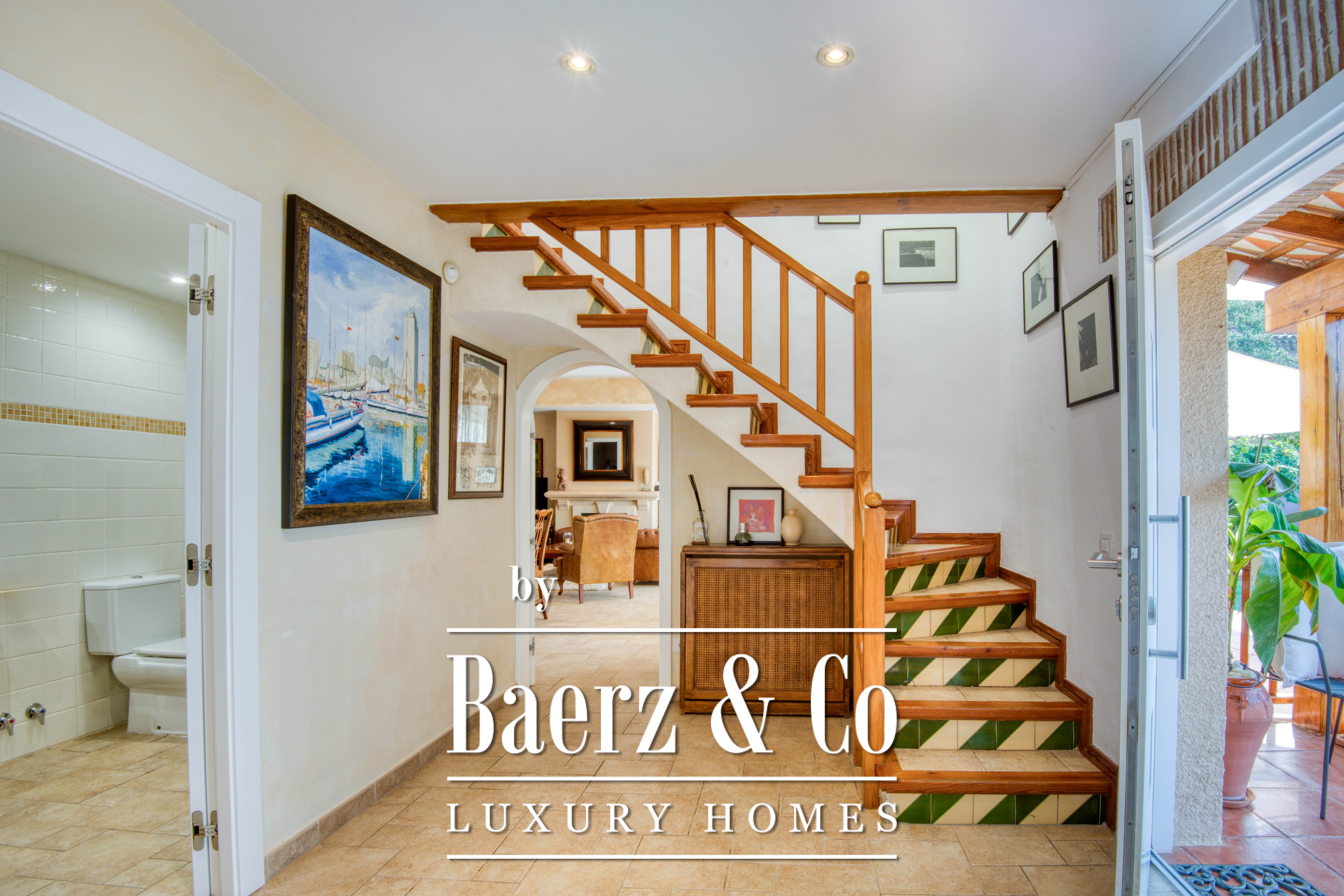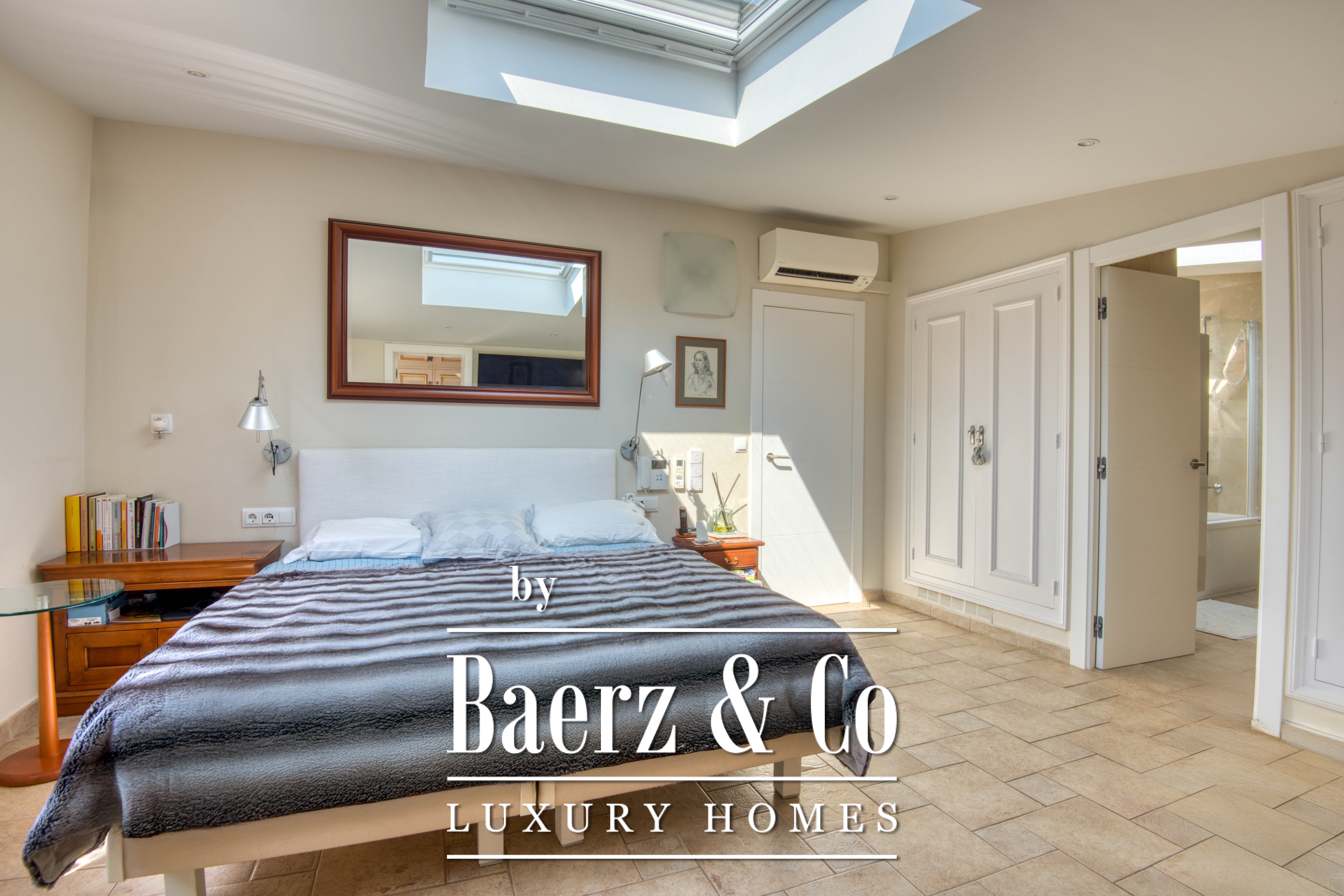 Im Obergeschoss teilen sich zwei Doppelschlafzimmer mit maßgefertigten Einbauschränken und ein komplett ausgestattetes Bad den Flur mit einer Hauptsuite. Diese Hauptsuite bietet einen begehbaren Kleiderschrank, ein eigenes Bad, einen Arbeitsbereich und exklusiven Zugang zu einer Terrasse, die einen weiten Blick über Platja d’Aro und die umliegende Landschaft eröffnet.
