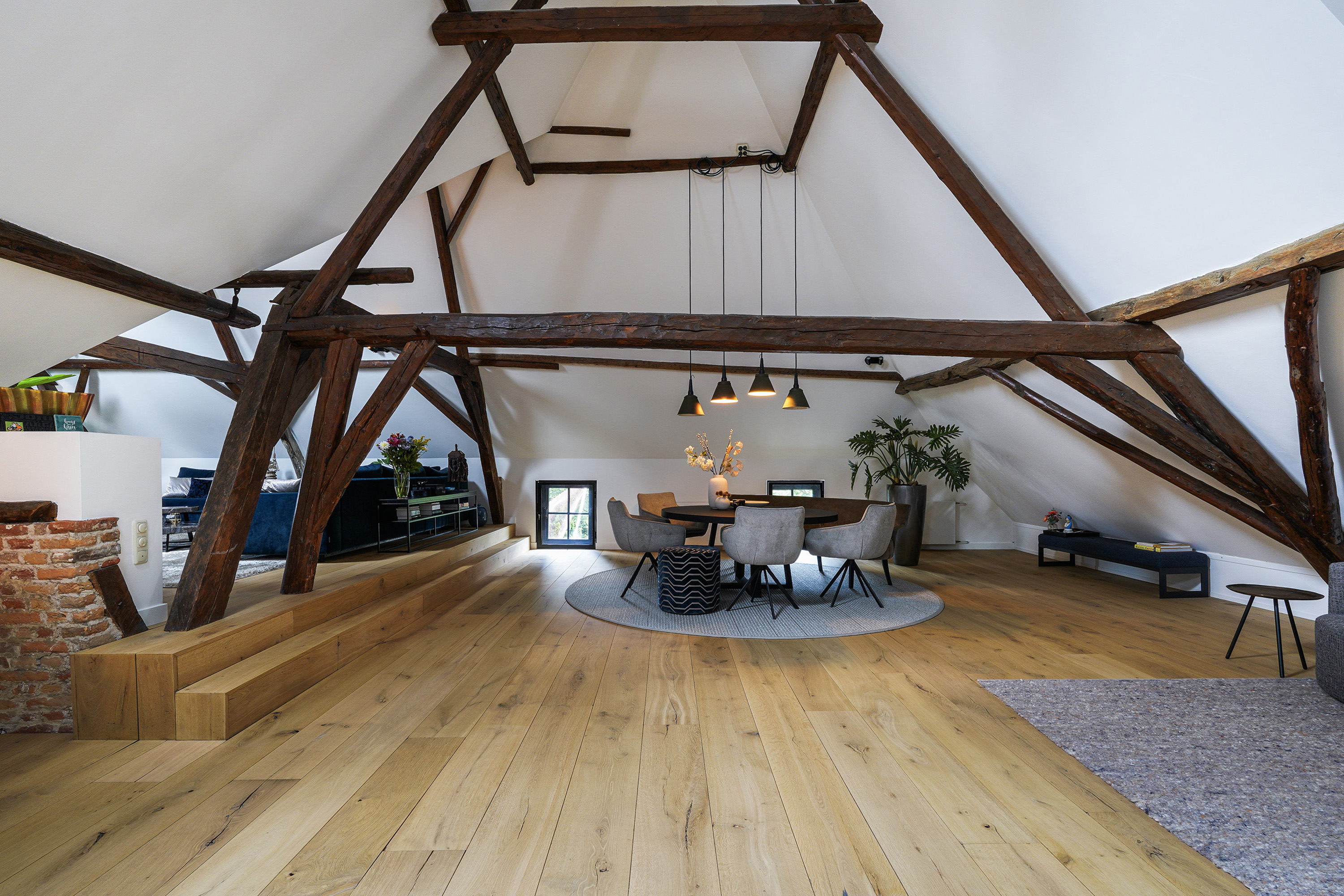 Sieben Schlafzimmer und vier Badezimmer sind durchdacht arrangiert, darunter drei eigenständige Suiten im Erdgeschoss, die derzeit erfolgreich als Bed & Breakfast genutzt werden, jede mit separatem Eingang und Bad. Das Haupthaus eignet sich ideal für Menschen, die Privatsphäre für Mehrgenerationenwohnen suchen oder das etablierte Gastgewerbe weiterführen möchten. Moderne Annehmlichkeiten wie fünf unabhängige Heizsysteme, feuerresistentes, isoliertes Reetdach, Doppelverglasung und Fußbodenheizung sind vorhanden. Die jüngsten Renovierungen respektieren zugleich den Charakter und den denkmalgeschützten Status des Anwesens.
