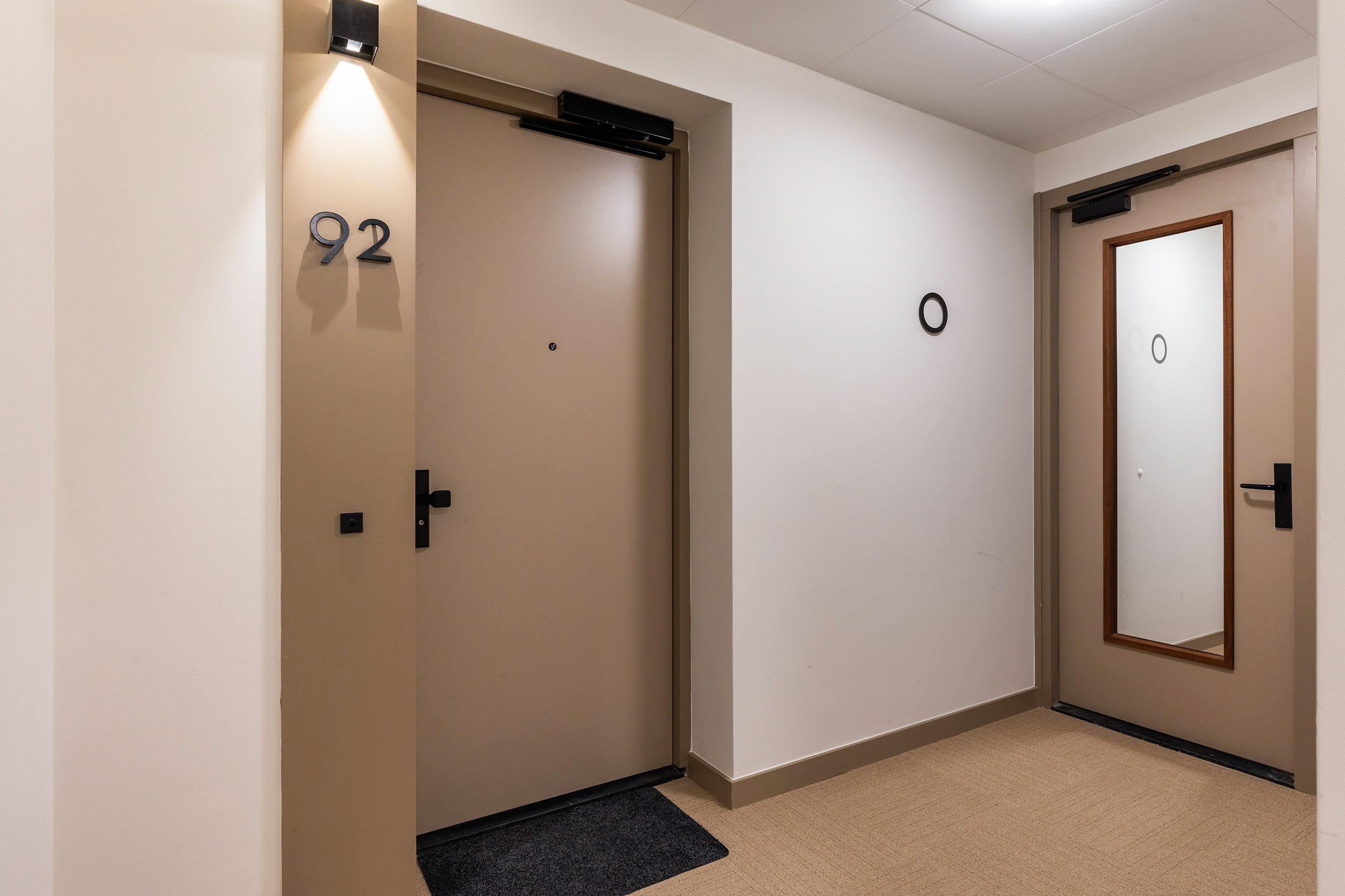 Two French doors open onto the sun terrace and private garden, ideal for morning coffee or summer evenings with friends. The garden borders the communal courtyard, offering a green and serene outdoor experience rarely found in an apartment setting.