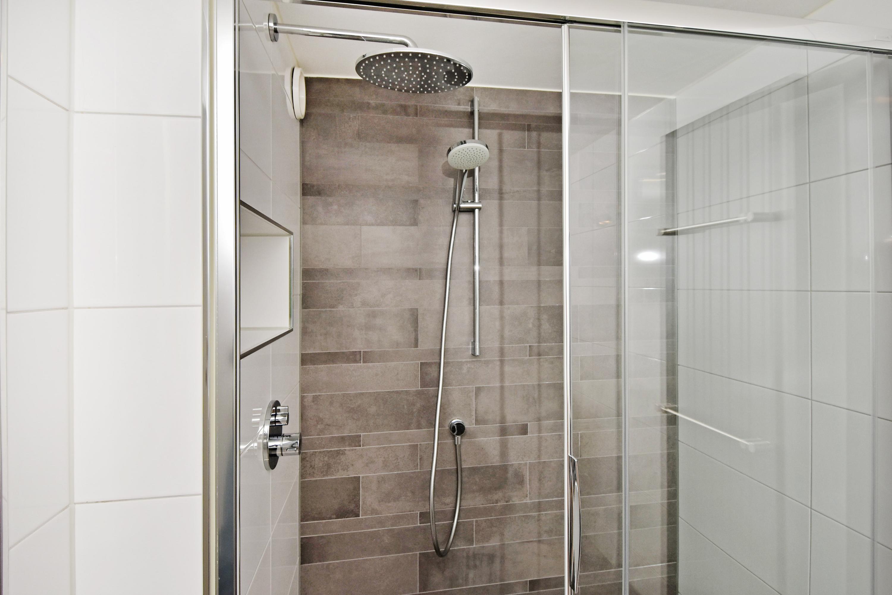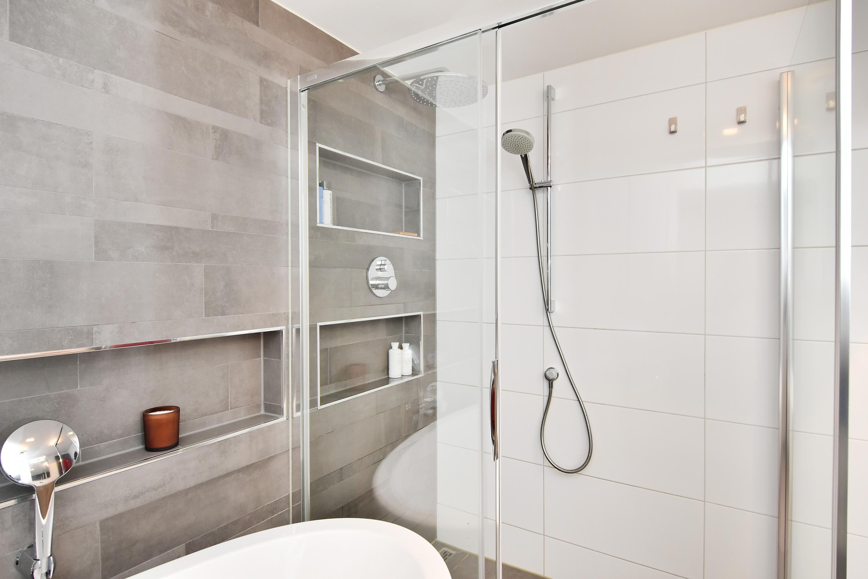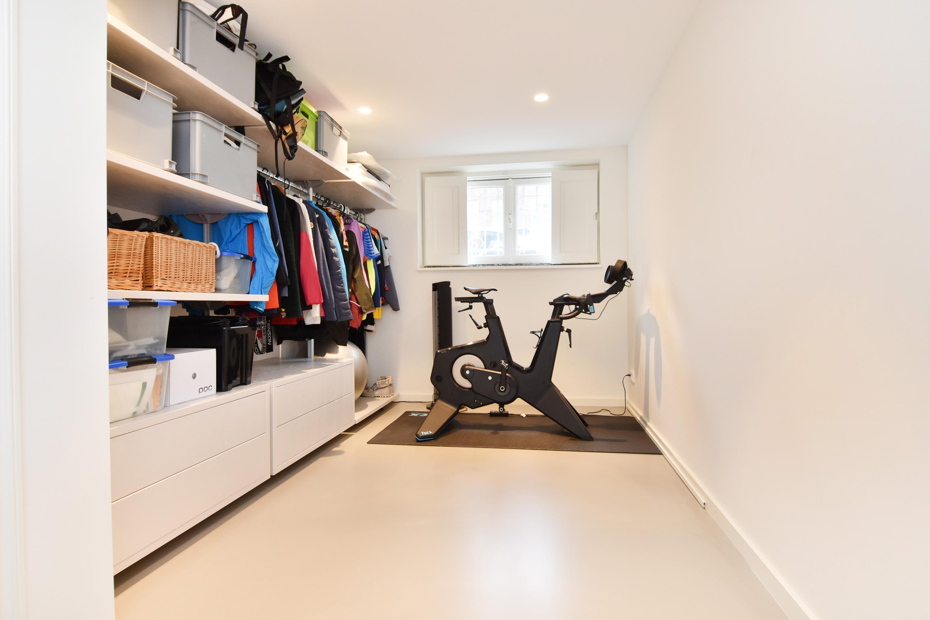 Past the front door is a hall with a modern guest lavatory and coat cupboard. This hallway leads to the expansive living room along with an interconnected dining area and open eat-in kitchen. The living area, which is above street level, is exceptionally bright thanks to the multiple nearly 4-metre-high windows that not only make the space feel even roomier, but also offer a clear vista. At the back is a balcony with stairs down to the south-facing garden with a storage shed and separate exterior entrance. There are also solar-powered awnings that can be operated from inside the apartment.