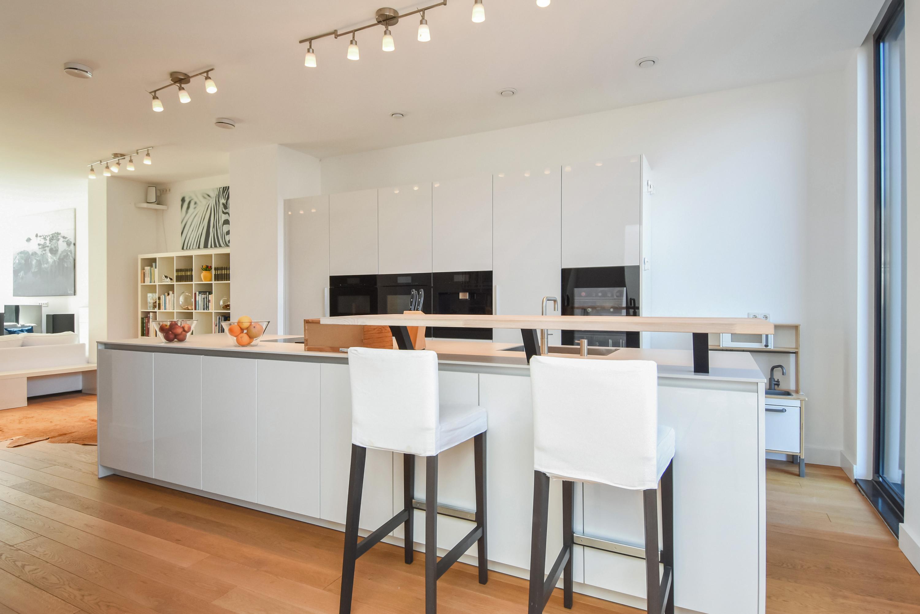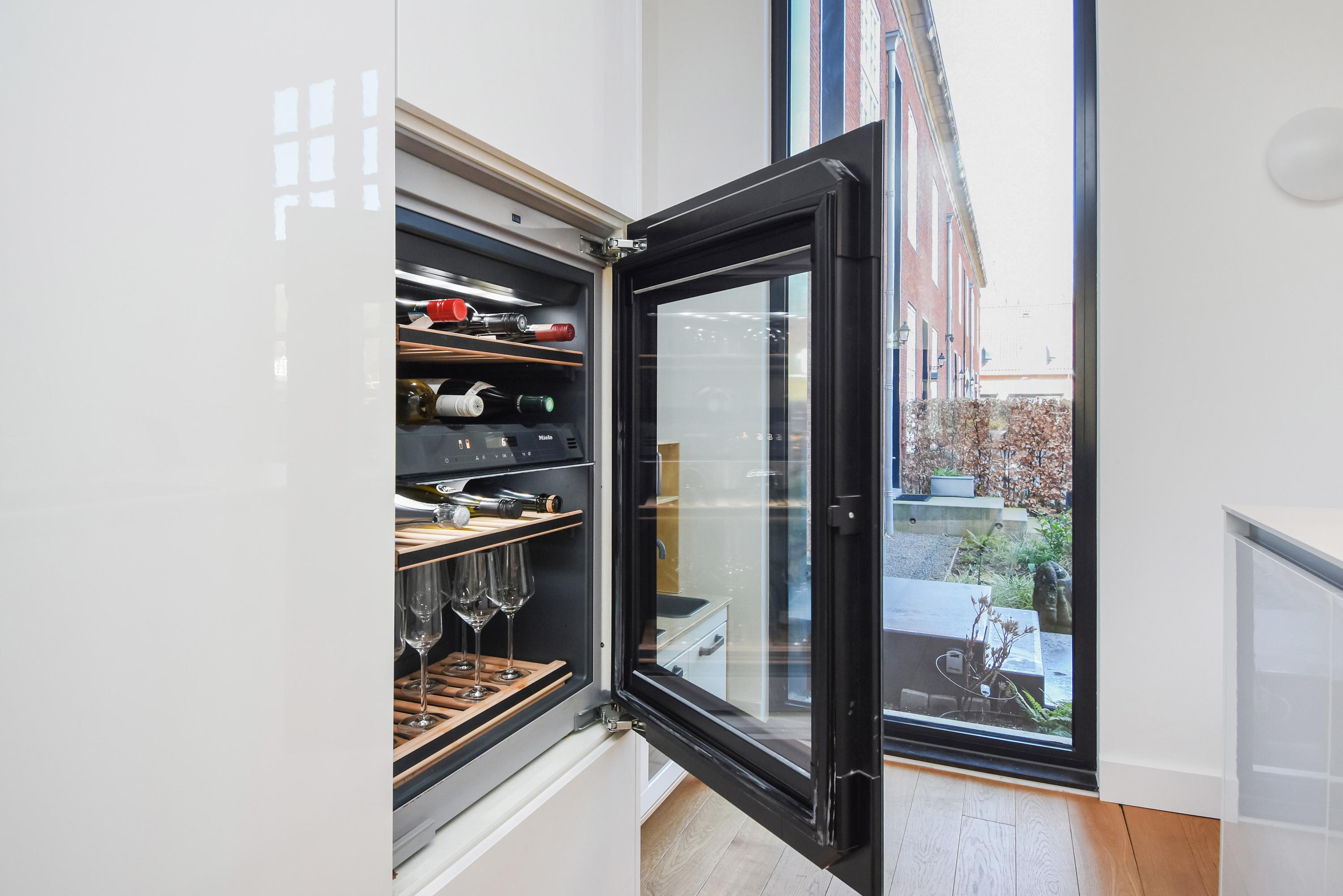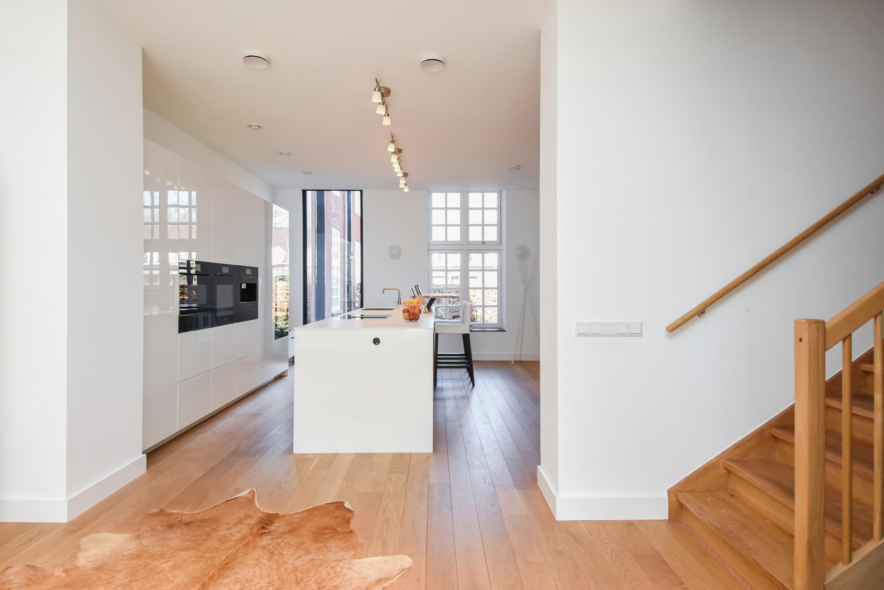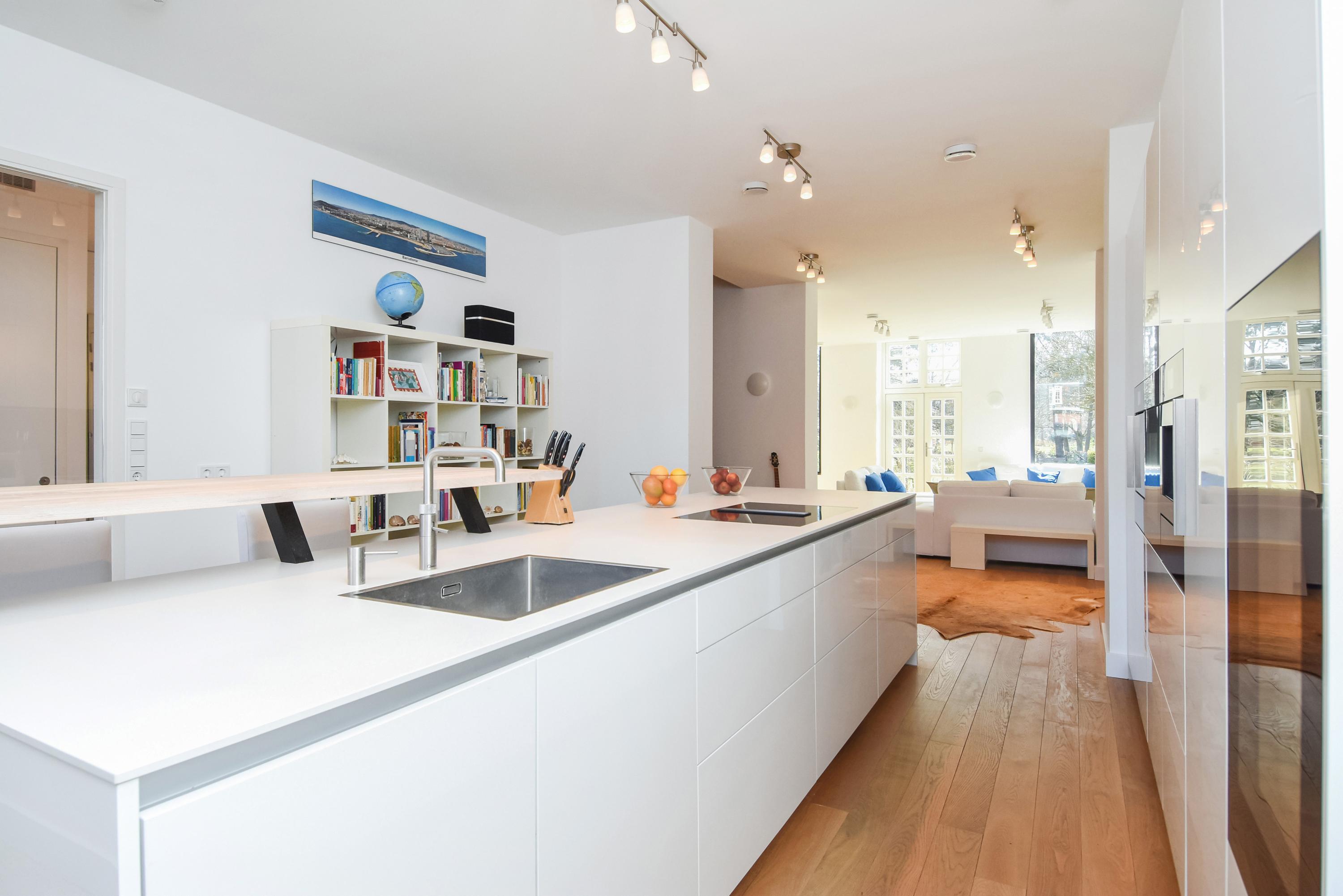 Upon entering the bright hallway, you are welcomed by a spacious, high-end designer kitchen featuring a central cooking island, premium Miele appliances, and every conceivable luxury – including a built-in climate cabinet for your wine. From the kitchen, you reach the sunny living room, where high ceilings and large windows flood the space with natural light. Elegant double doors open onto the spacious, sunny garden, perfect for relaxation and outdoor living.