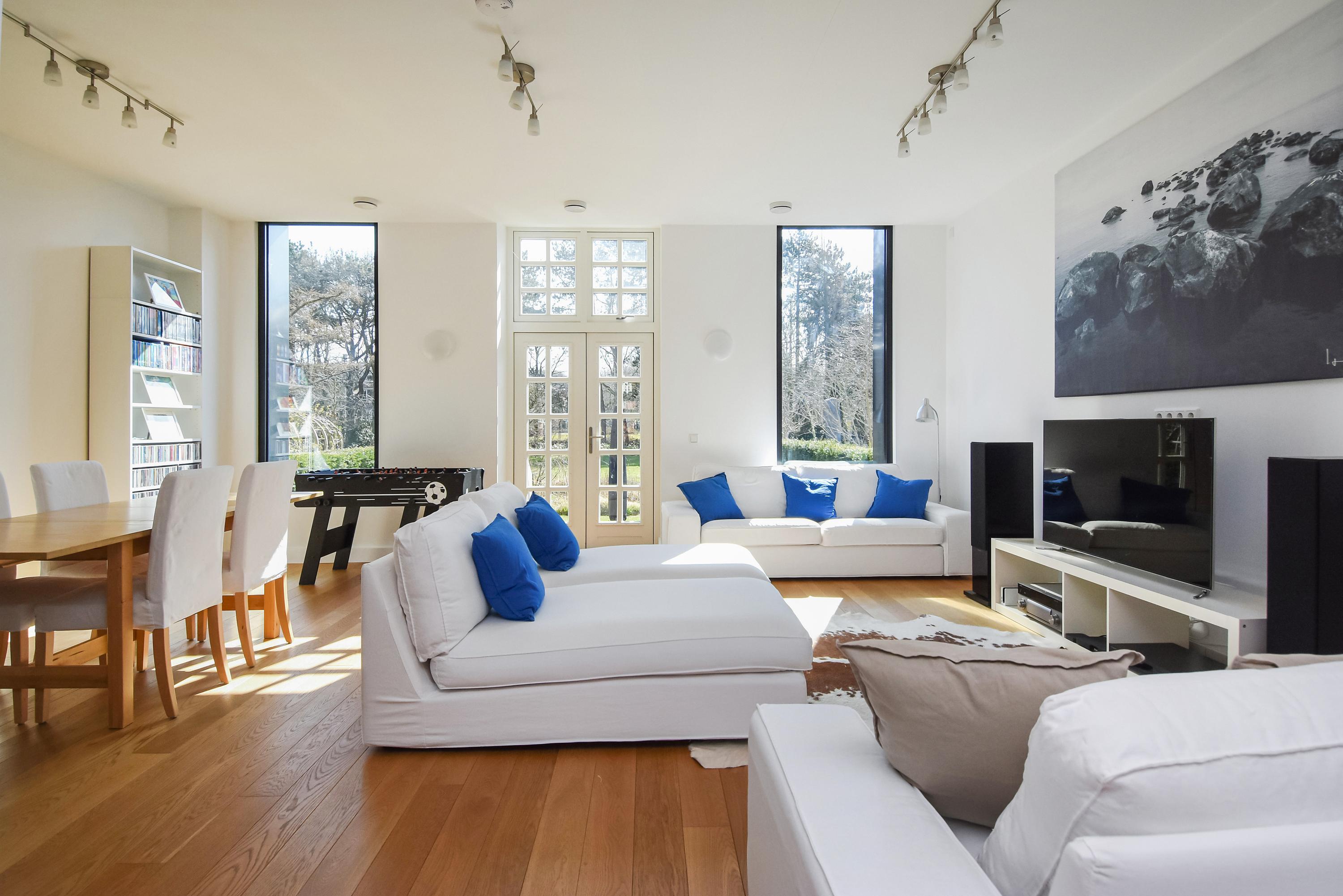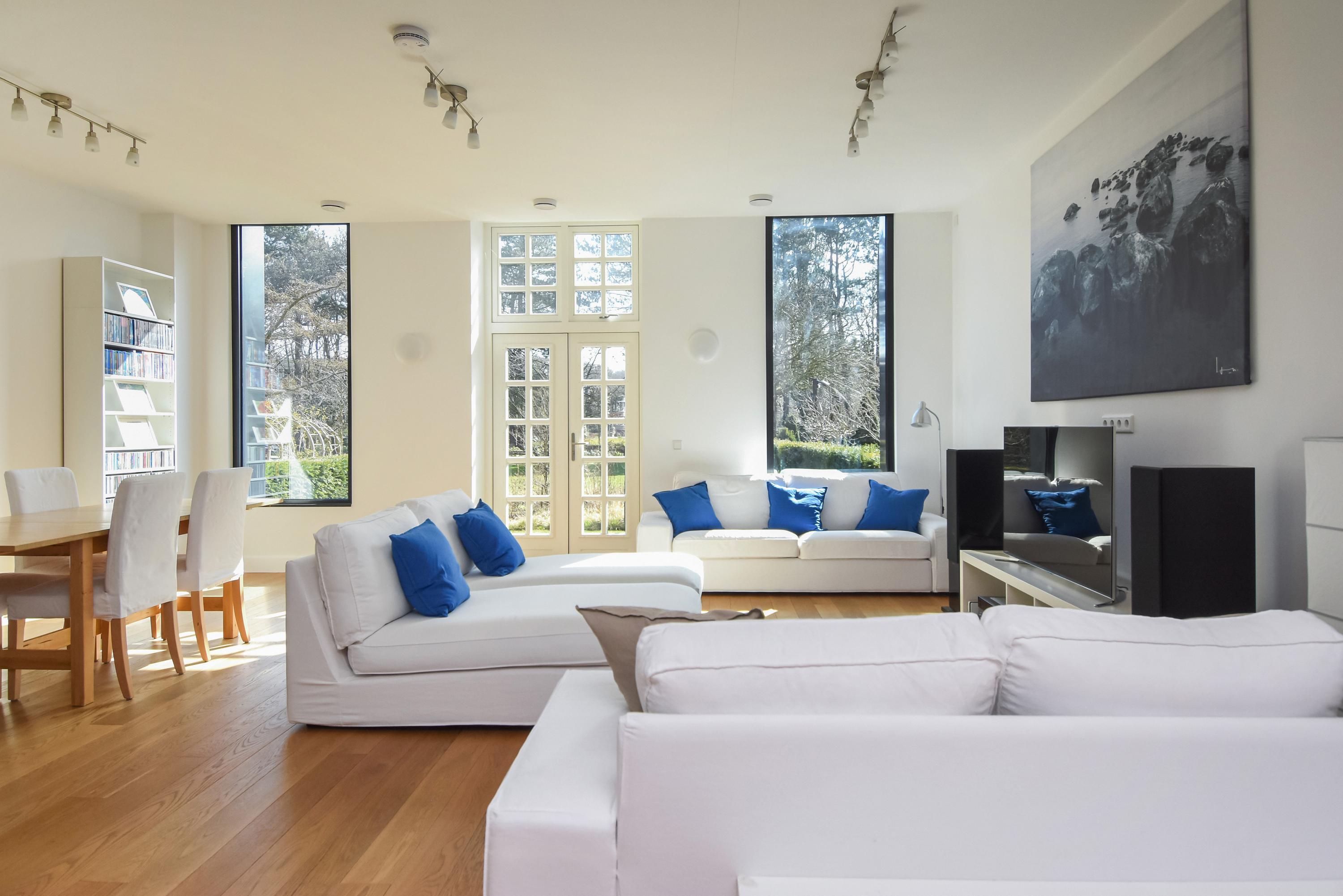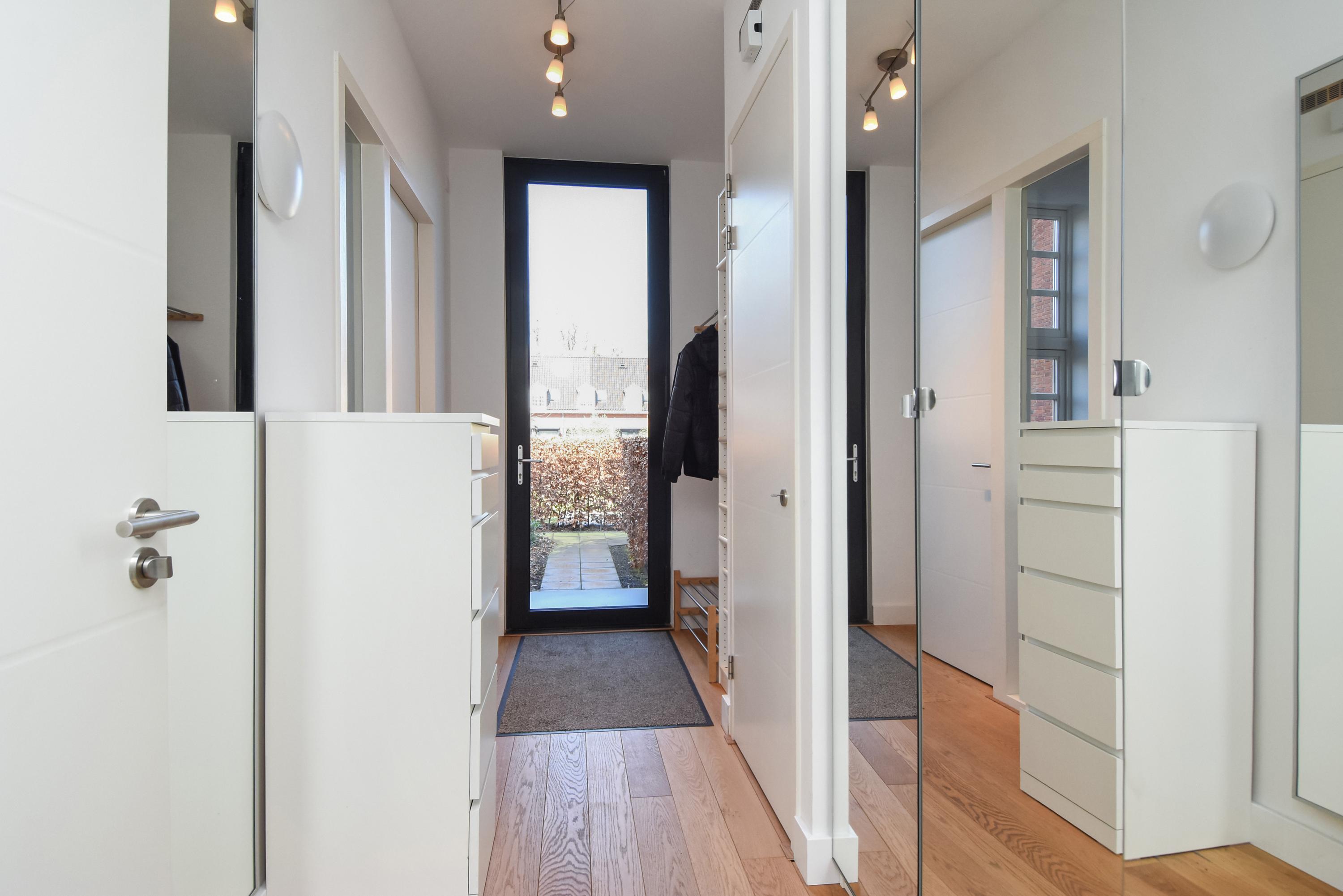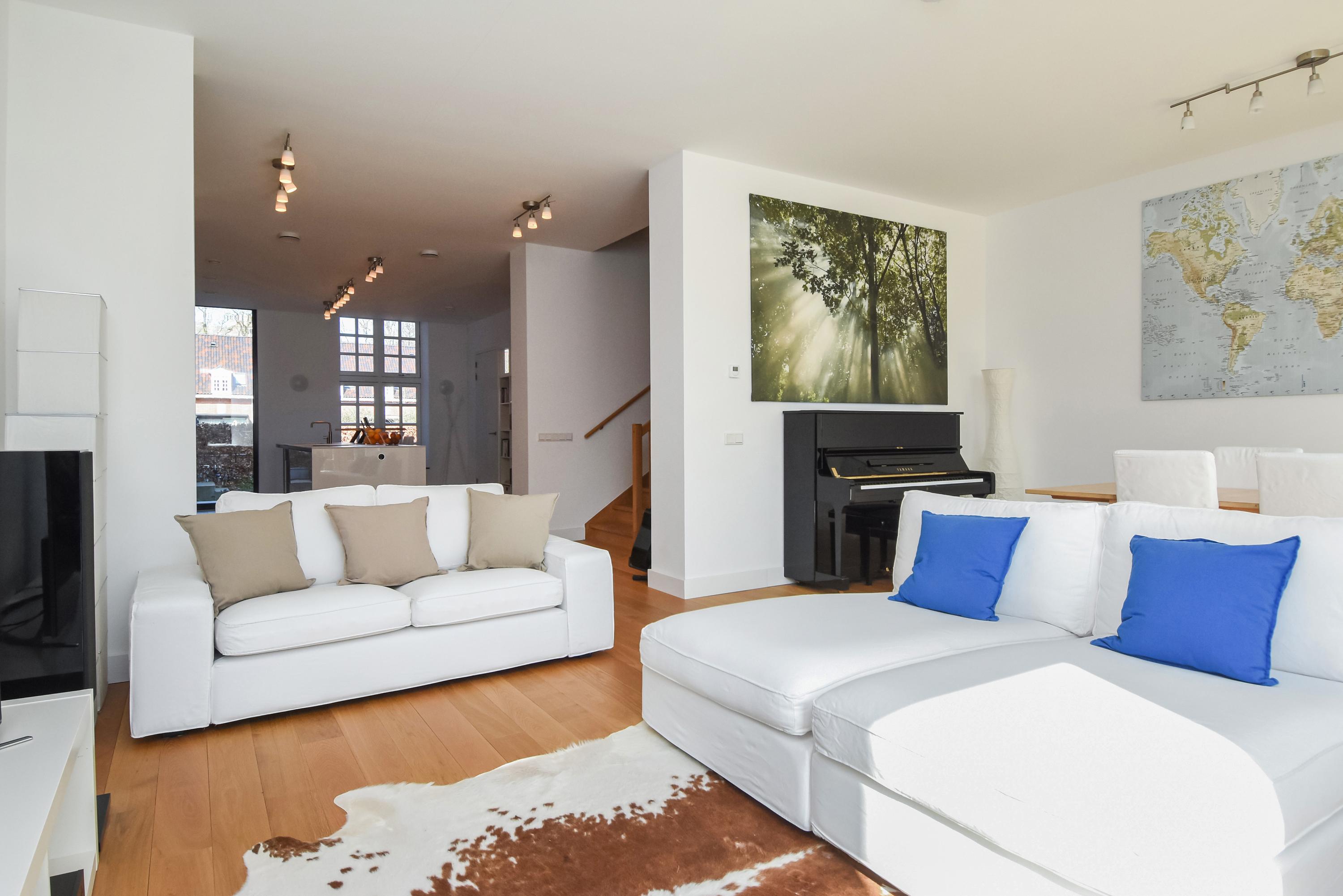 Upon entering the bright hallway, you are welcomed by a spacious, high-end designer kitchen featuring a central cooking island, premium Miele appliances, and every conceivable luxury – including a built-in climate cabinet for your wine. From the kitchen, you reach the sunny living room, where high ceilings and large windows flood the space with natural light. Elegant double doors open onto the spacious, sunny garden, perfect for relaxation and outdoor living.