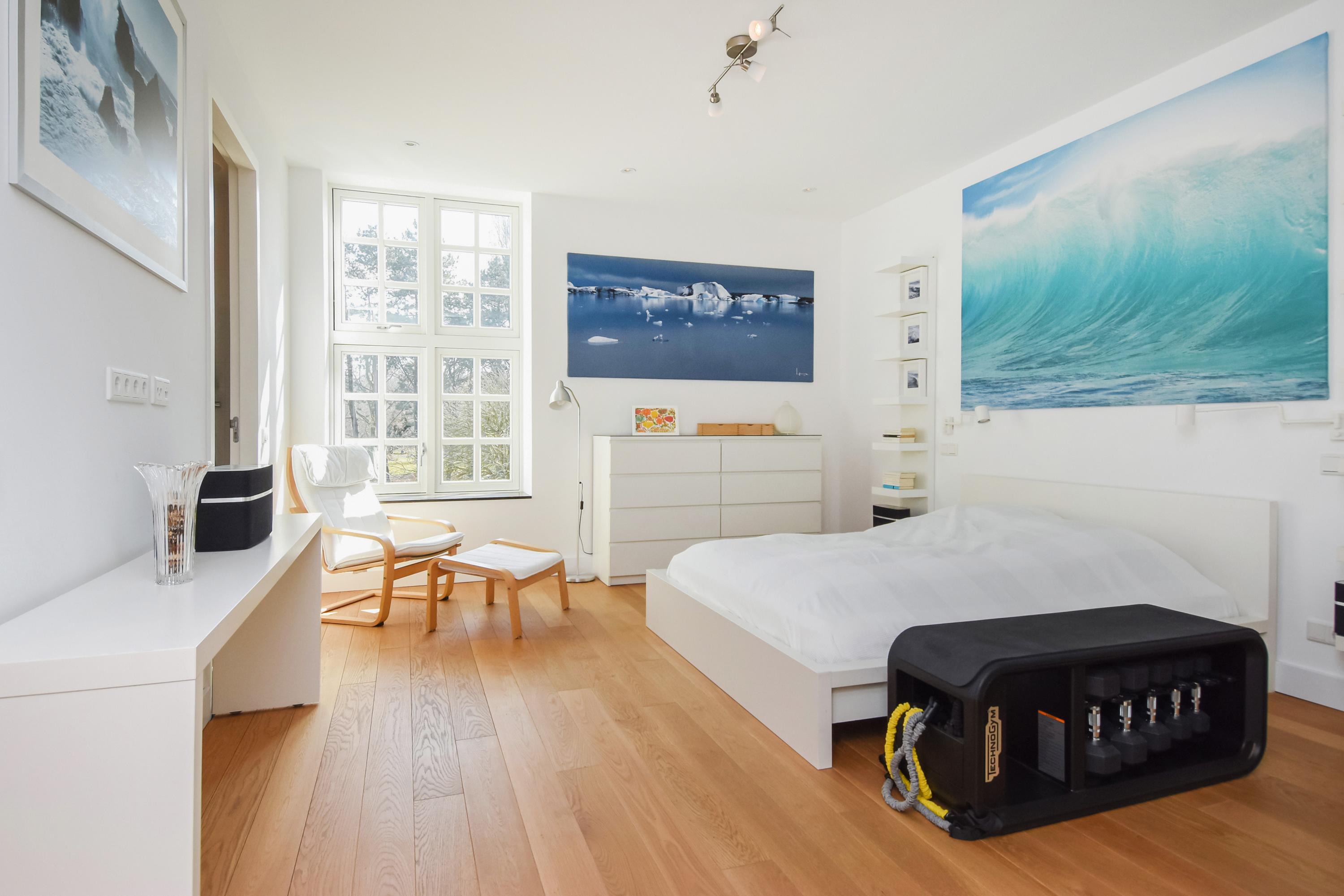 The first floor houses three spacious bedrooms and two luxurious bathrooms. The master bedroom of approximately 20 m² includes a generous walk-in closet and a private en-suite bathroom, equipped with a walk-in shower, bathtub, double washbasin and toilet.