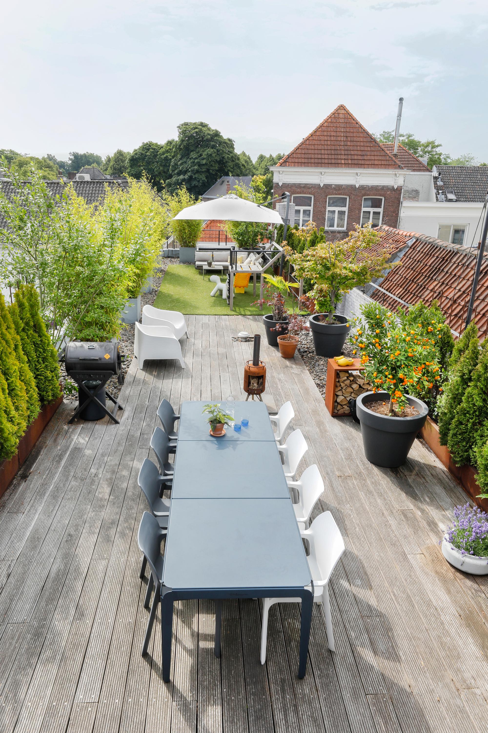 You've probably noticed this unique building while strolling along Vughterstraat. You've probably also gazed in amazement at this enormous roof terrace. On "the roof of the city," you'll find a roof garden of approximately 113 m². Not only from this terrace, but also from the apartment itself, there are expansive views and abundant natural light. In addition to the large living room with open-plan kitchen, there are four bedrooms and, of course, a luxurious bathroom. Stepping out of the front door, you enter your own hallway, which easily accommodates four bicycles. A fully equipped, tasteful, and spacious apartment, complete with that exceptional roof terrace.