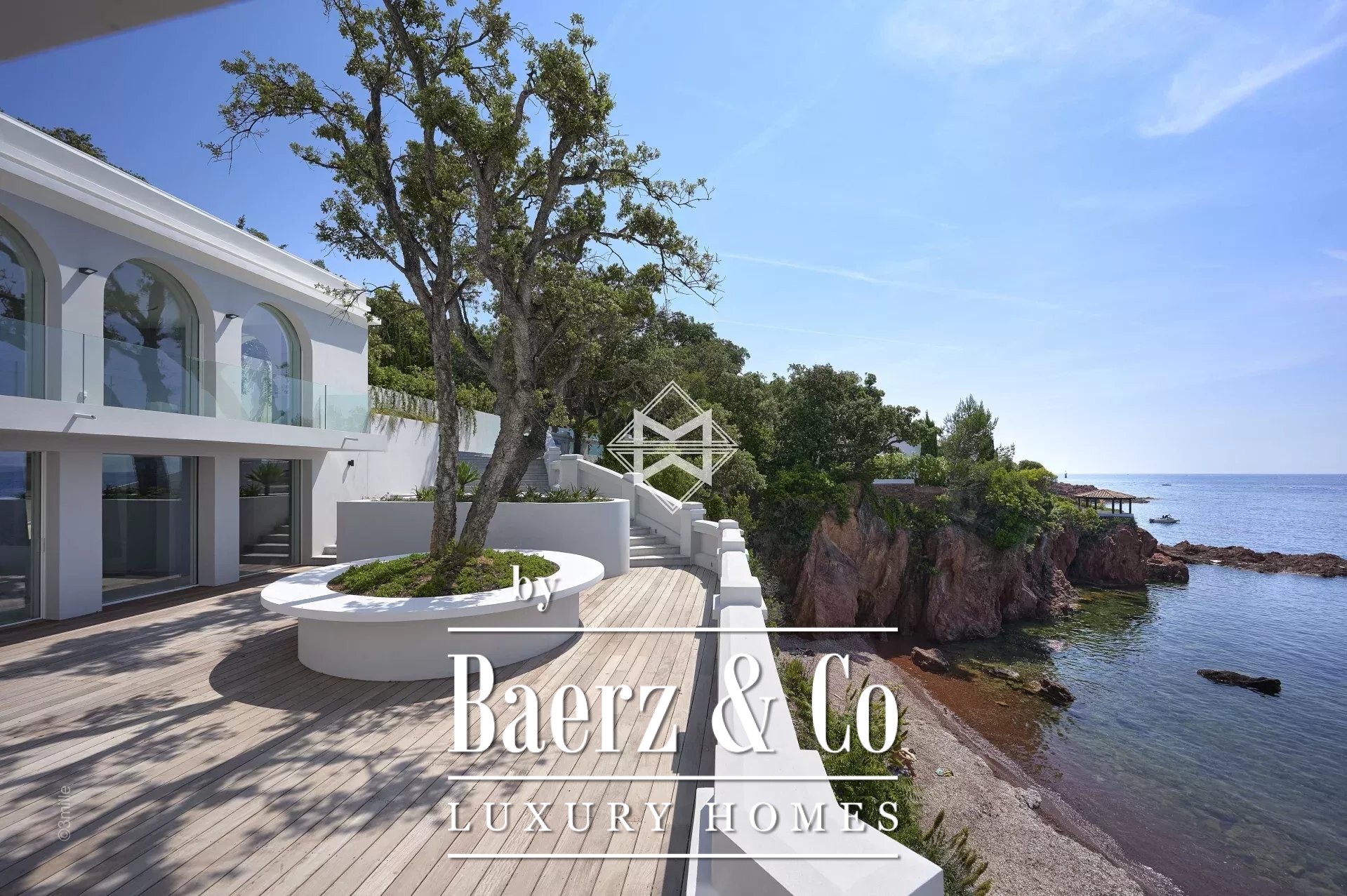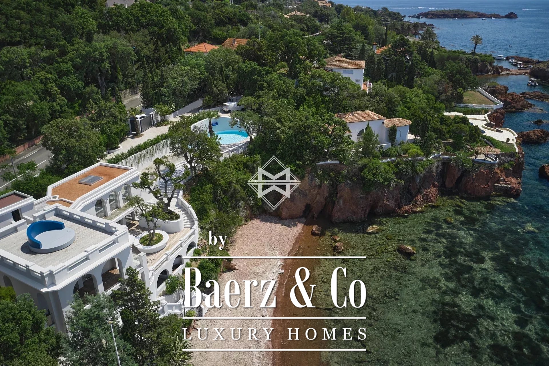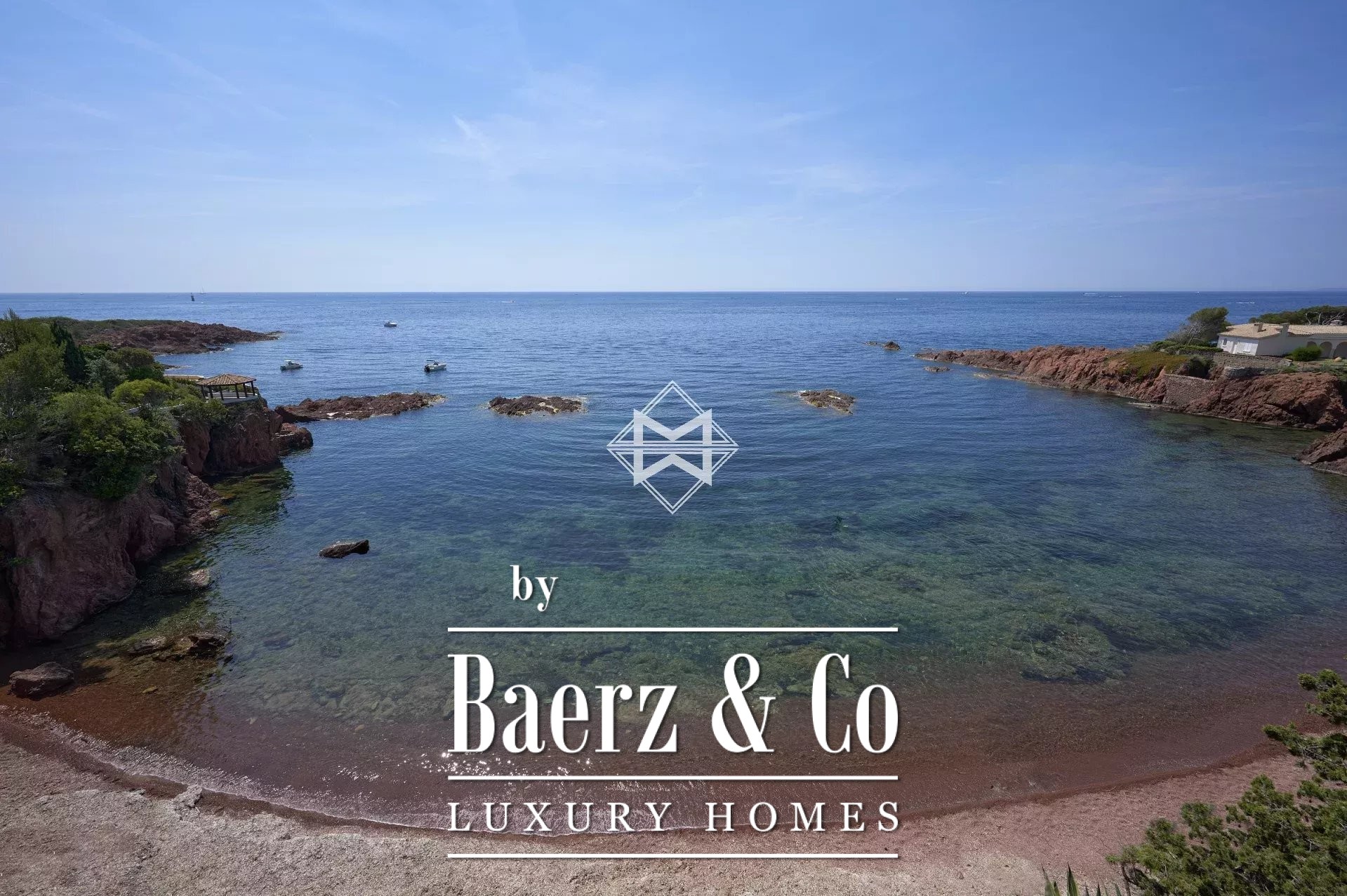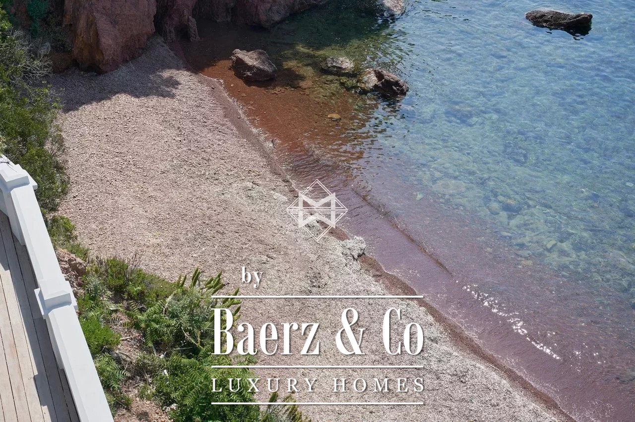 In a wild environment between Théoule-sur-Mer and Saint-Raphaël, the property offers a splendid linear view on the sea with the beach and the red rocks of the Esterel at its feet.