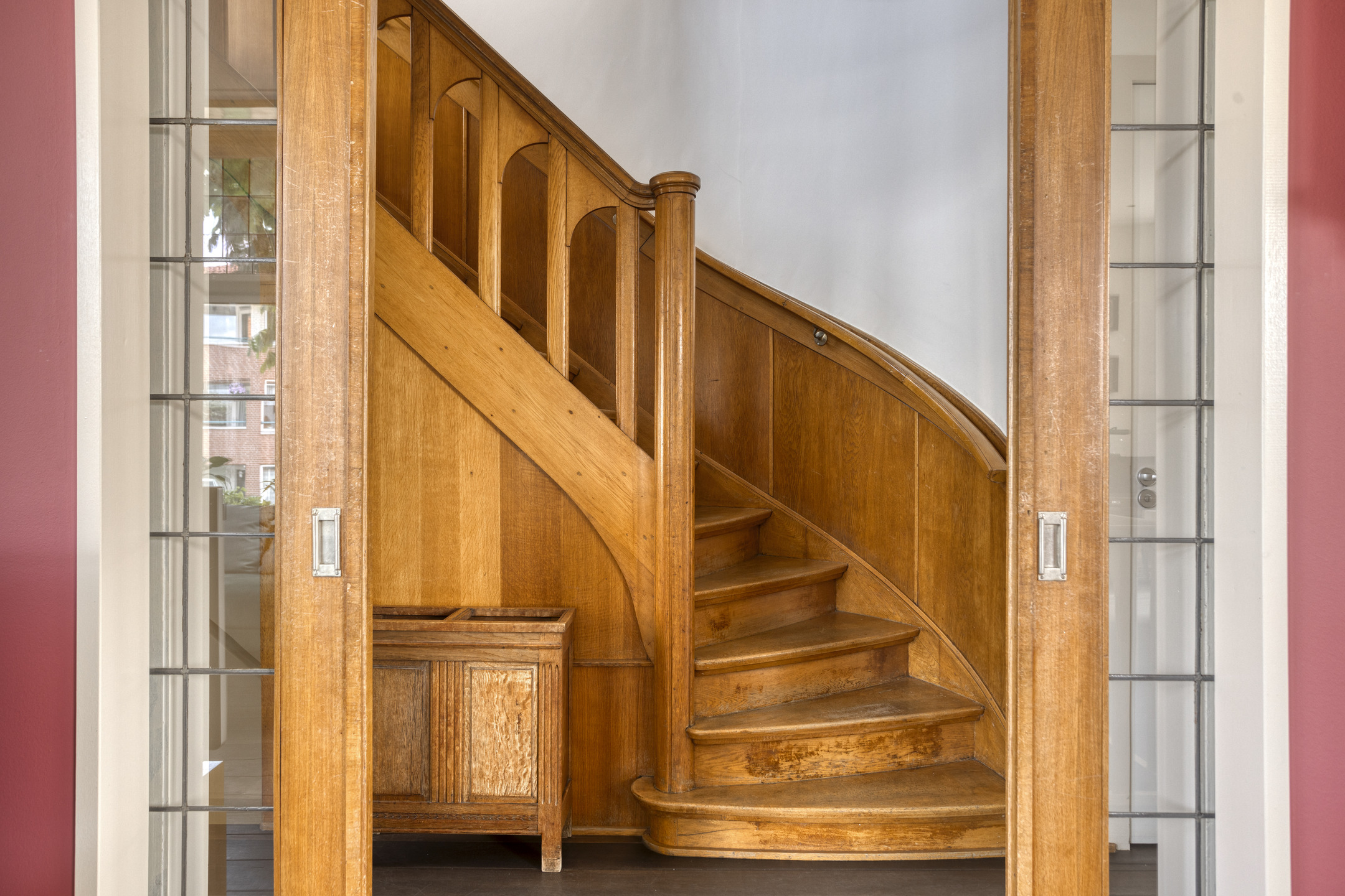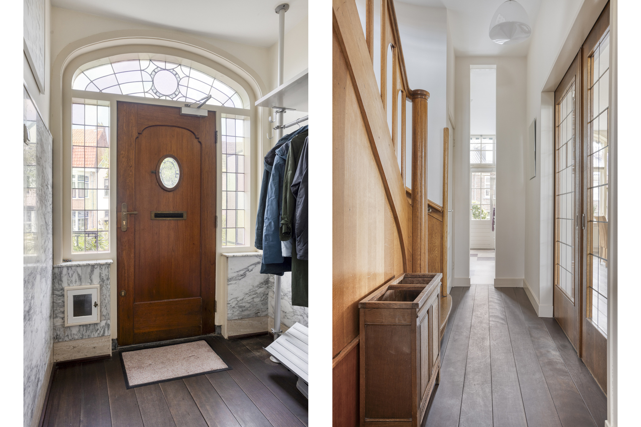 A staircase with the original balustrade leads to the entrance. You enter into the vestibule, where the original wall paneling immediately sets the historic tone of the home. The hallway provides access to a well-maintained guest toilet with washbasin and the main living areas. The living room is exceptionally spacious and features a beautiful Purpleheart wood floor, smooth plastered walls, and recessed ceiling lights. The characteristic bay window, open fireplace, high ceilings, and impressive stained glass windows add charm and grandeur to the space.