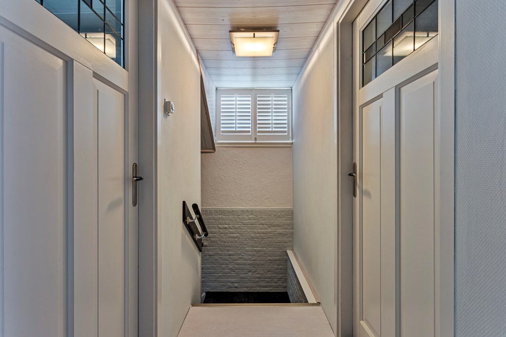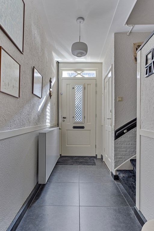 The house is entered from the street side. Along the side of the property is a private driveway with carport, ideal for parking a car or bicycles. Inside, you arrive in a spacious hallway, which provides access to the WC, stairs to the first floor, the basement, and the passage to the kitchen and living room.