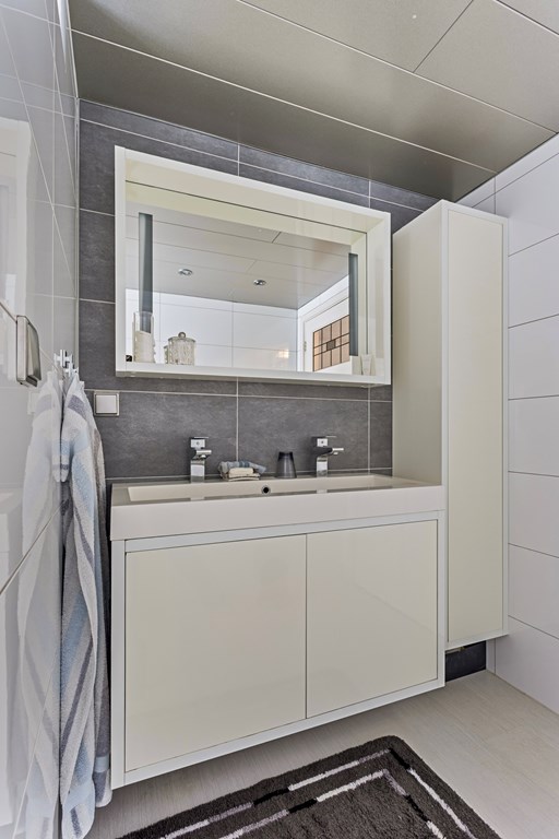 The bathroom, located off the hallway, is fully tiled, well maintained, and equipped with a bathtub with shower, a double washbasin with storage unit, and a mirror.