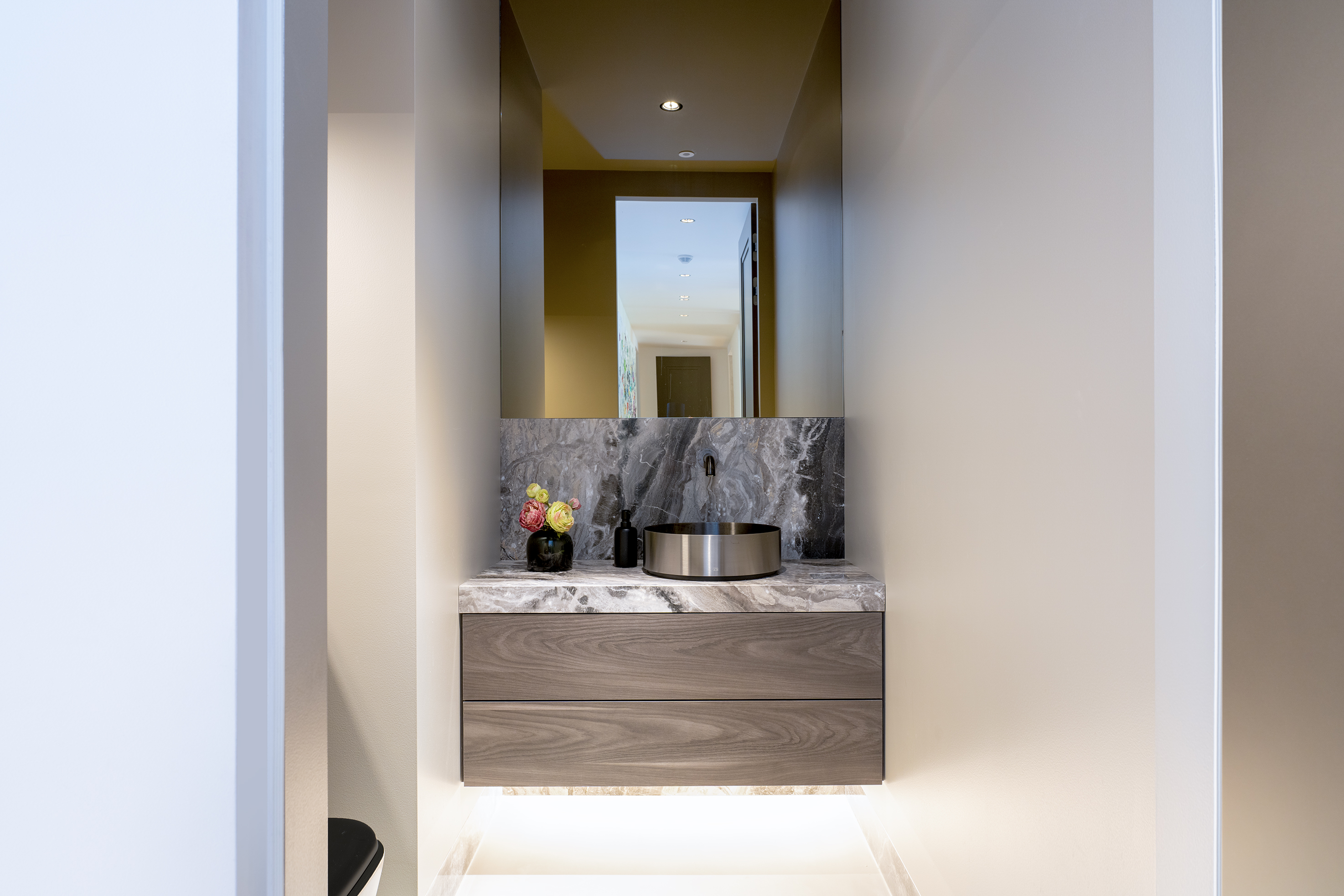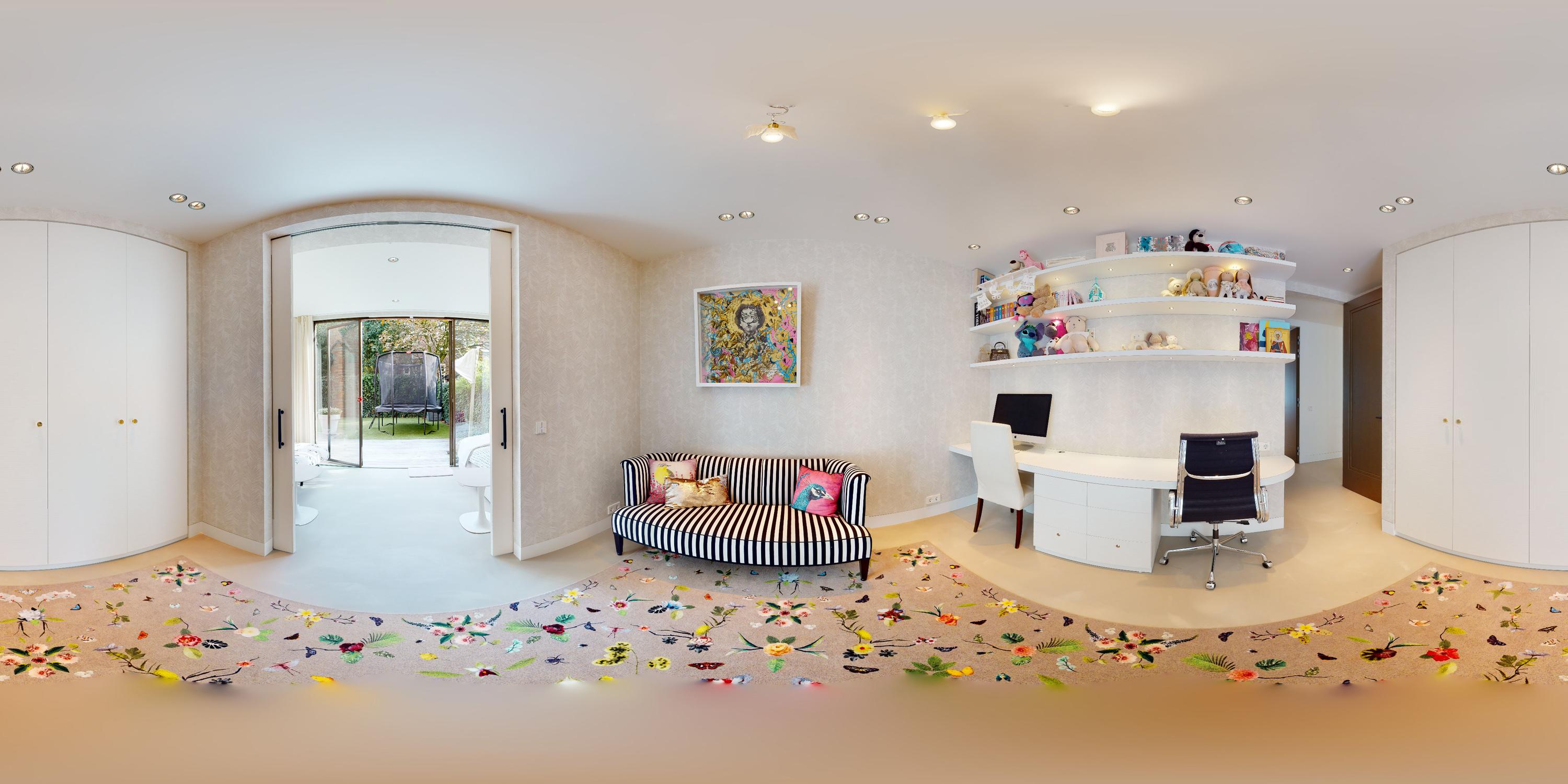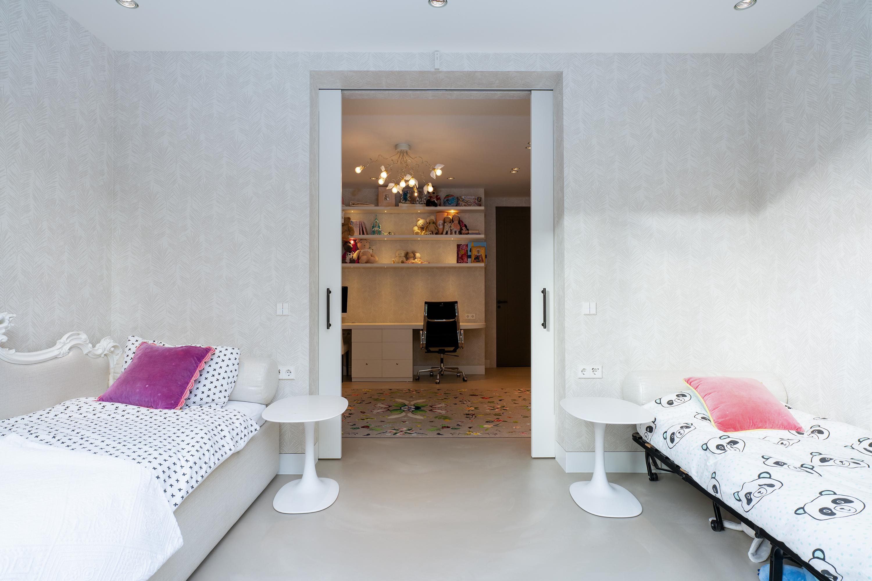 At the back of this floor, there is a large living space with a lovely, luxury kitchen, which really does come with everything you might expect: a sink island with a Quooker tap and also a cooler, oven, combi steam oven, hot plate, fridge, freezer, induction hob and built-in extractor unit. All the built-in appliances are by Gaggenau. The kitchen’s pièce de résistance is a special alcove with a pull-out unit for a coffee machine. Two attractive ethanol fireplaces separate the kitchen from the living-room area. The living space has been fitted with a number of built-in cupboards. The dining-room area, which is located in the extension, is next to the kitchen and the living-room area and comes complete with electric curtains. Skylights flood this space with light. A sliding door gives access to the large, south-east facing back garden.