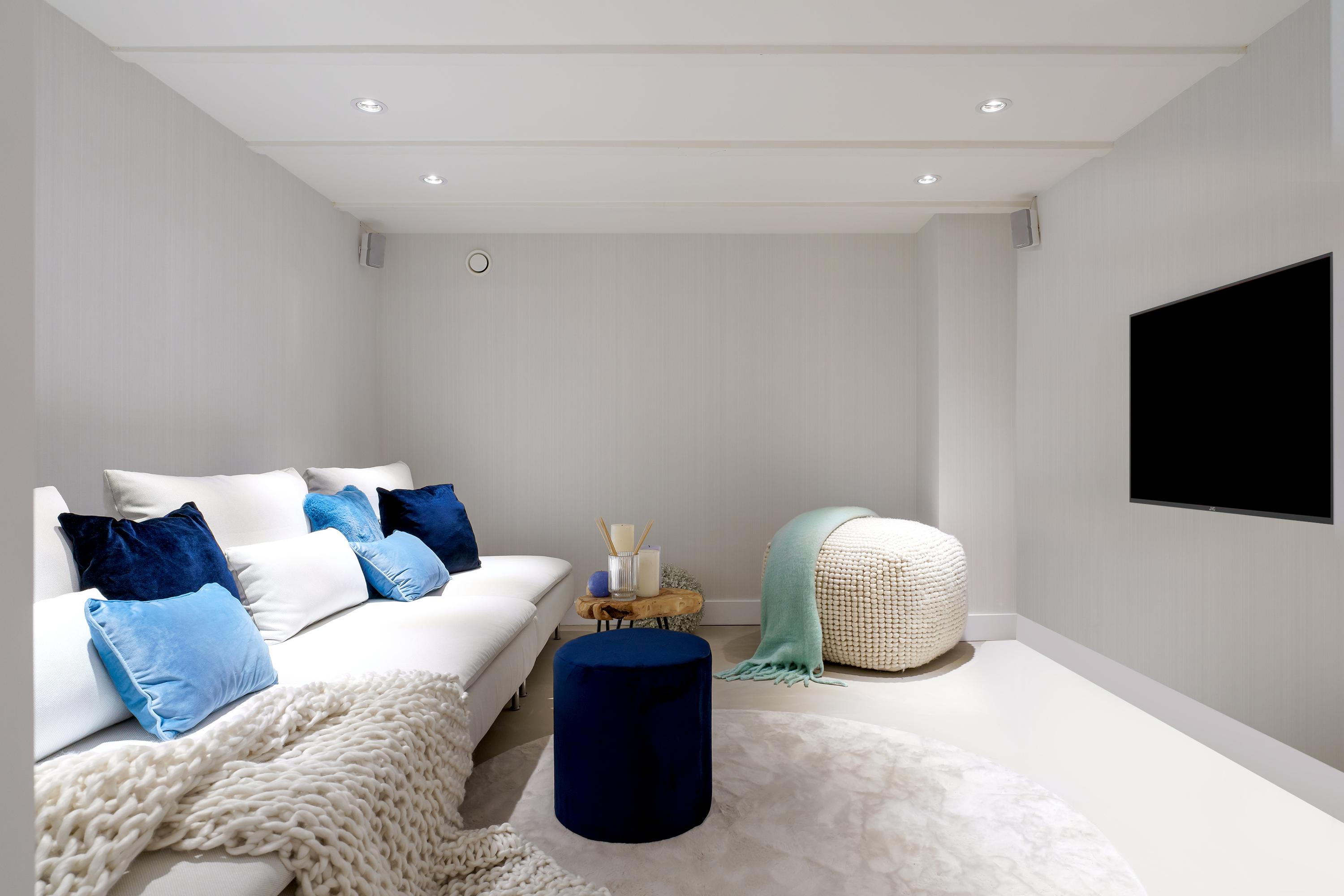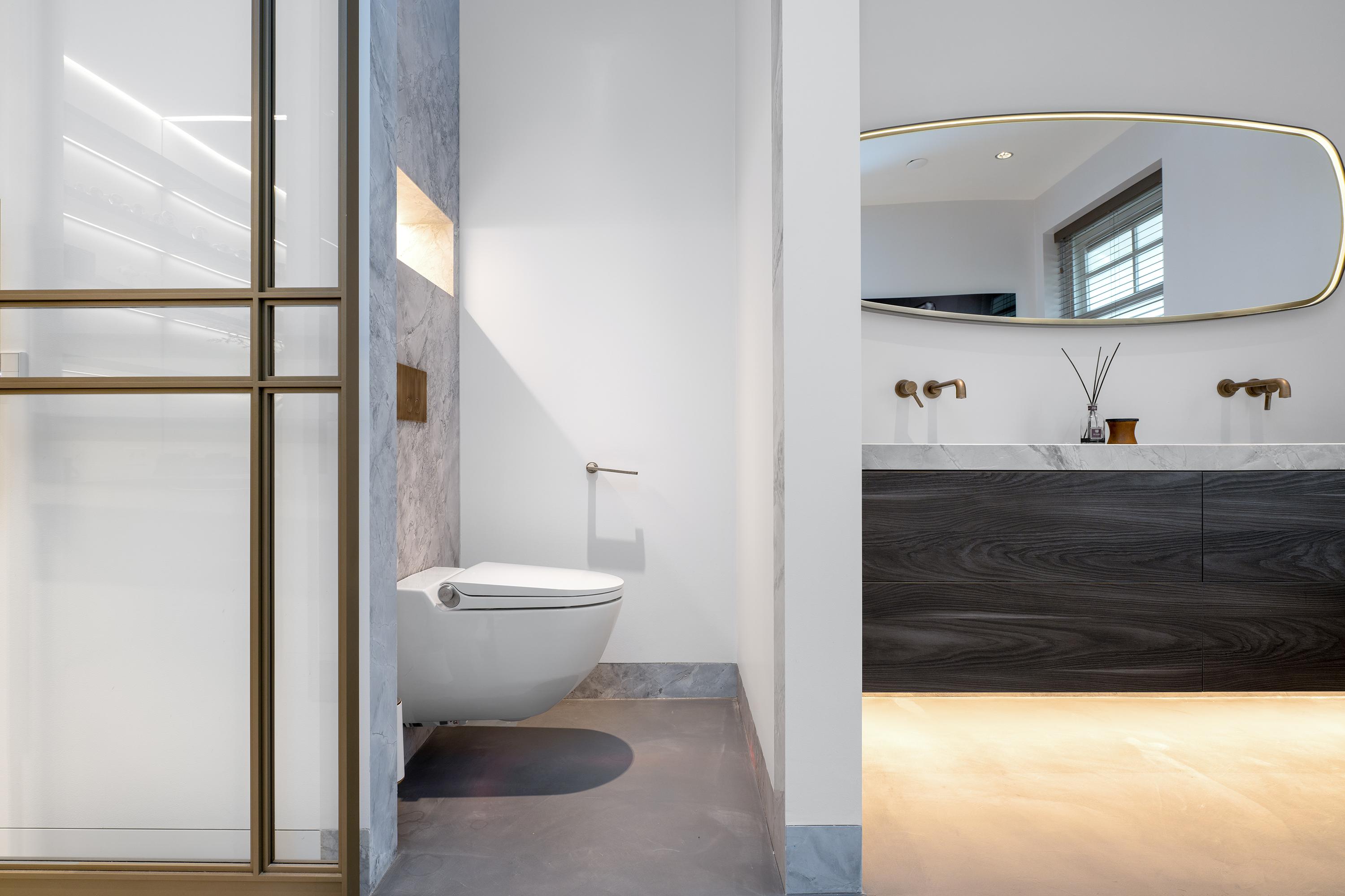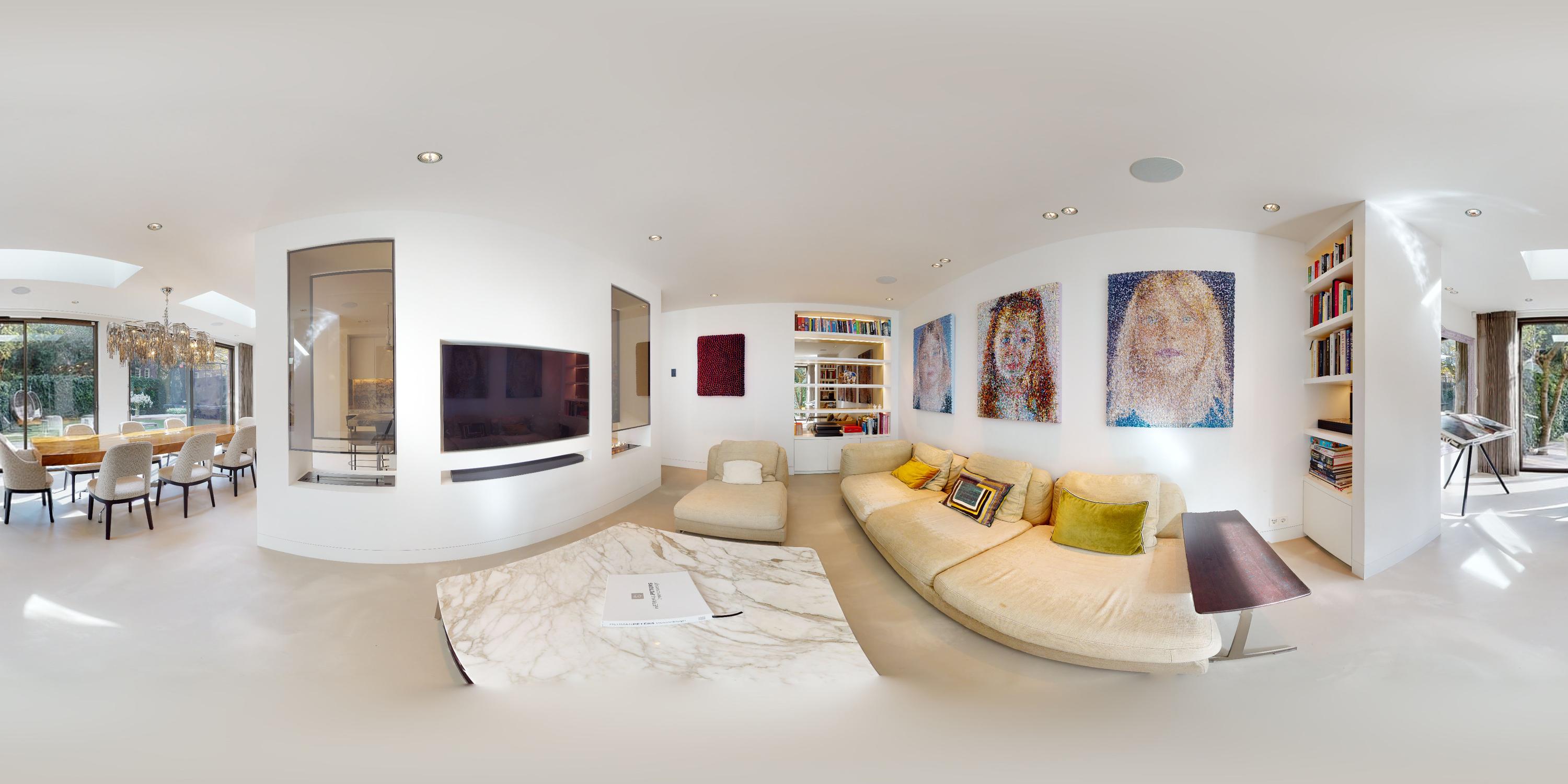 At the back of this floor, there is a large living space with a lovely, luxury kitchen, which really does come with everything you might expect: a sink island with a Quooker tap and also a cooler, oven, combi steam oven, hot plate, fridge, freezer, induction hob and built-in extractor unit. All the built-in appliances are by Gaggenau. The kitchen’s pièce de résistance is a special alcove with a pull-out unit for a coffee machine. Two attractive ethanol fireplaces separate the kitchen from the living-room area. The living space has been fitted with a number of built-in cupboards. The dining-room area, which is located in the extension, is next to the kitchen and the living-room area and comes complete with electric curtains. Skylights flood this space with light. A sliding door gives access to the large, south-east facing back garden.
