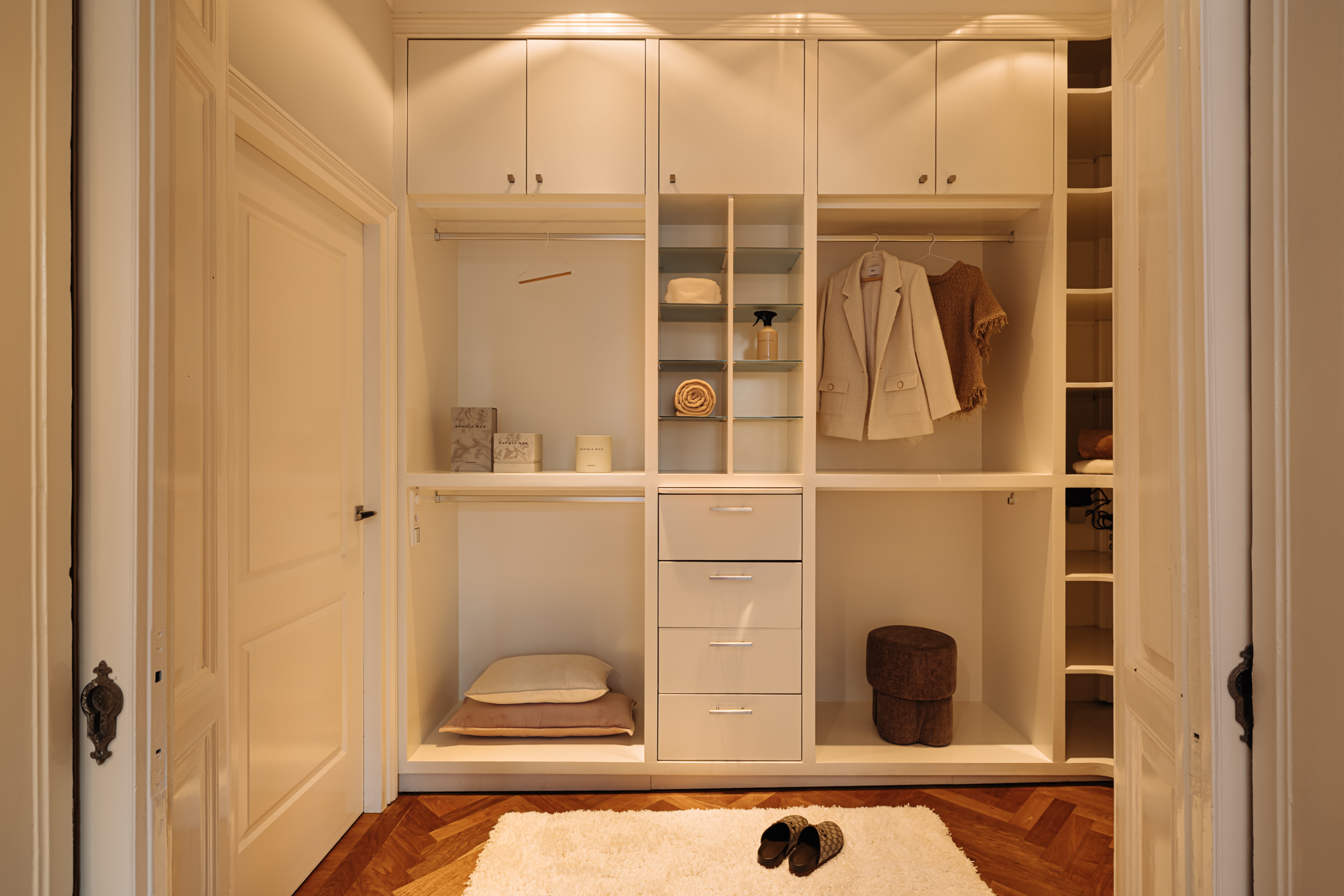 The first floor features two spacious and atmospheric bedrooms and a generous bathroom. The rear bedroom radiates tranquillity thanks to the high ceilings, herringbone floor, warm tones and a classical mantelpiece. Adjacent is a beautiful walk-in closet with custom-made cabinetry, open shelving and integrated lighting—a particularly comfortable and luxurious space to start the day.