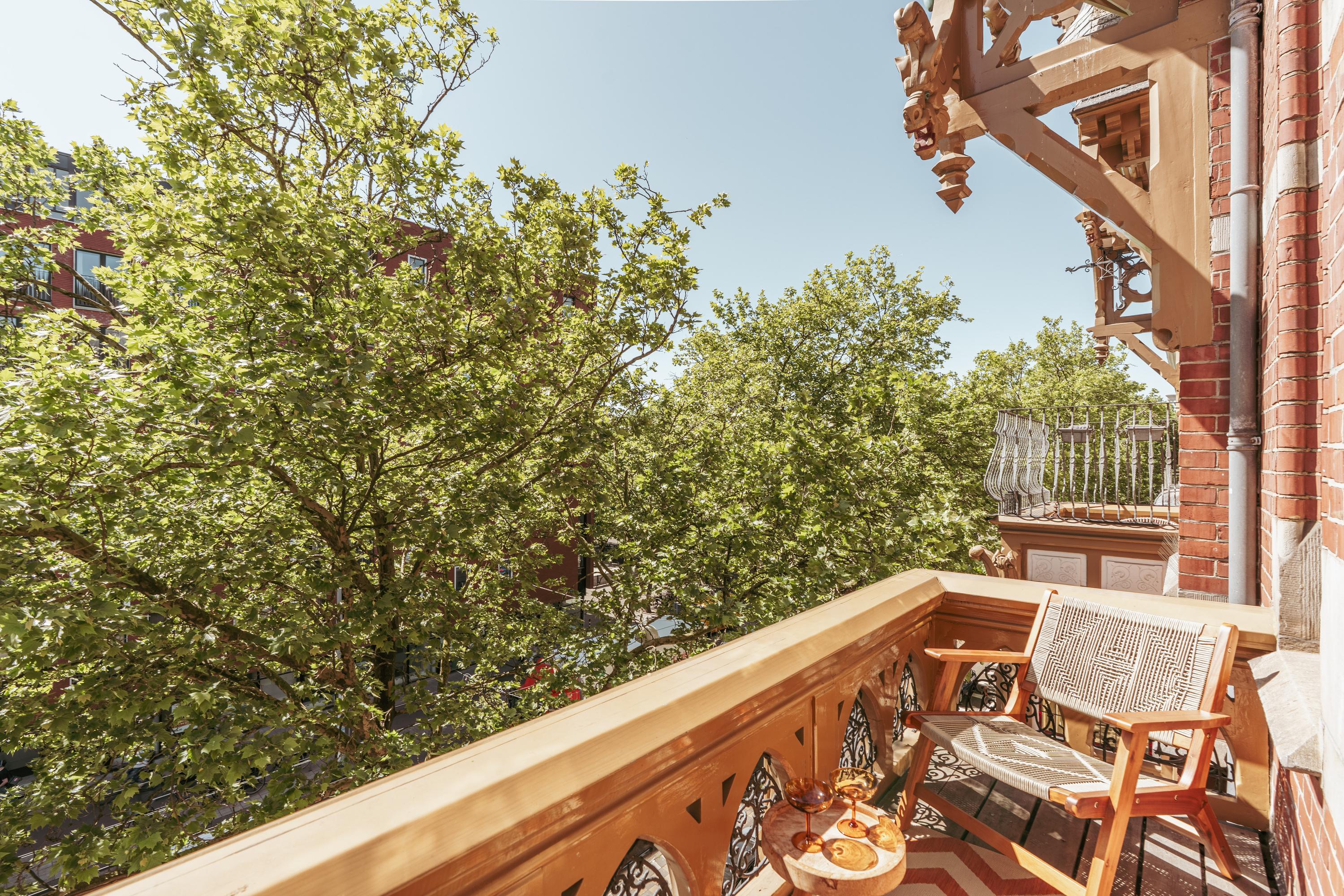 This level features a spacious landing with original exposed wooden beams—perfect as a music room, workspace, or gaming area. The fourth bedroom and a convenient storage room are located at the front. There’s also an additional washbasin on this floor. A staircase leads to the roof, where you can enjoy views of Carré Theatre and even the Rijksmuseum. This characteristic building, designed by architect A.C. Boerma, is constructed of brick accented with limestone blocks and bands. The facade boasts three elegant wooden bay windows adorned with authentic ornaments and fantasy figures. Throughout the home, you’ll find beautiful hardwood flooring, high ornamental ceilings, and original stained-glass transom windows. We invite you, like the current residents, to fall in love with this truly exceptional and spacious home.
