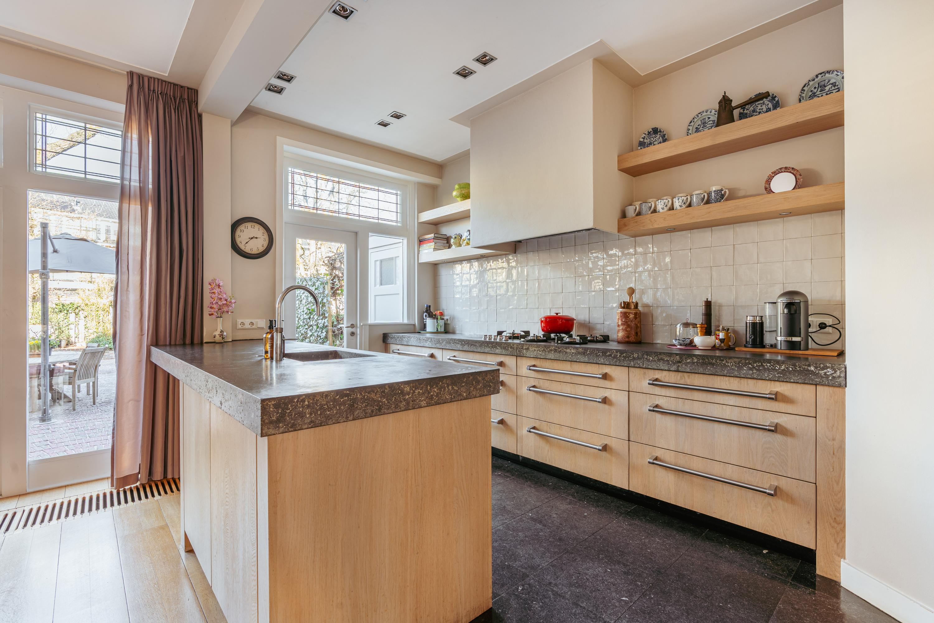 Entrance with a vestibule, followed by a spacious hallway with a cloakroom, staircase, and a separate toilet with washbasin. At the front, the inviting living room features a fireplace and a bay window, providing beautiful natural light. There is ample space for a generous seating area and, if desired, a reading or workspace. Through double French doors, you access the elevated front terrace, a pleasant spot to enjoy the sun. At the rear, behind sliding doors, is the generous dining room with an adjoining open-plan kitchen with cooking island. The kitchen is equipped with a five-burner gas stove, extractor hood, oven, combi-oven, refrigerator, dishwasher, Quooker, and offers extensive storage space. Double doors provide access to the deep and sunny rear garden, offering a high degree of privacy and featuring a detached storage unit, ideal for bicycles and garden tools. Notably, this property—one of the few on Diepenbrockstraat—also benefits from rear access, secured by a wooden gate with a code lock.