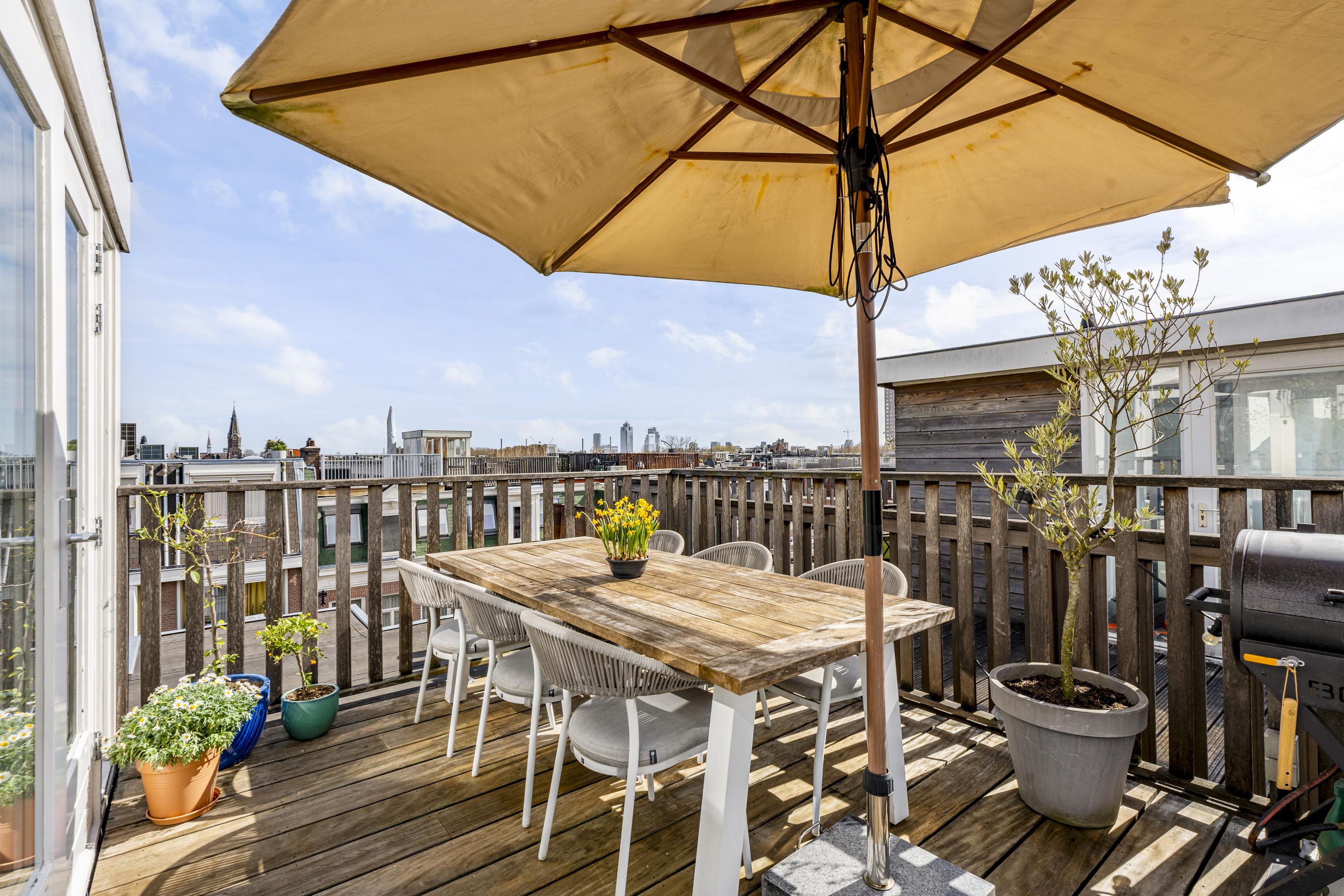 The living floor, situated on the fourth level, features a spacious and bright living room with an open-plan kitchen. The space is characterized by charming wooden beams, adding warmth and character. Large windows at both the front and rear, combined with natural light from the rooftop terrace, ensure a pleasant flow of daylight throughout the day. The open kitchen spans the full width of the wall and offers ample storage space. It is equipped with a six-burner gas stove, extractor hood, oven, dishwasher, sink with Quooker, refrigerator, freezer, and a wine climate cabinet. This floor also includes a separate toilet with double doors. From the living room, there is direct access to the west-facing balcony at the rear. A fixed staircase leads to the stunning rooftop terrace. This generous outdoor space offers complete privacy and enjoys 360-degree sun exposure, making it the perfect place to relax throughout the day. With ample room for multiple seating and lounge areas, the terrace is a true highlight of the property.