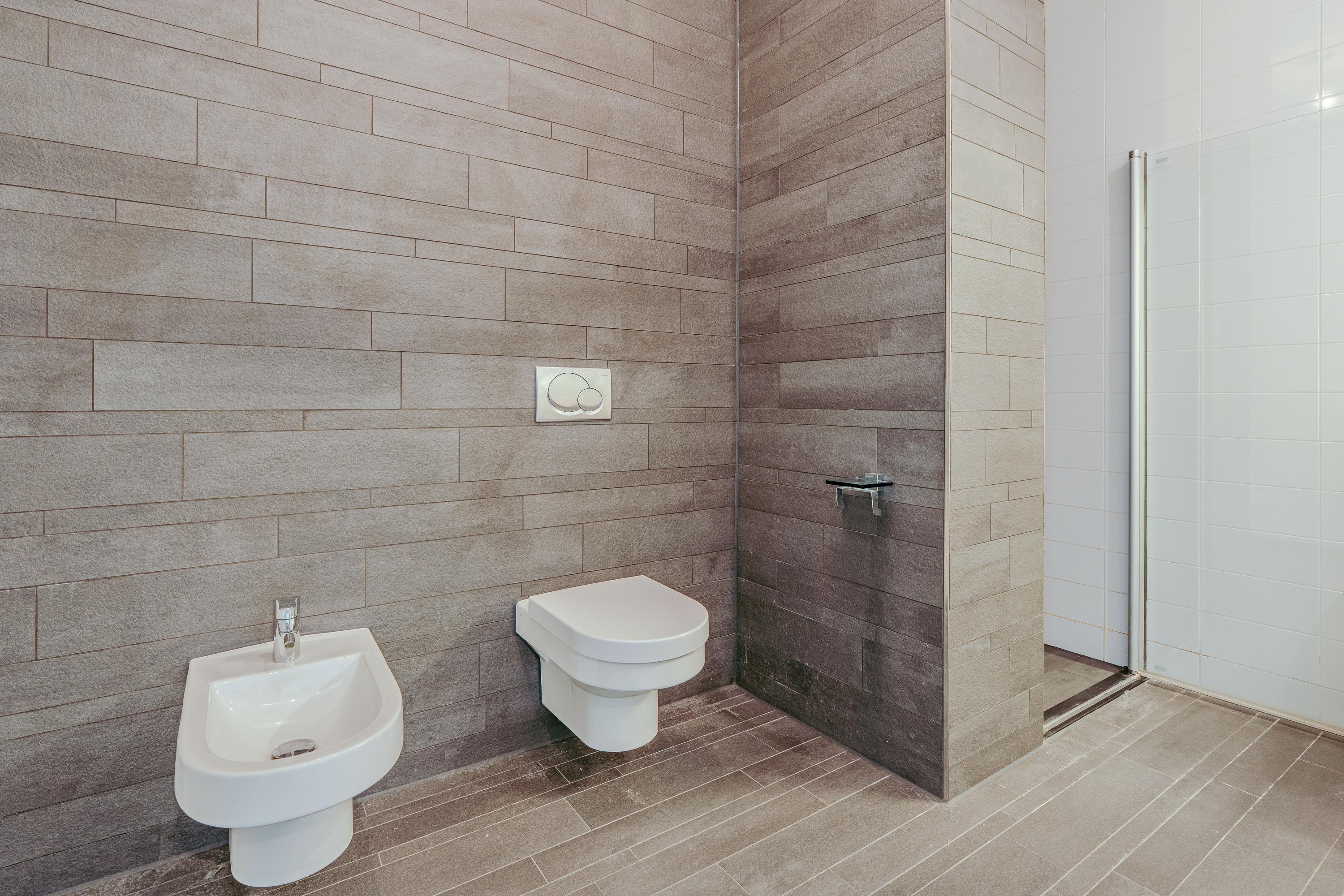 A second hallway connects the living area to the bedrooms at the front and the bathroom at the rear. Both bedrooms are remarkably spacious and benefit from large windows, enhancing the open and serene atmosphere. The primary bedroom also features a sunroom, adding to the sense of space and comfort. At the back, you’ll find a contemporary bathroom fitted with a vanity unit, bathtub, bidet, and walk-in shower. The hallway also provides access to a large internal storage room, perfect for additional storage needs.