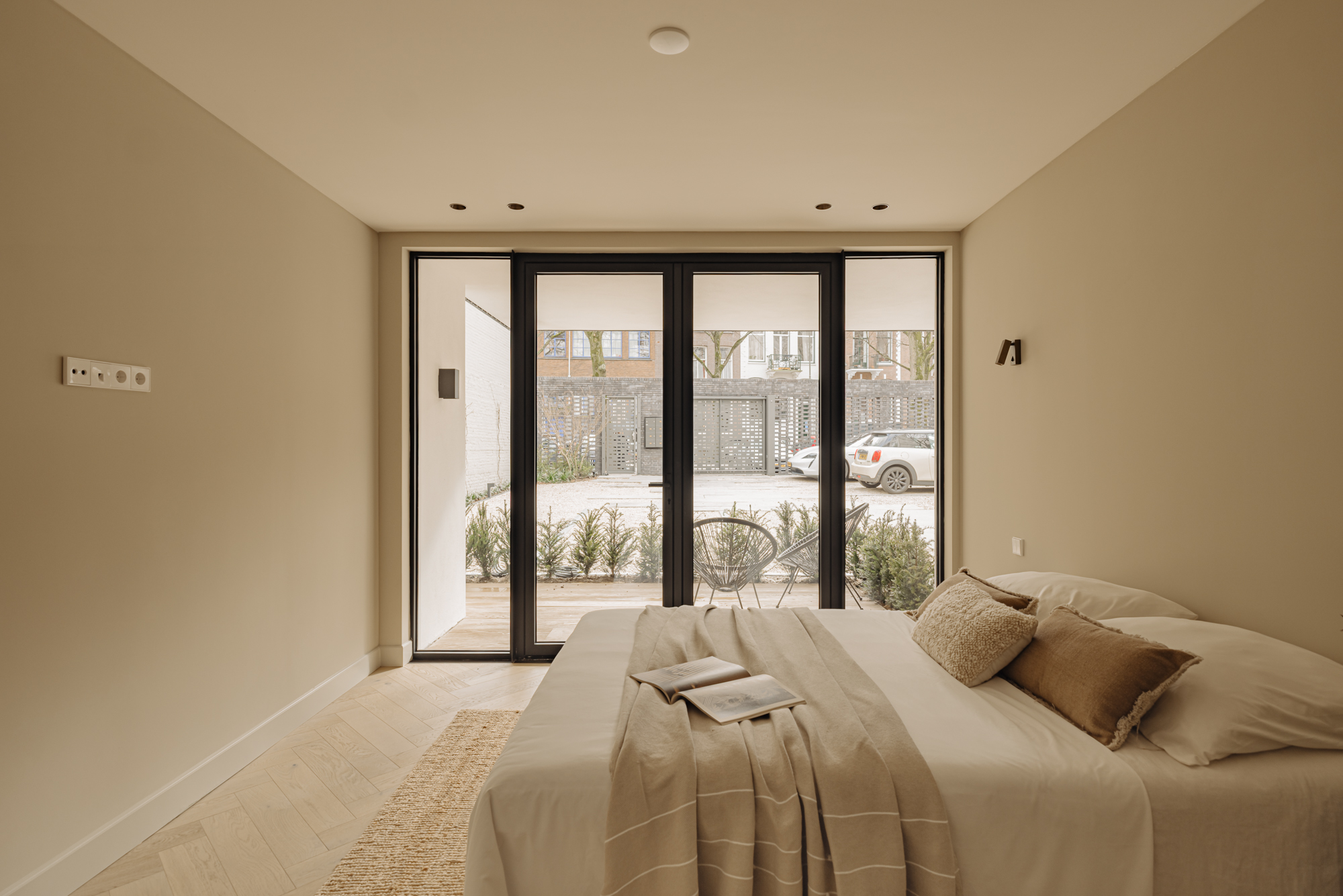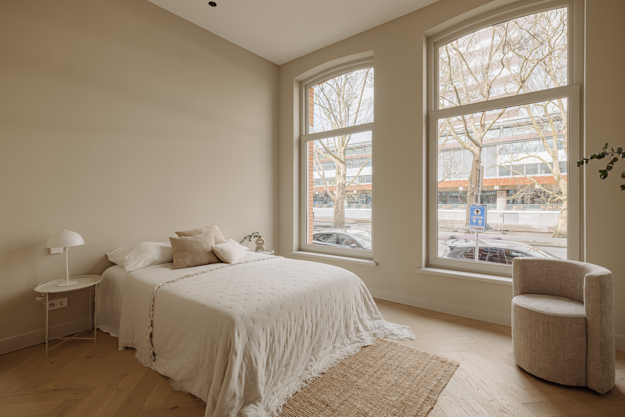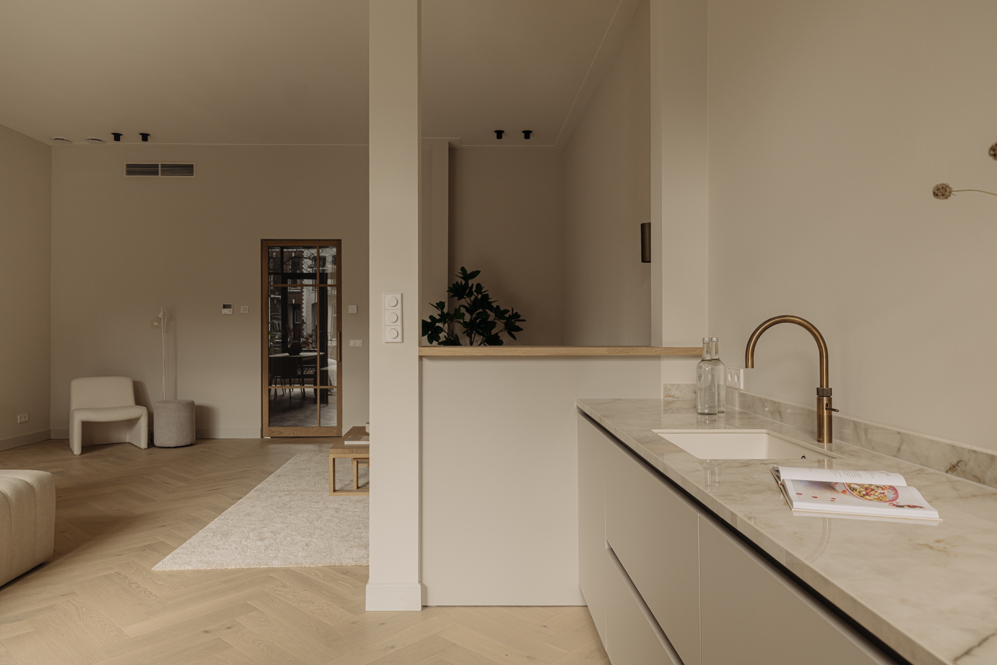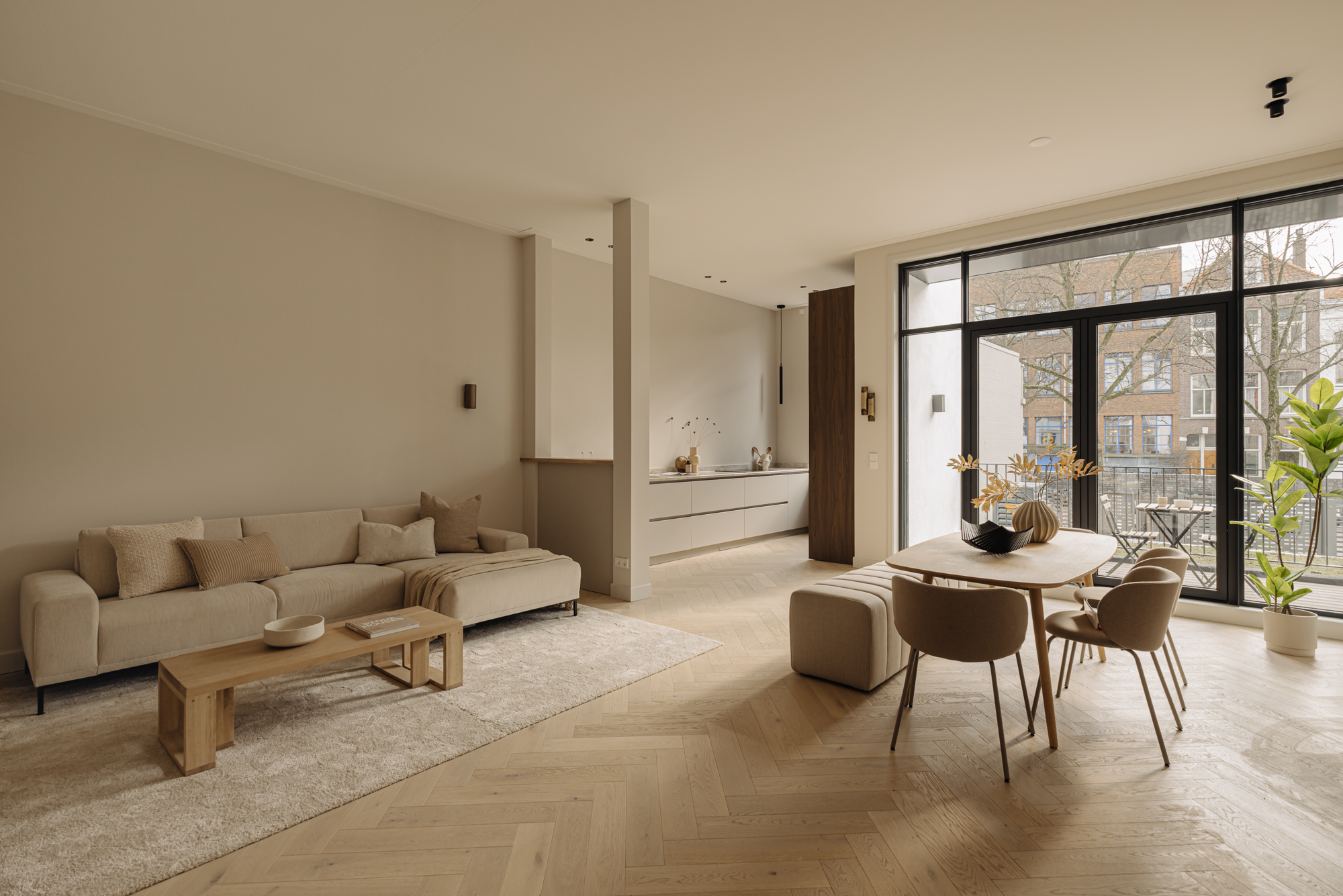 Apartment Amsterdam is presented across 182 m² of refined space, offering four bedrooms, two bathrooms, a south-facing balcony of 7 m² and an 11 m² terrace. Located in the Hemony complex on a quiet street in De Pijp, this residence is freehold and enveloped in a sense of urban calm. The double ground-floor layout welcomes you with high ceilings, luxury herringbone flooring and a palette of warm, subtle tones. The Italian-designed kitchen features white cabinetry combined with walnut accents and marble worktops, blending visual clarity with practical storage and top appliances.