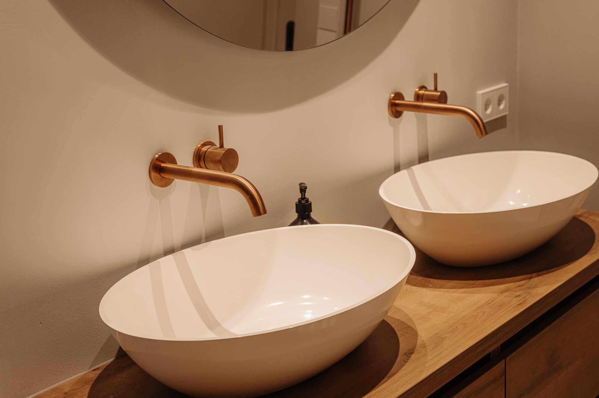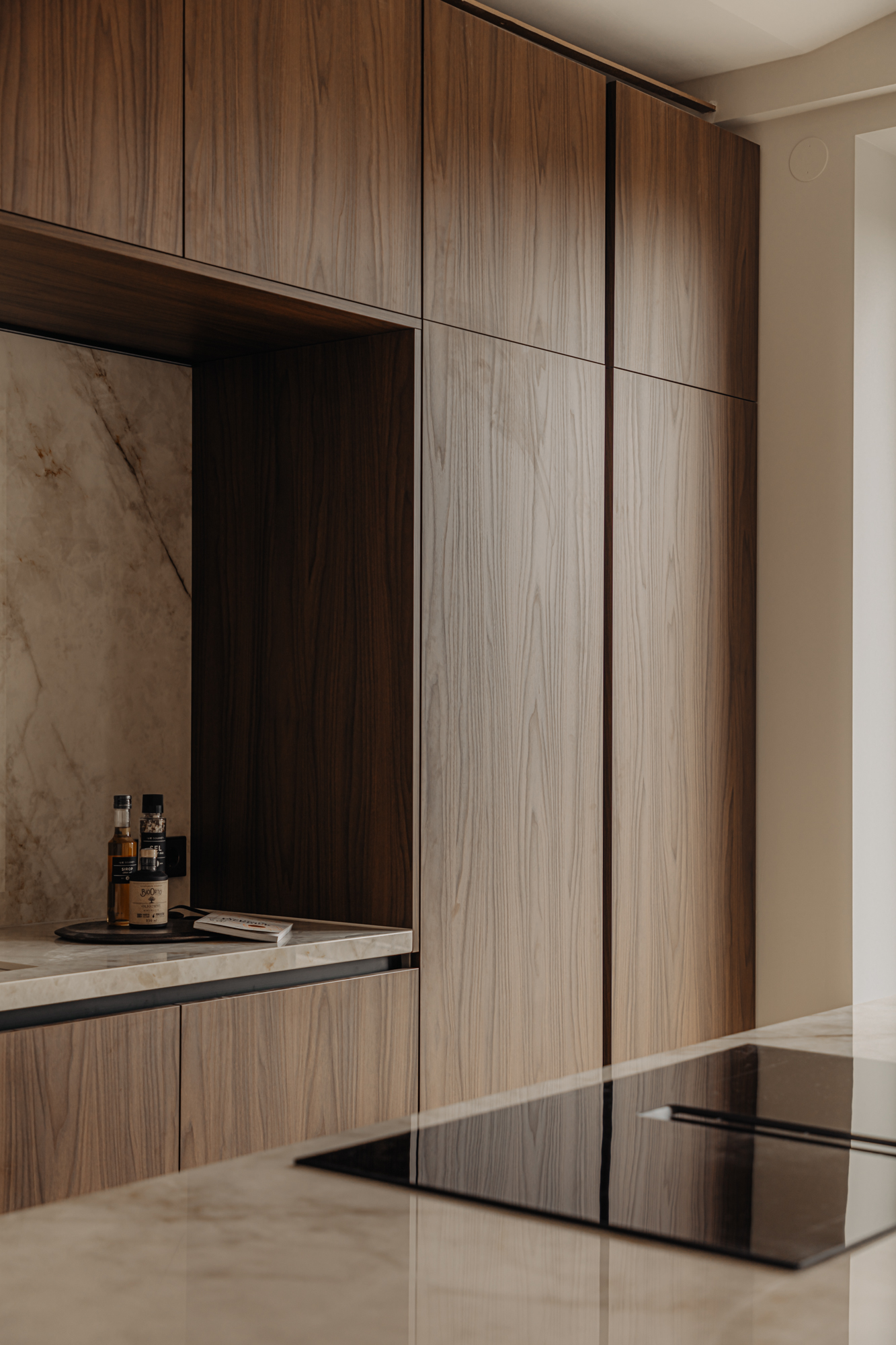 The front door to the apartment opens into a landing that gives access to storage space, a separate guest toilet and all the apartment’s other rooms. There is a large, bright living room (approx. 53 m2) and an open-plan kitchen of Italian design with a cooking island at the front of this floor. The luxury kitchen is equipped with a comprehensive range of built-in appliances and balances style and functionality perfectly. The sophisticated combination of white units with marble worktops and large units with the warm shade of walnut give the space a beautiful, atmospheric feel. A number of double doors open out onto the apartment’s sunny roof terrace.