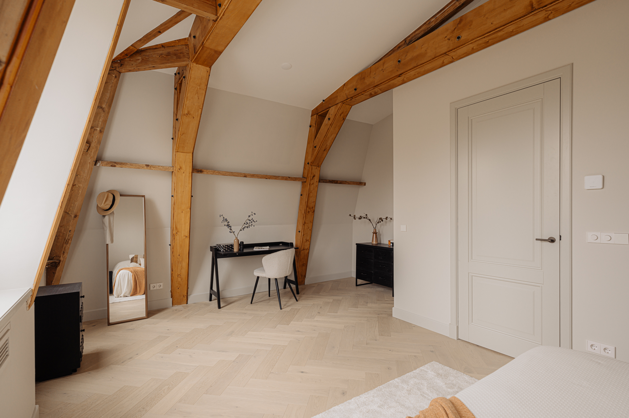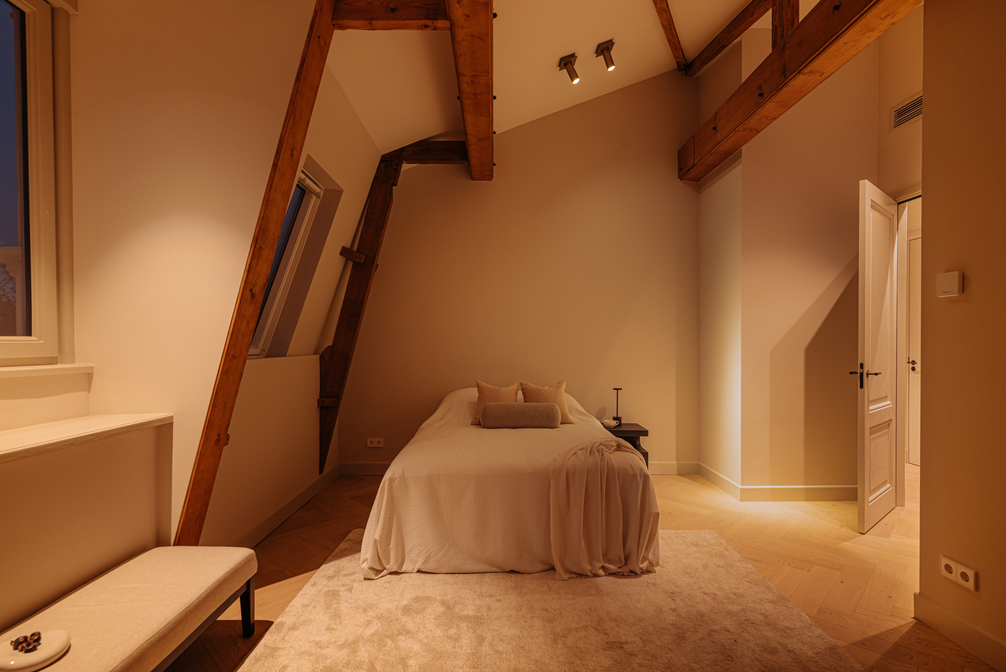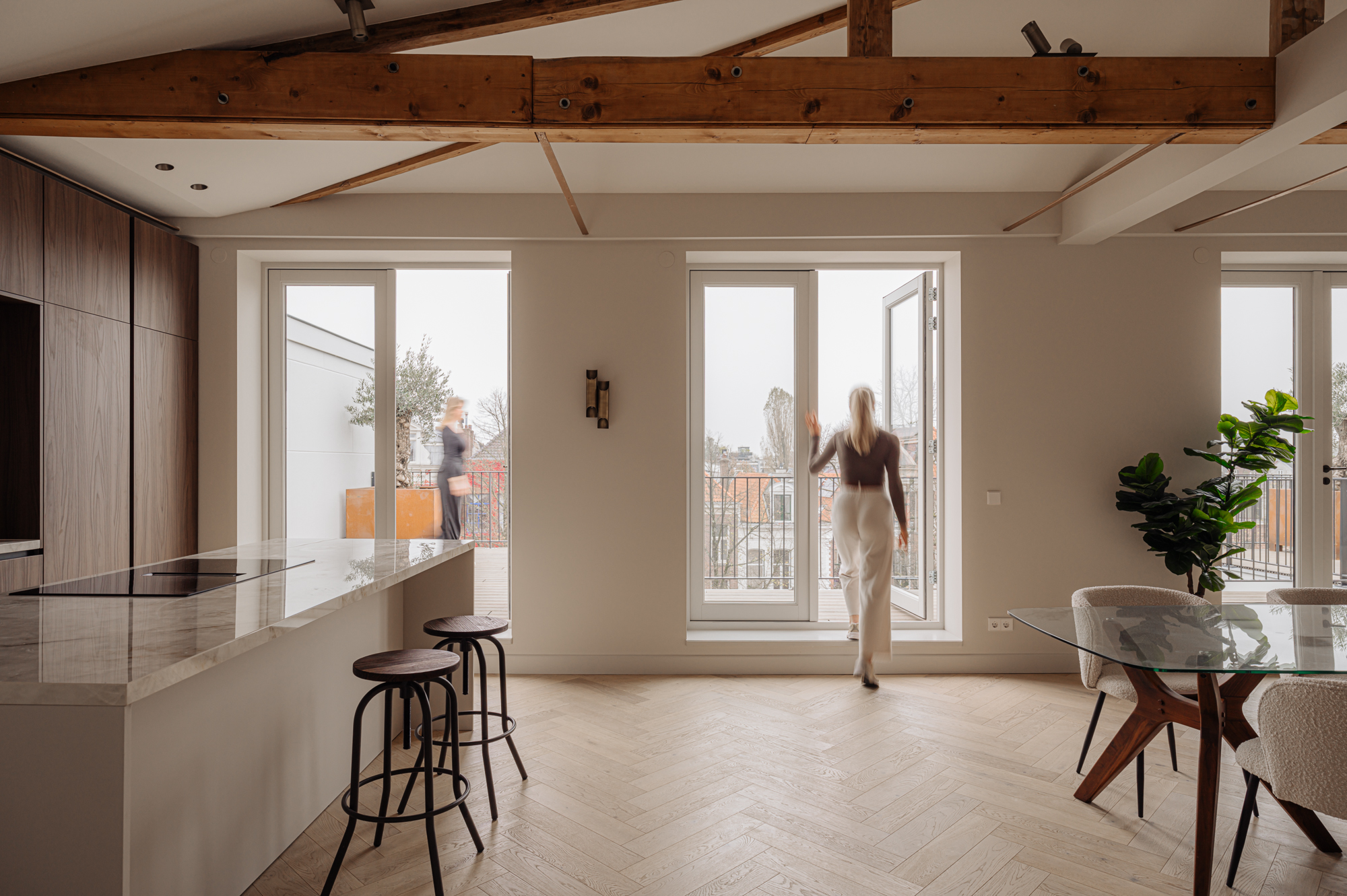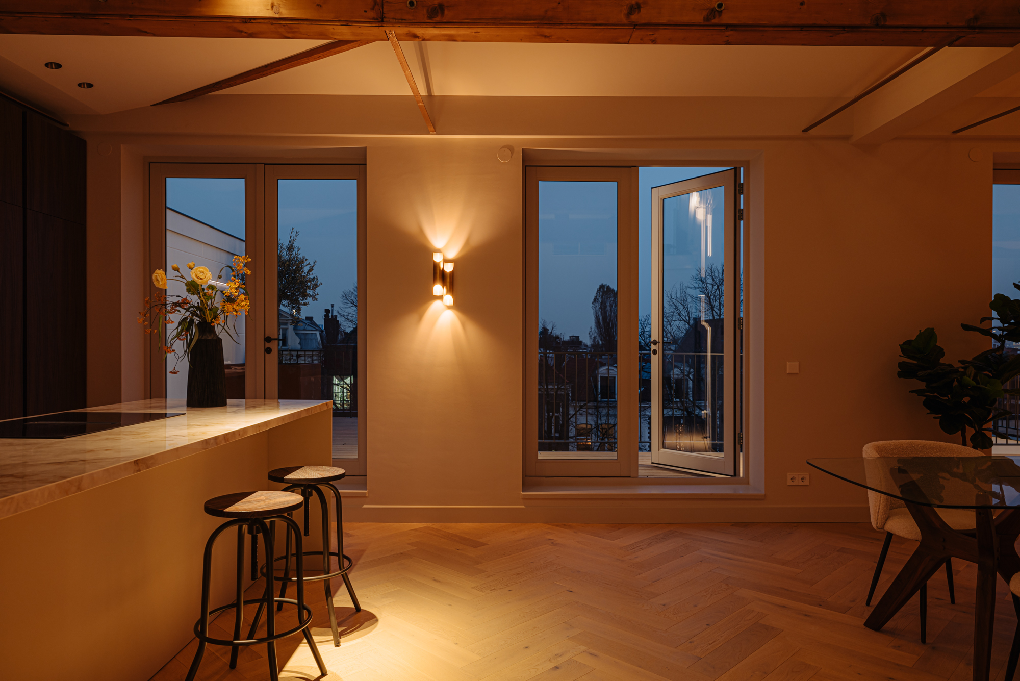 A luxury penthouse of approx. 148 m², with two (and the option for three) bedrooms, two bathrooms, a large south-facing roof terrace, an open-plan kitchen with a cooking island and internal storage space. The apartment features carefully selected, high-end materials that create a sense of warmth and comfort. Luxury herringbone floors, high ceilings, subtle tones in the kitchen and bathrooms and a well-thought-out lighting plan create a harmonious and inviting ambiance. The kitchen, with its clean lines and ample storage space, is a perfect combination of style and practical functionality. The building itself is a freehold property.