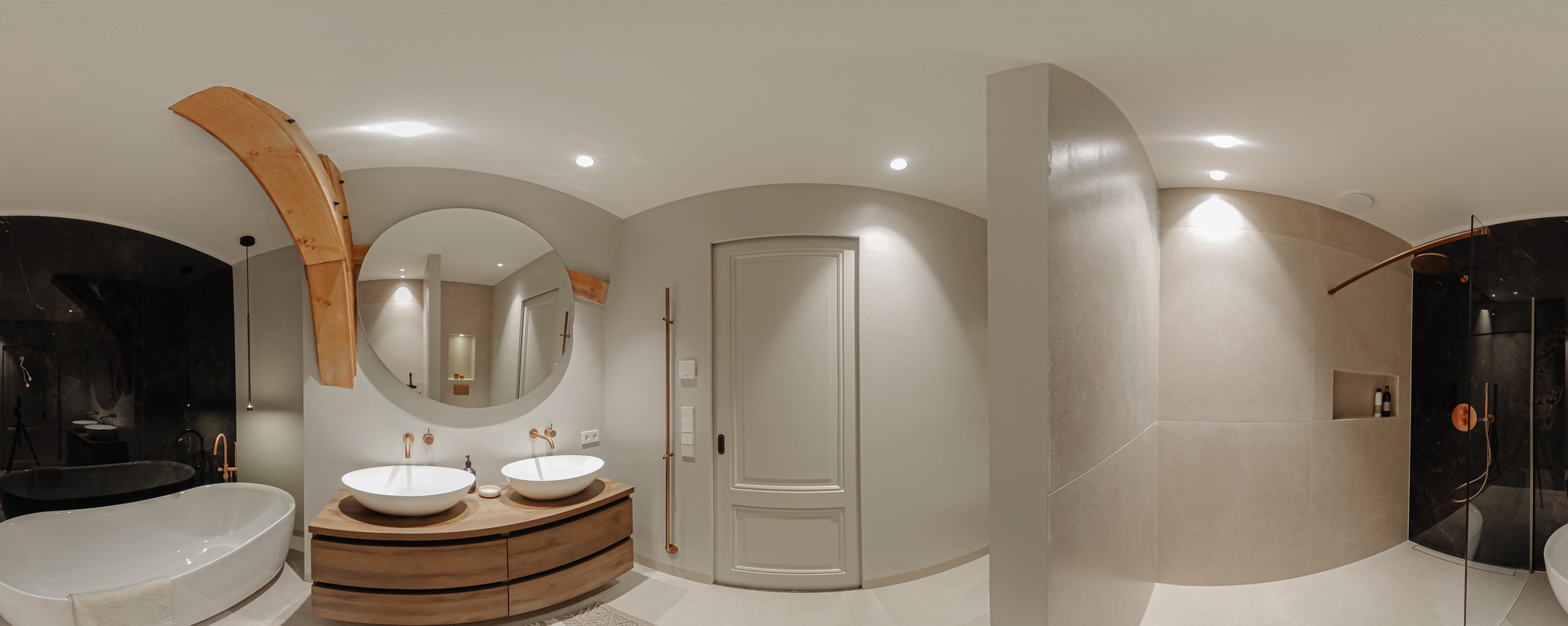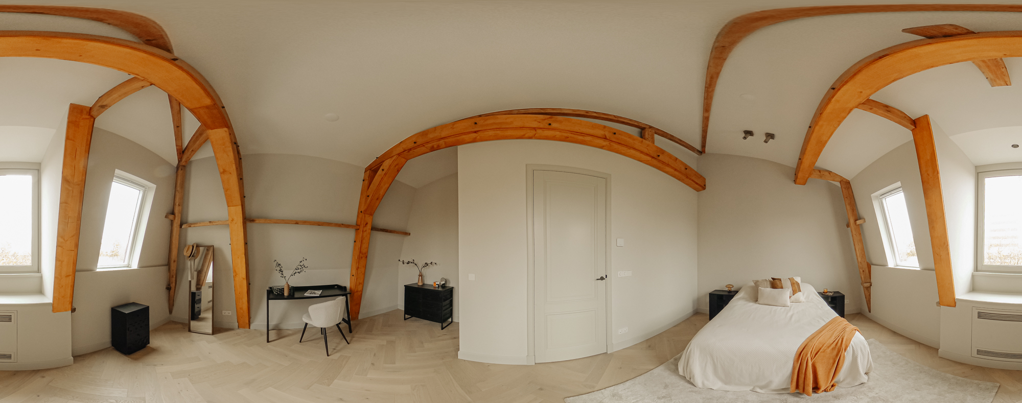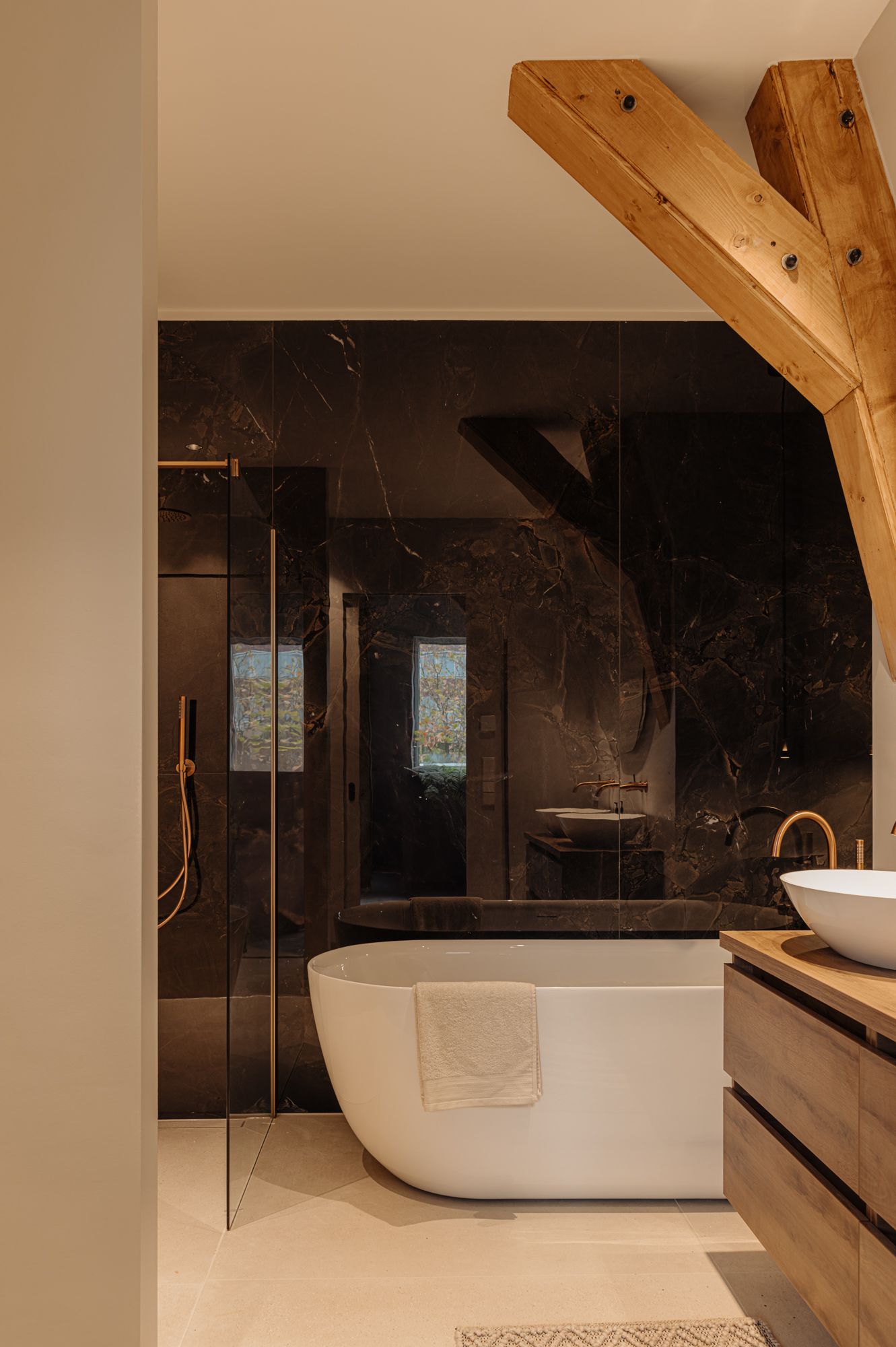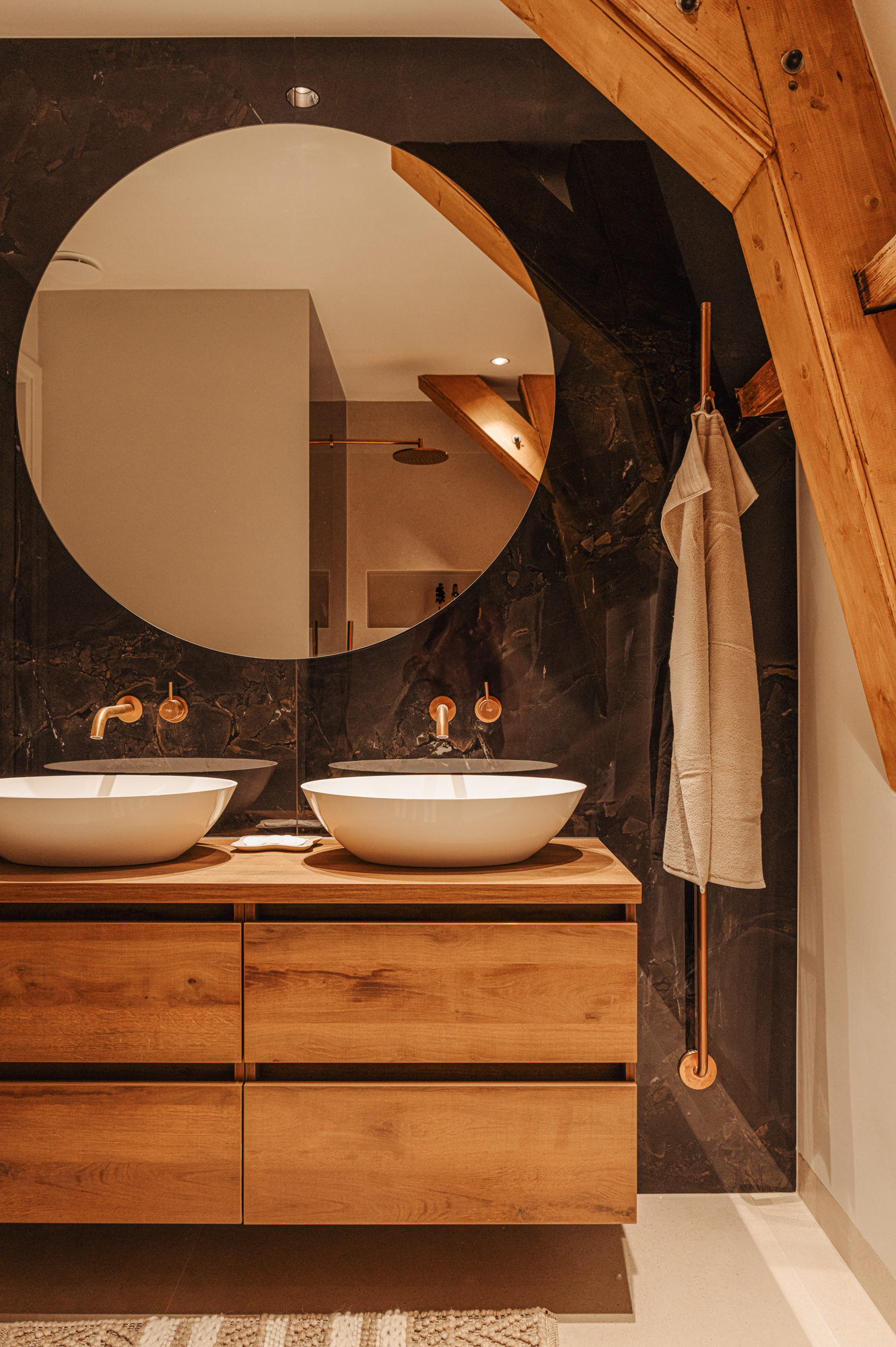 The two bedrooms at the back are flooded with natural light. They are so spacious that it would be easy to create a third bedroom. They have been beautifully finished with original wooden beams, which contribute to the apartment’s distinctive charm. The Master bedroom has its own en-suite bathroom with a double washbasin, a large bath and walk-in shower and a toilet. This bathroom is the epitome of comfort and luxury. The second bathroom is elegant too and has a double washbasin unit and a walk-in shower.