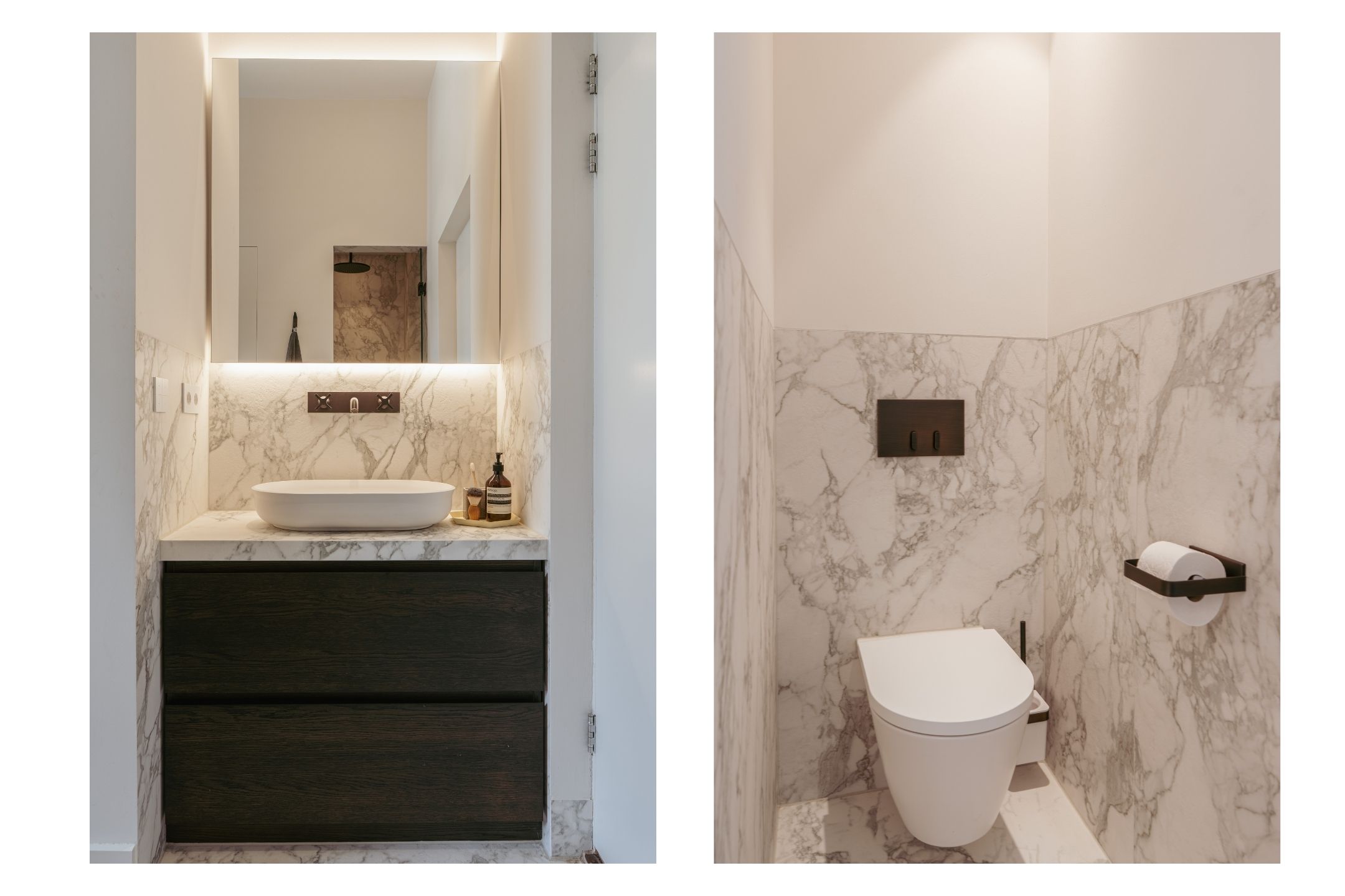 Aan de voorzijde bevindt zich de prachtige en breed opgezette woonkamer met grote raampartijen en fenomenaal uitzicht over de Herengracht. De ruimte wordt gekenmerkt door veel lichtinval en een bijzonder detail: de schouw en de achterwand in de keuken zijn uitgevoerd in hetzelfde kleurrijke marmer, wat zorgt voor een luxe en stijlvolle uitstraling.