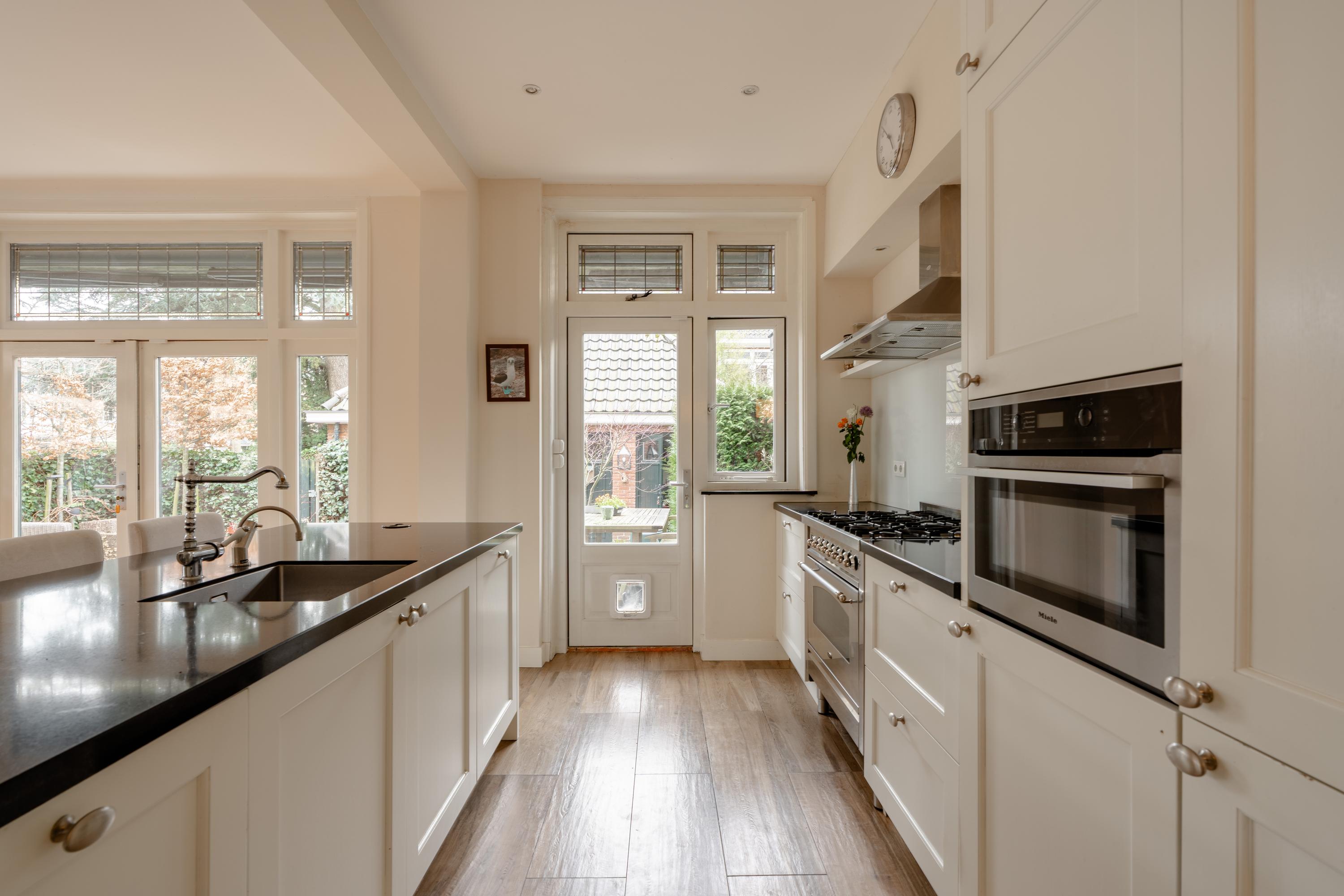 From the living room you enter the generous dining room, which connects to the semi-open kitchen. The kitchen is equipped with various built-in appliances including a dishwasher, Quooker and microwave. In addition, the kitchen features a large gas stove with oven. From the kitchen there is also access to the spacious basement.