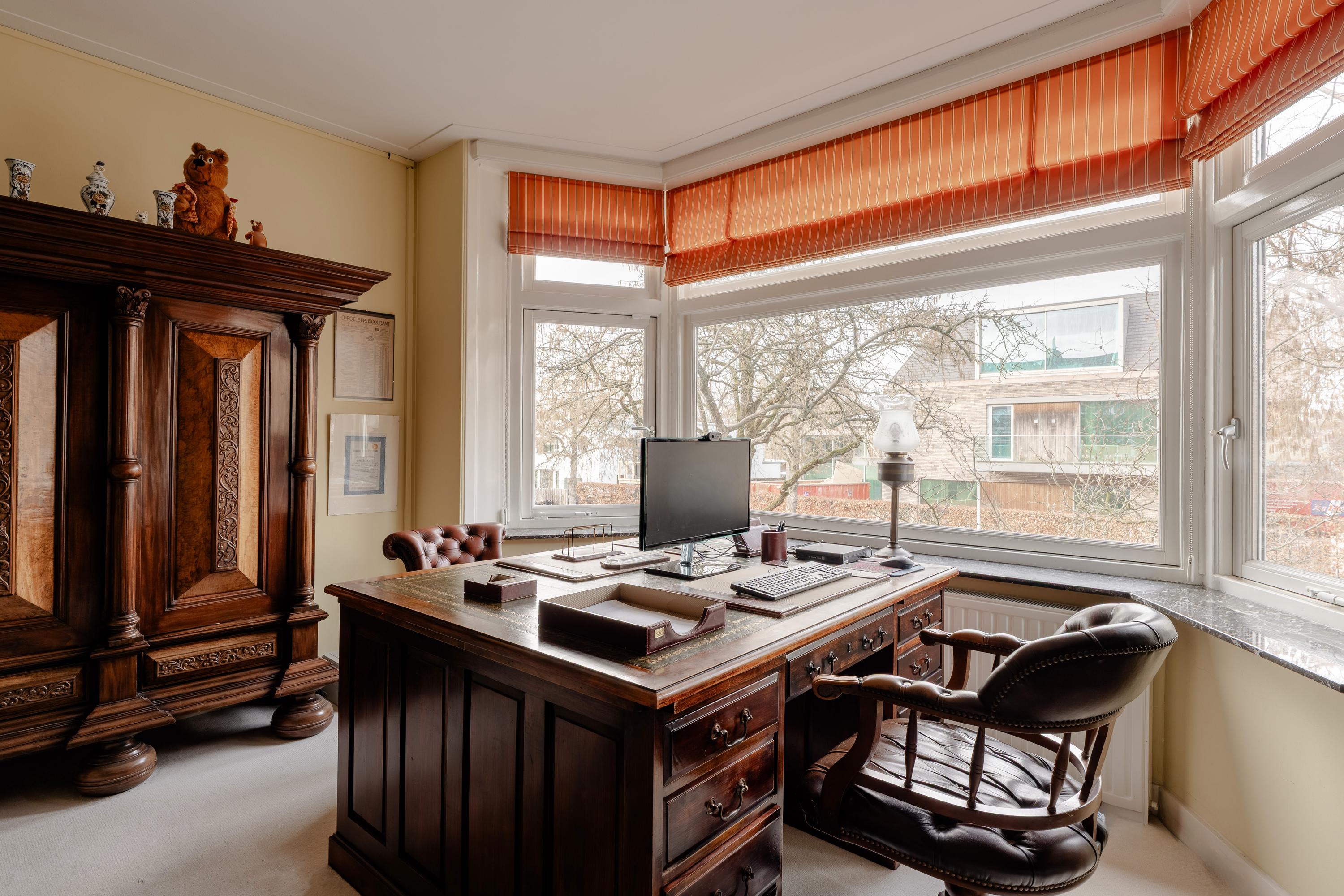 This floor is characterised by beautiful original stained-glass windows and an elegant parquet floor with border. At the front of the house is the spacious and bright en-suite living room with fireplace, creating a warm and inviting living space.