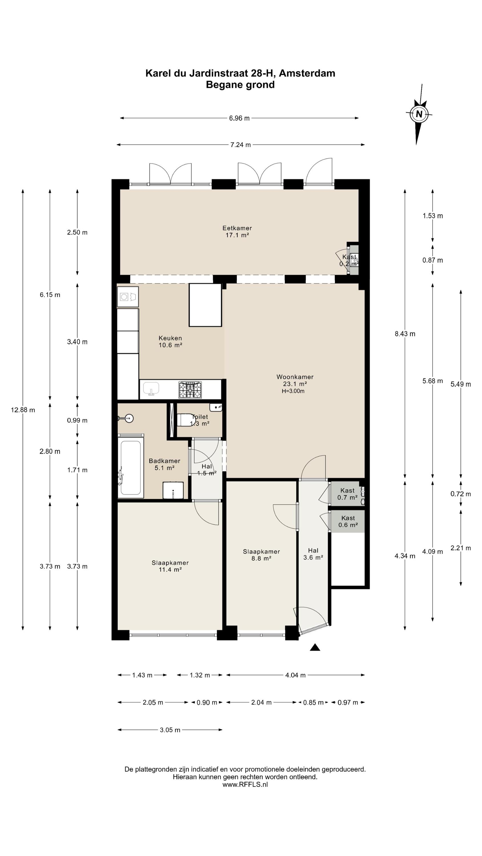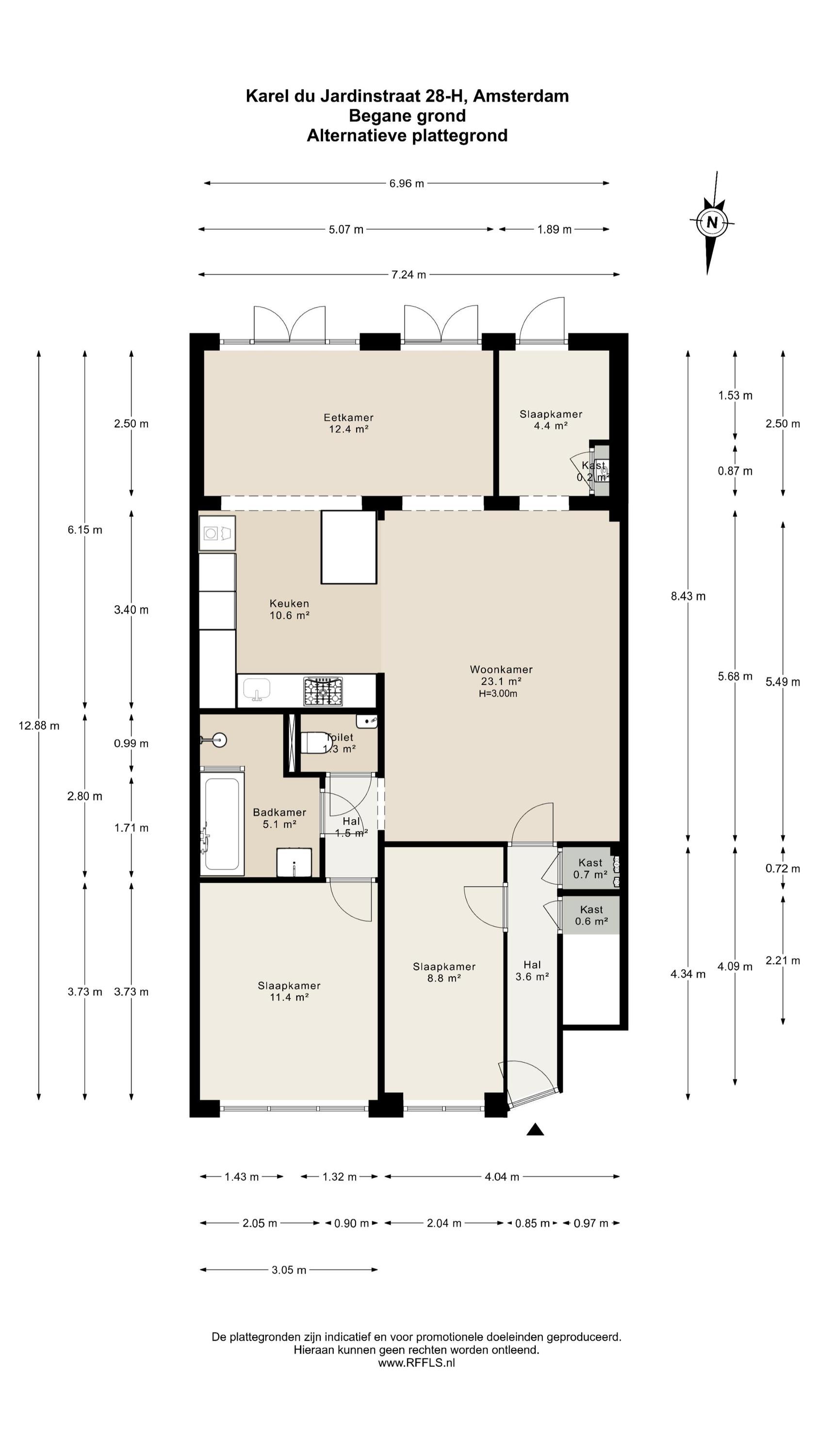 The layout presents a generous living space and an open kitchen equipped with a kitchen island, modern appliances including a 5 burner gas hob, combi oven, dishwasher, fridge freezer, additional freezer and Quooker. There are three bedrooms and a centrally located bathroom featuring a bathtub, double washbasin unit and walk in shower. High ceilings of approximately 3 meters throughout most rooms enhance the sense of space and openness.