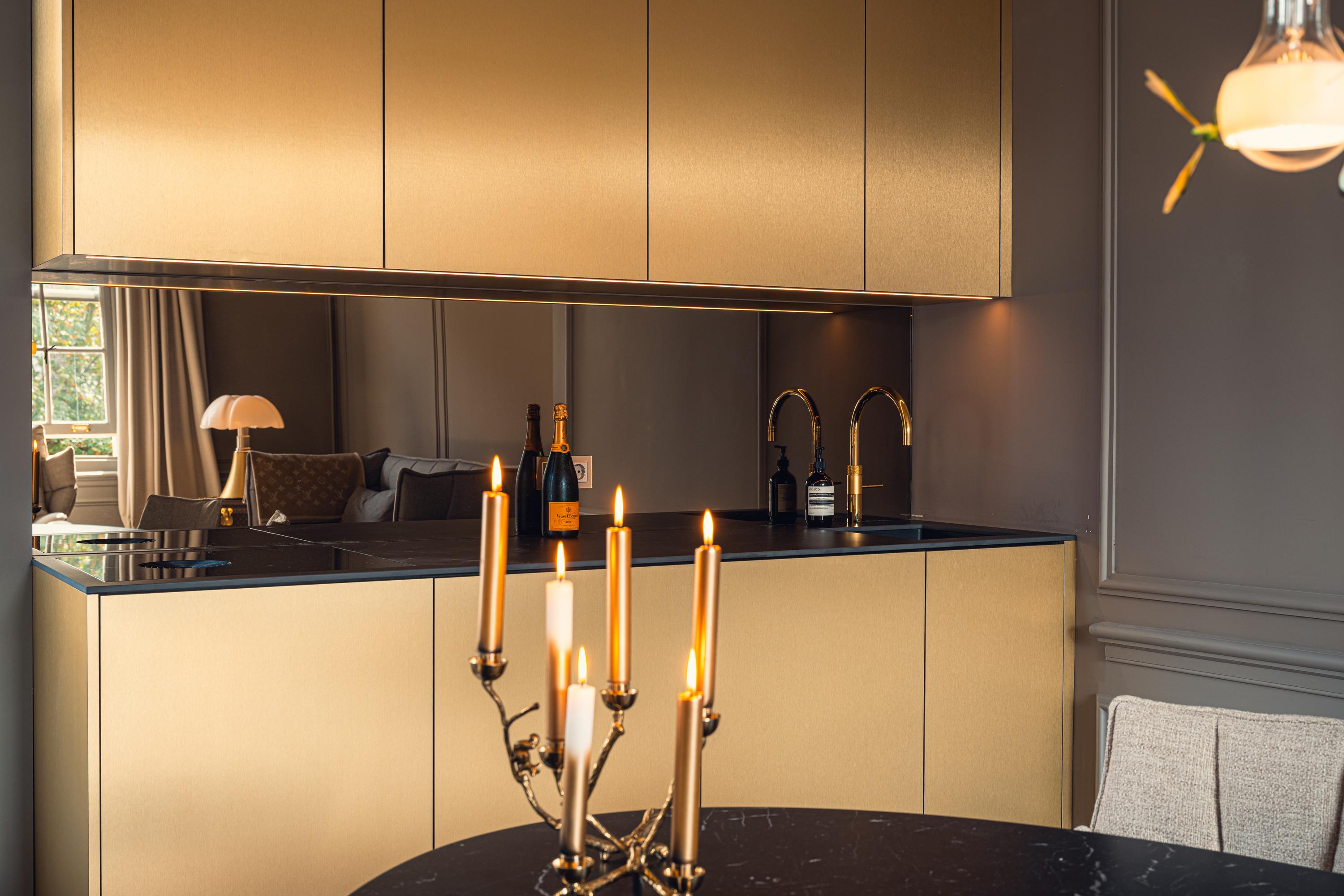 At the rear is the modern kitchen, finished in a gold-toned color that contrasts beautifully with the warm wooden flooring and neutral walls. The kitchen is equipped with high-quality Miele built-in appliances, Quooker, Bora induction cooktop, and offers ample cupboard space. With its open connection to the living room, the space remains light and inviting—perfect for those who enjoy cooking and entertaining.