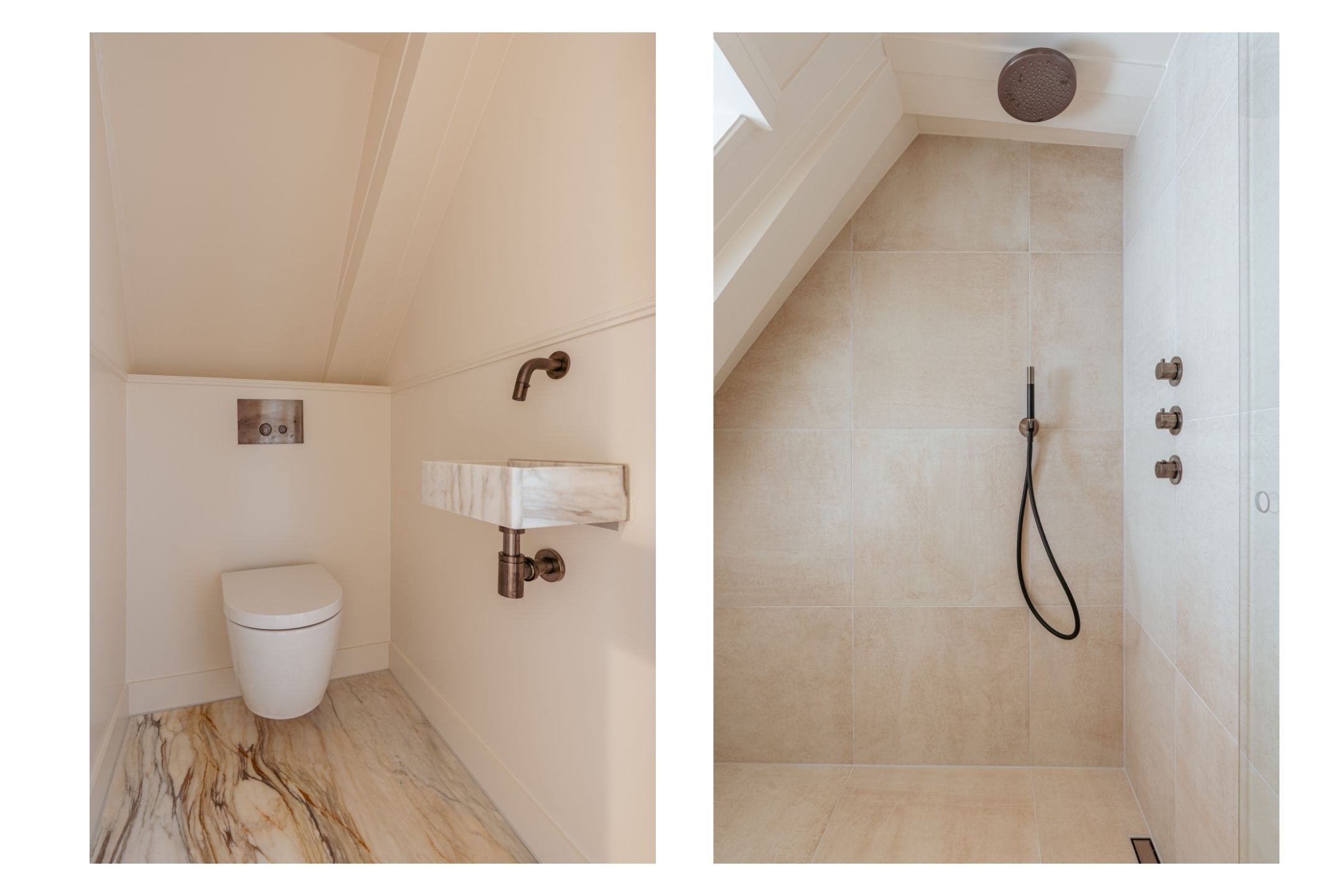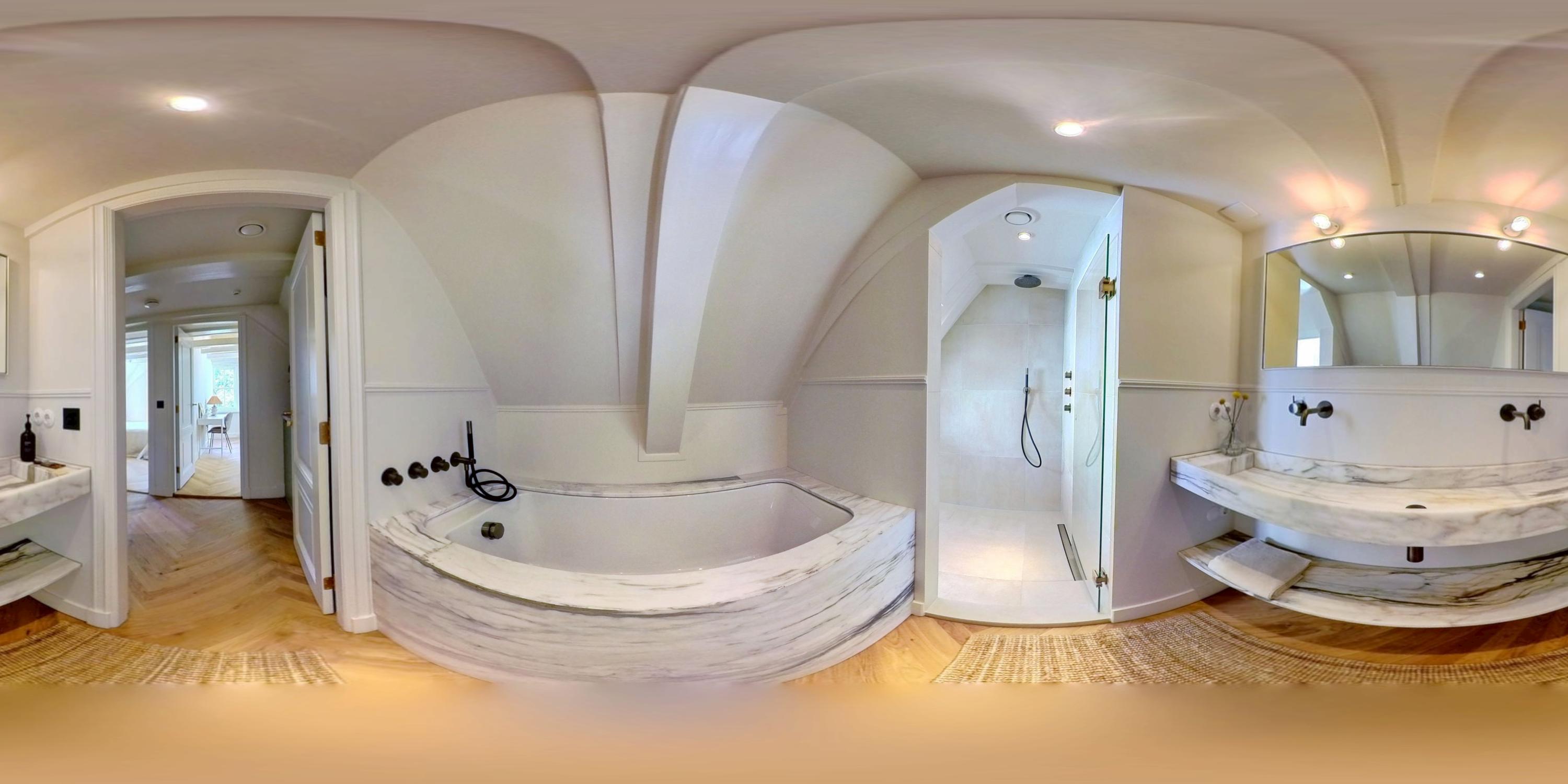A stylish steel-framed glass door leads to the hallway with separate WC and a practical utility room. Adjacent is a generous bathroom with double vanity, freestanding bath, and walk-in rain shower – all finished in elegant marble.
