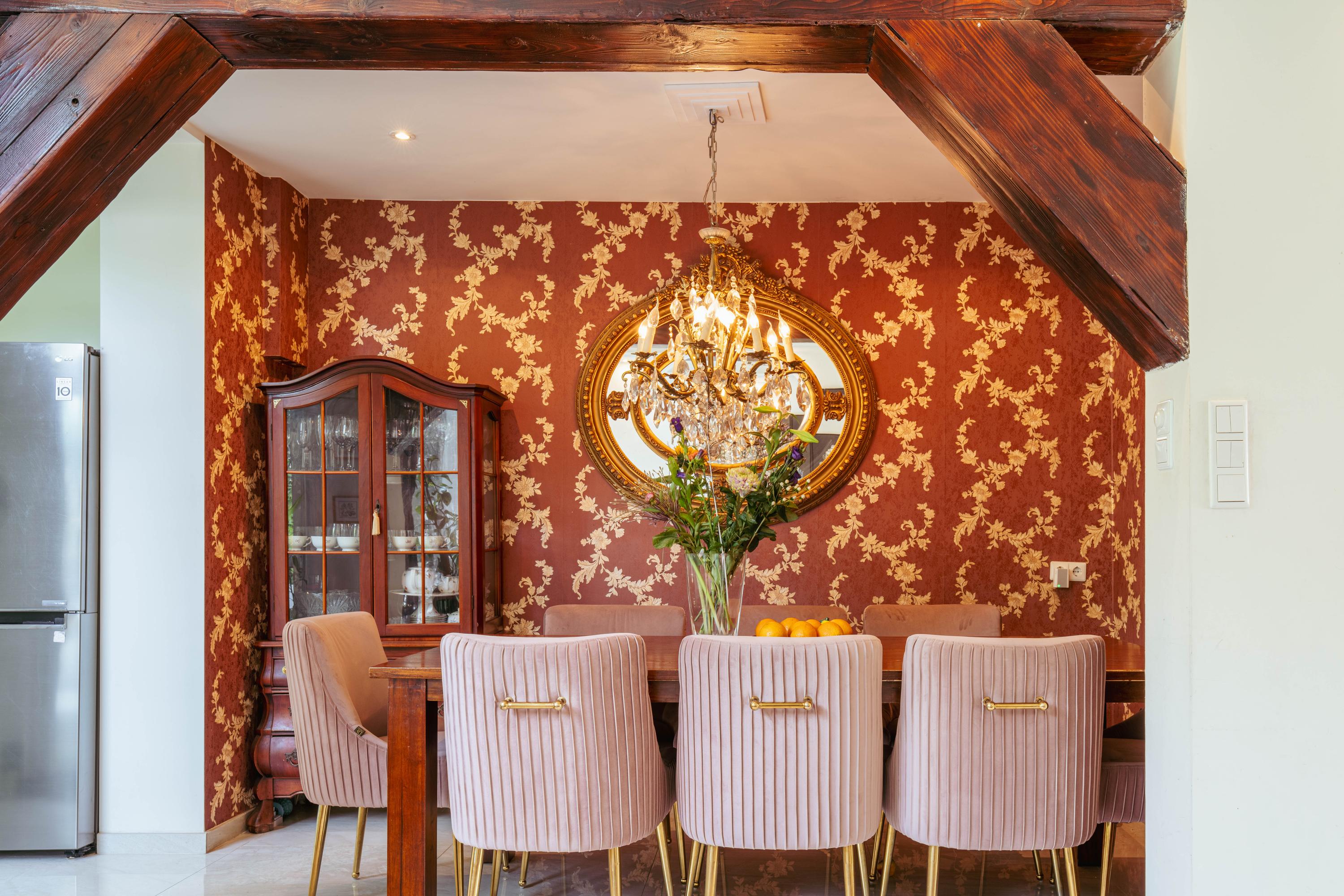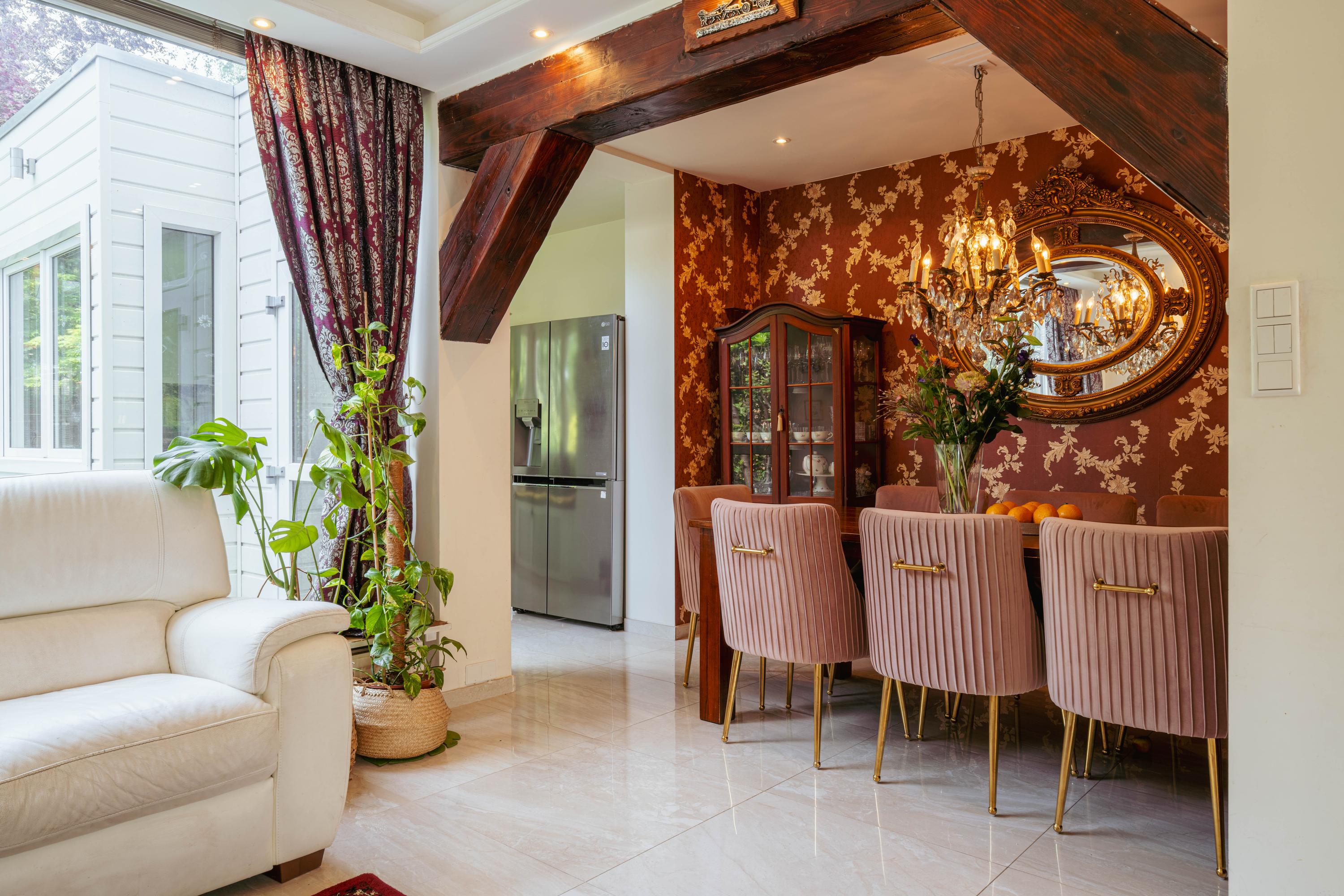 Through the spacious front garden, you reach the entrance to the house. You enter the vestibule with wardrobe space, which leads to the central hall. Here you will find practical storage space and a separate toilet. Double doors give access to the spacious and bright living room. At the front is the sitting area, attractively furnished with a gas fireplace. At the rear you will find the dining room, which is directly connected to the semi-open kitchen. The kitchen is fully equipped with a fridge, oven, microwave, gas cooker, dishwasher, and sink. A cosy bar area and seating area make this a nice place to cook and get together. Adjacent to the kitchen is the utility room, ideal as extra storage space or laundry room. From the kitchen, you have access to the wonderful and spacious back garden (approx. 51m²), facing east and equipped with storage.