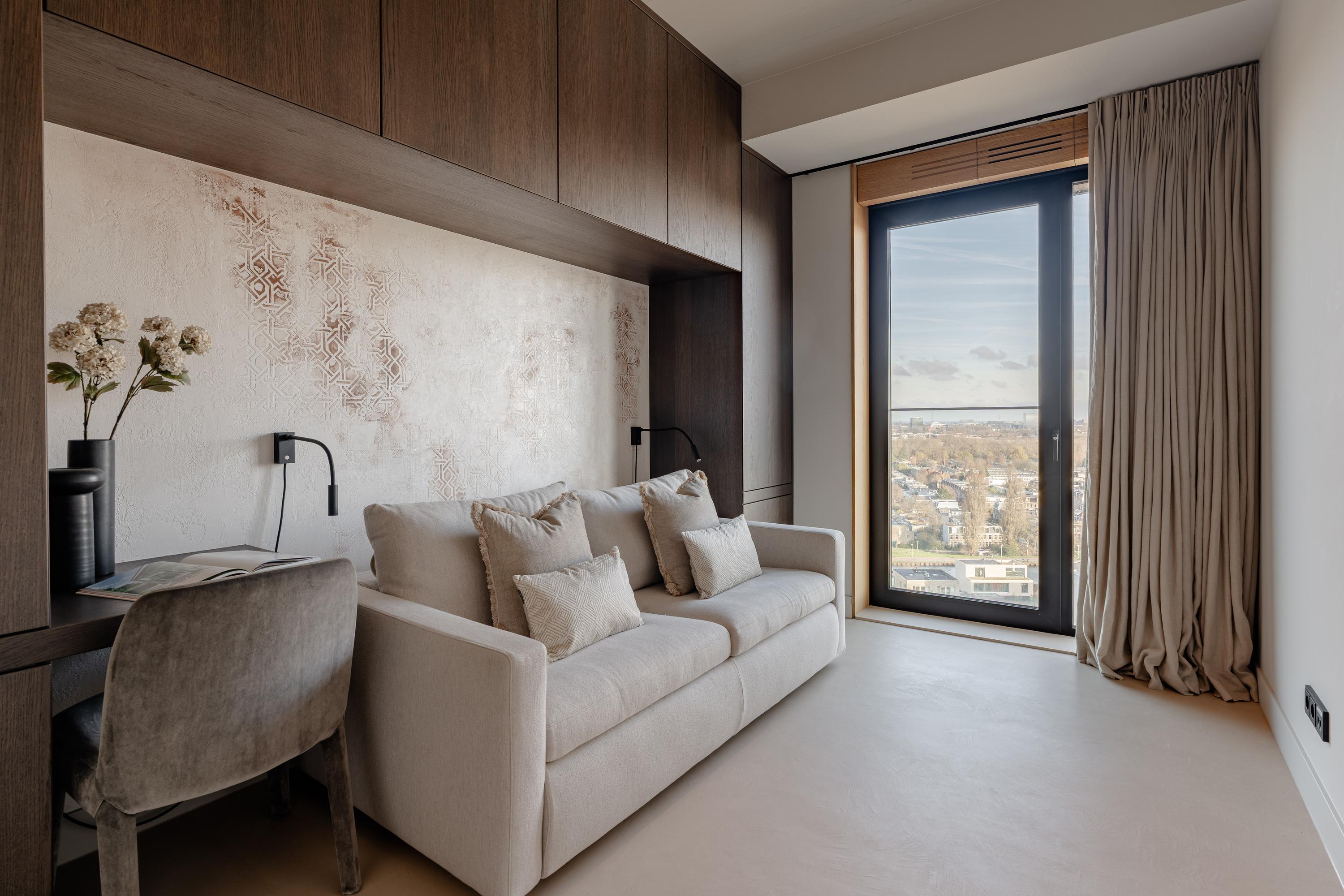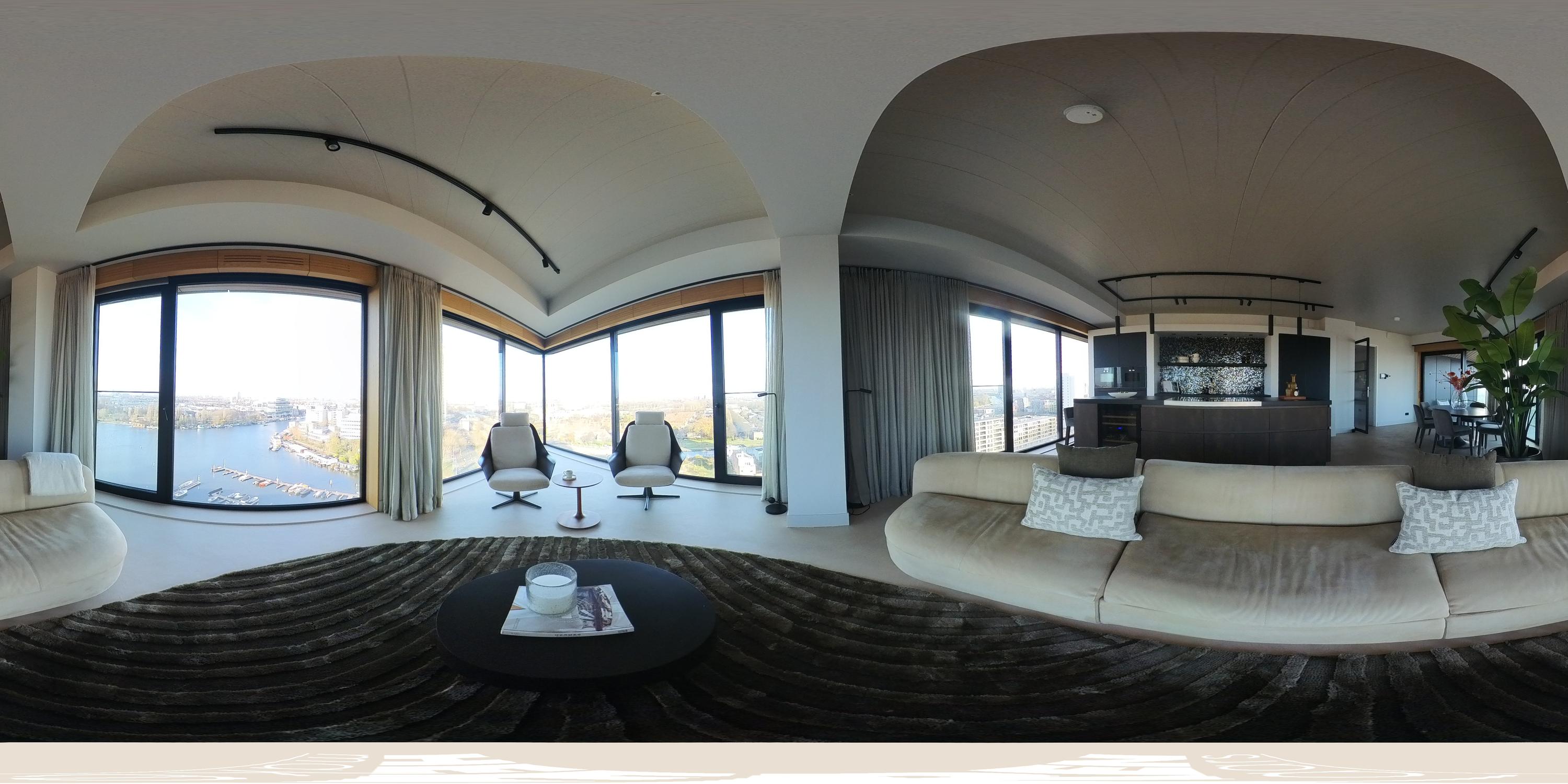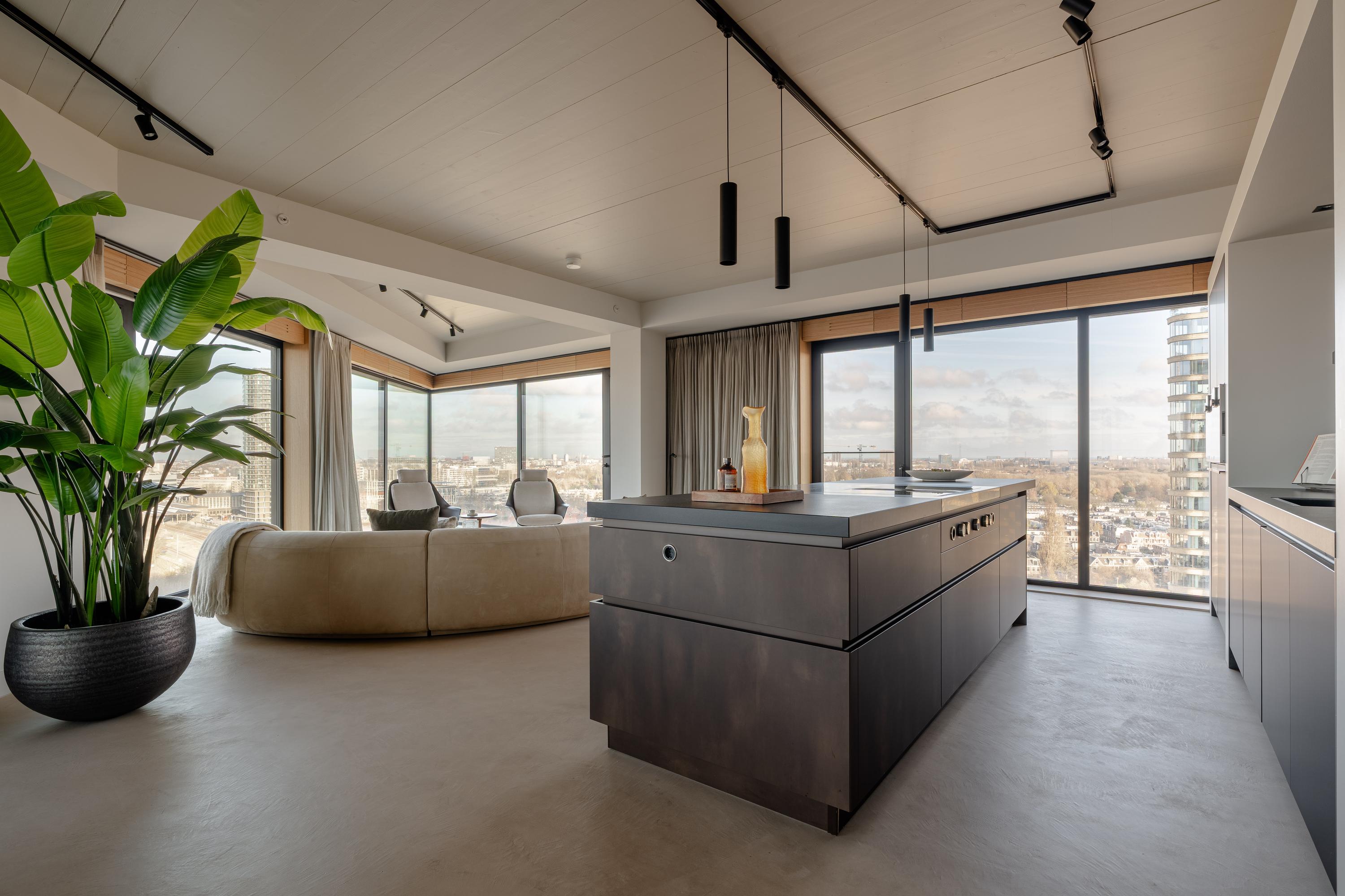 The apartment is accessed via the shared entrance, either by lift or staircase. Upon entering, you arrive in a spacious hallway that provides access to nearly all rooms of the property. From here, you reach the generous living room with open kitchen, three bedrooms, a bathroom, and a separate toilet. The living room is distinguished by its unique triangular layout and the extensive floor-to-ceiling windows along the façade, which ensure excellent natural light and offer unobstructed views towards the River Amstel. The space is generously proportioned and easily accommodates a comfortable seating area and a large dining table. From the living room, there is access to the spacious, covered balconyan inviting outdoor area with beautiful views over the city and the water. The open kitchen is centrally positioned within the living area and designed in a modern, sleek style. It is equipped with high-quality built-in appliances, including an induction cooktop with integrated extraction, a Quooker, a climate-controlled wine cabinet, a fridge/freezer combination, a dishwasher, and two Gaggenau ovens. The apartment features three well-proportioned bedrooms. The largest bedroom benefits from an en-suite bathroom, luxuriously finished with a washbasin and vanity unit, walk-in shower, and toilet. The second bathroom is accessible from the hallway and includes a walk-in shower, double washbasin, and a light, contemporary finish. In addition, there is a separate toilet.