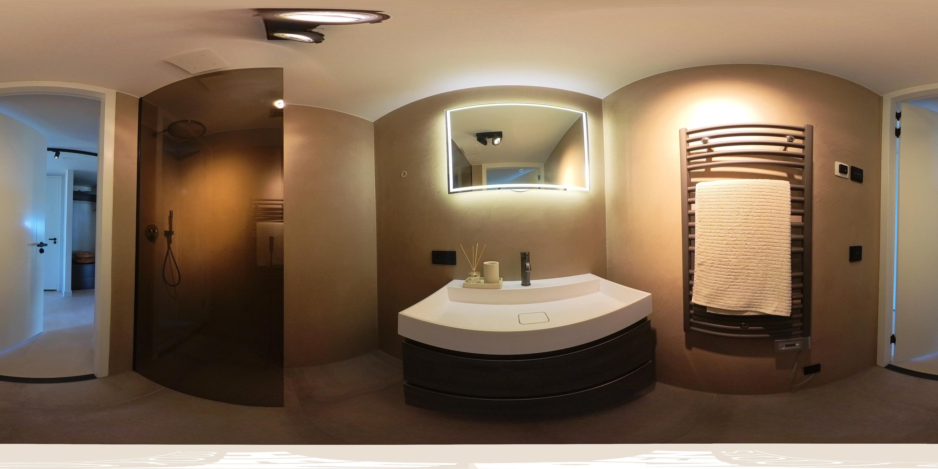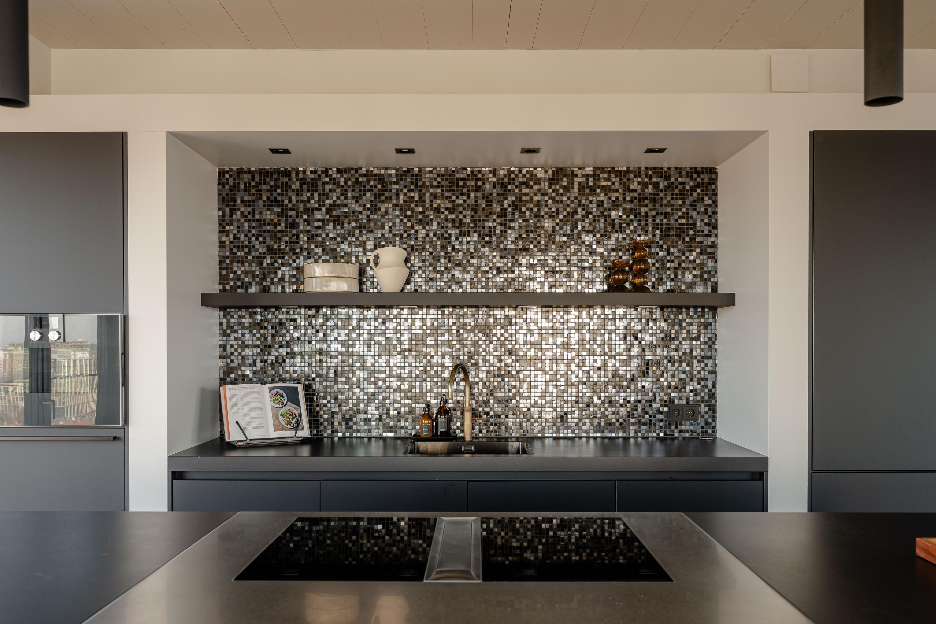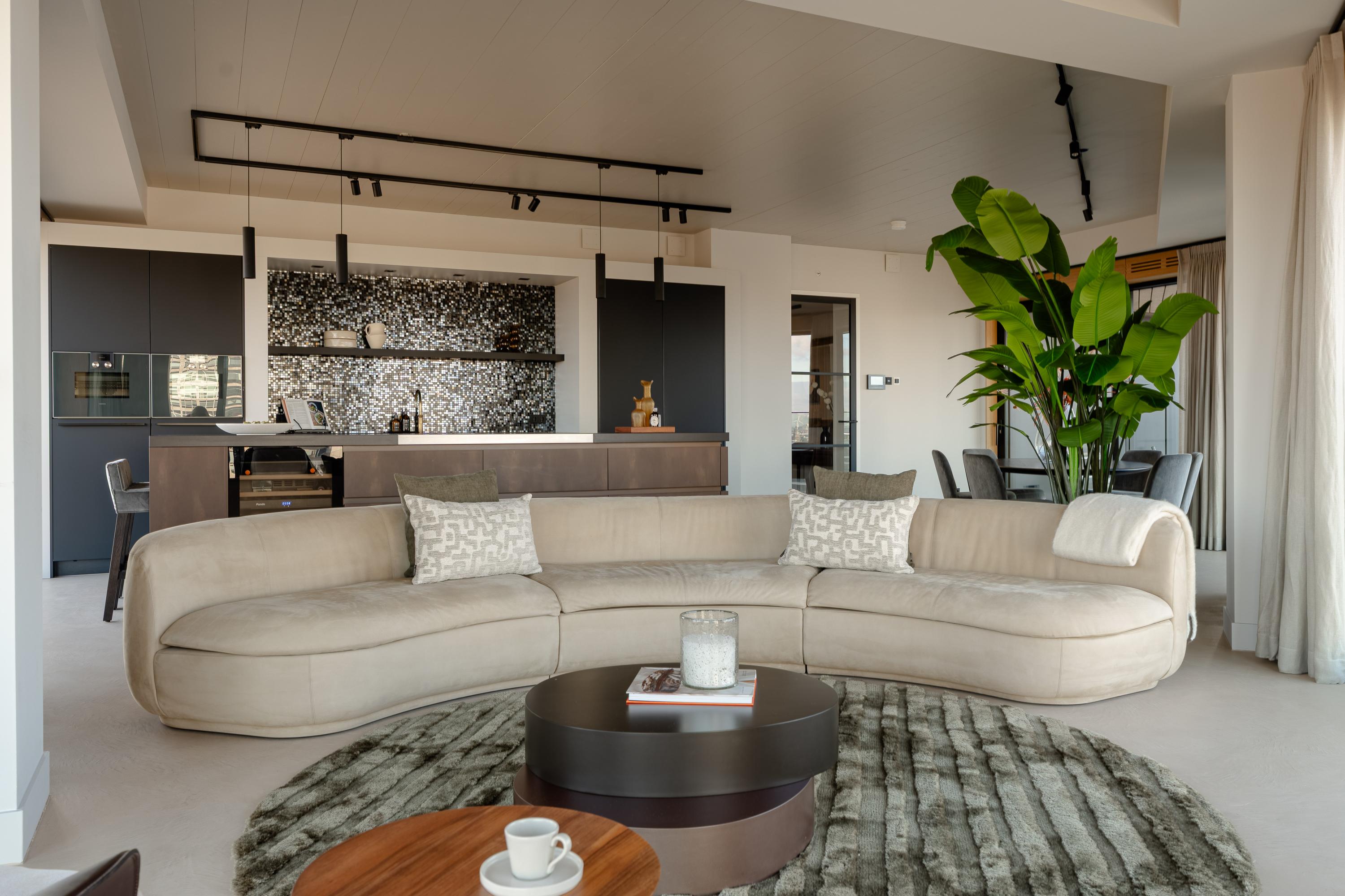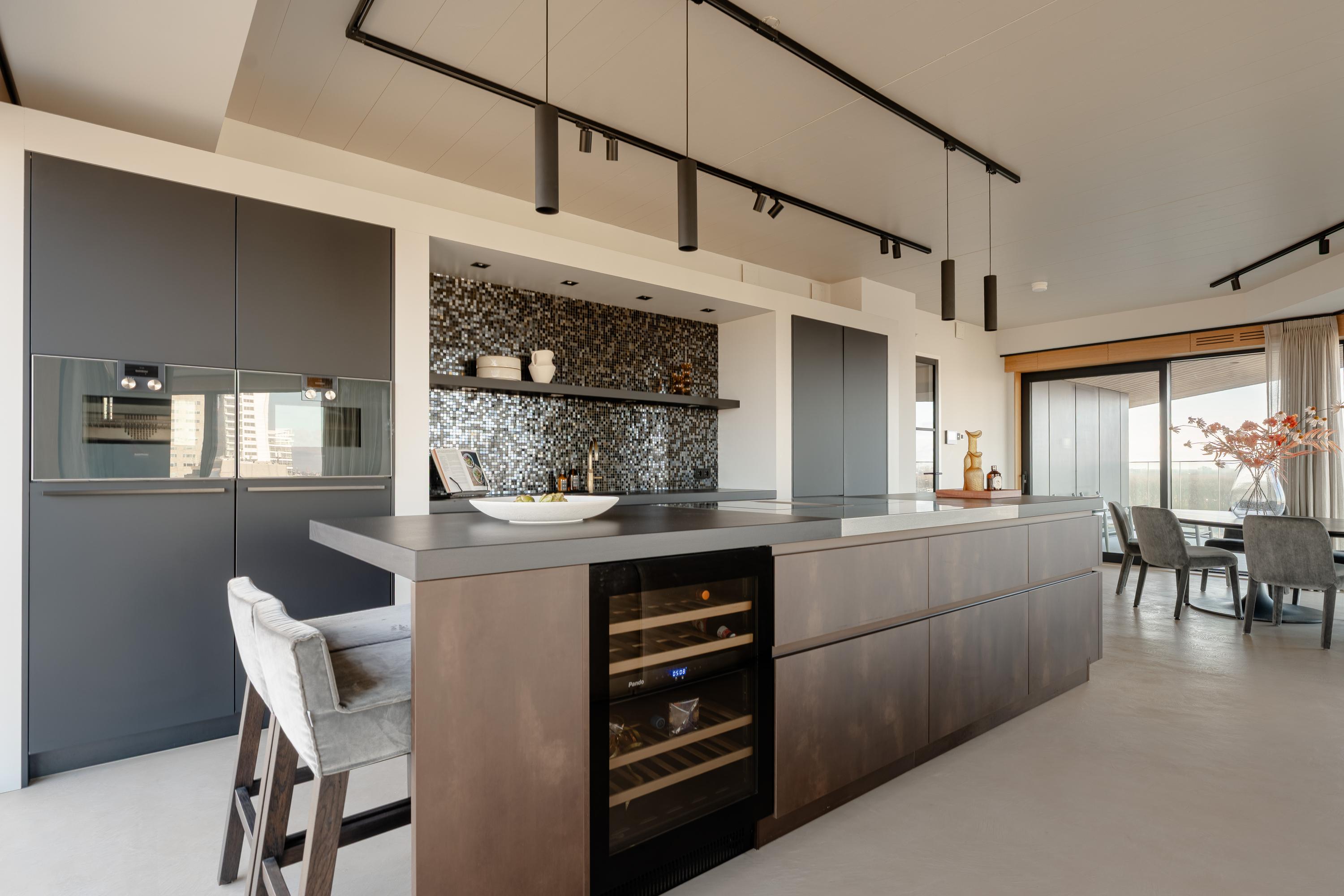 The apartment is accessed via the shared entrance, either by lift or staircase. Upon entering, you arrive in a spacious hallway that provides access to nearly all rooms of the property. From here, you reach the generous living room with open kitchen, three bedrooms, a bathroom, and a separate toilet. The living room is distinguished by its unique triangular layout and the extensive floor-to-ceiling windows along the façade, which ensure excellent natural light and offer unobstructed views towards the River Amstel. The space is generously proportioned and easily accommodates a comfortable seating area and a large dining table. From the living room, there is access to the spacious, covered balconyan inviting outdoor area with beautiful views over the city and the water. The open kitchen is centrally positioned within the living area and designed in a modern, sleek style. It is equipped with high-quality built-in appliances, including an induction cooktop with integrated extraction, a Quooker, a climate-controlled wine cabinet, a fridge/freezer combination, a dishwasher, and two Gaggenau ovens. The apartment features three well-proportioned bedrooms. The largest bedroom benefits from an en-suite bathroom, luxuriously finished with a washbasin and vanity unit, walk-in shower, and toilet. The second bathroom is accessible from the hallway and includes a walk-in shower, double washbasin, and a light, contemporary finish. In addition, there is a separate toilet.