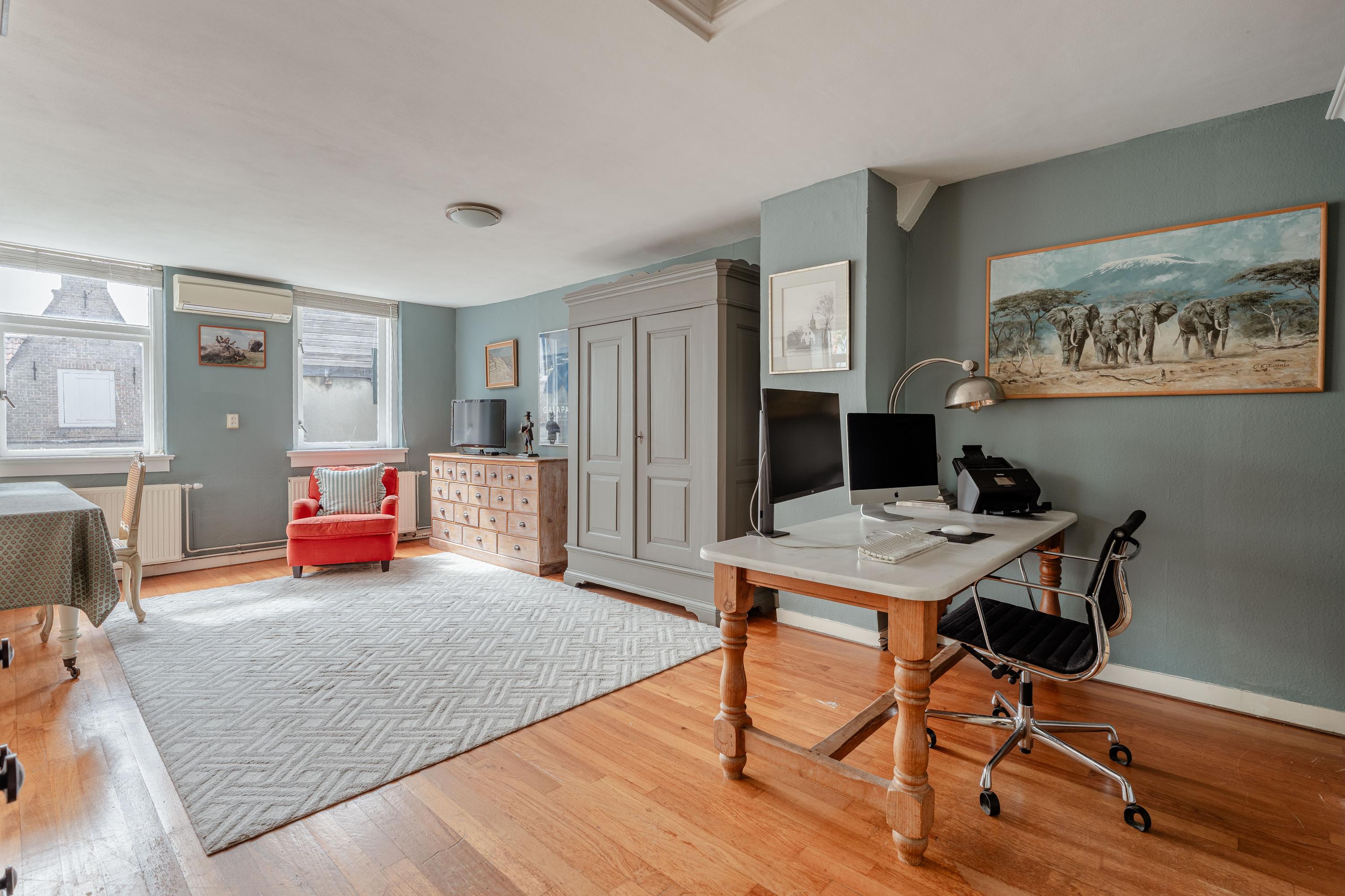 At the front is the spacious living room with high ceilings and large windows, flooding the room with natural light and offering beautiful views over the canal. The living room has ample space for both a seating and dining area and, together with the adjoining open kitchen, forms the heart of the home. The kitchen features a central cooking island and various built-in appliances, ideal for extensive cooking and entertaining.