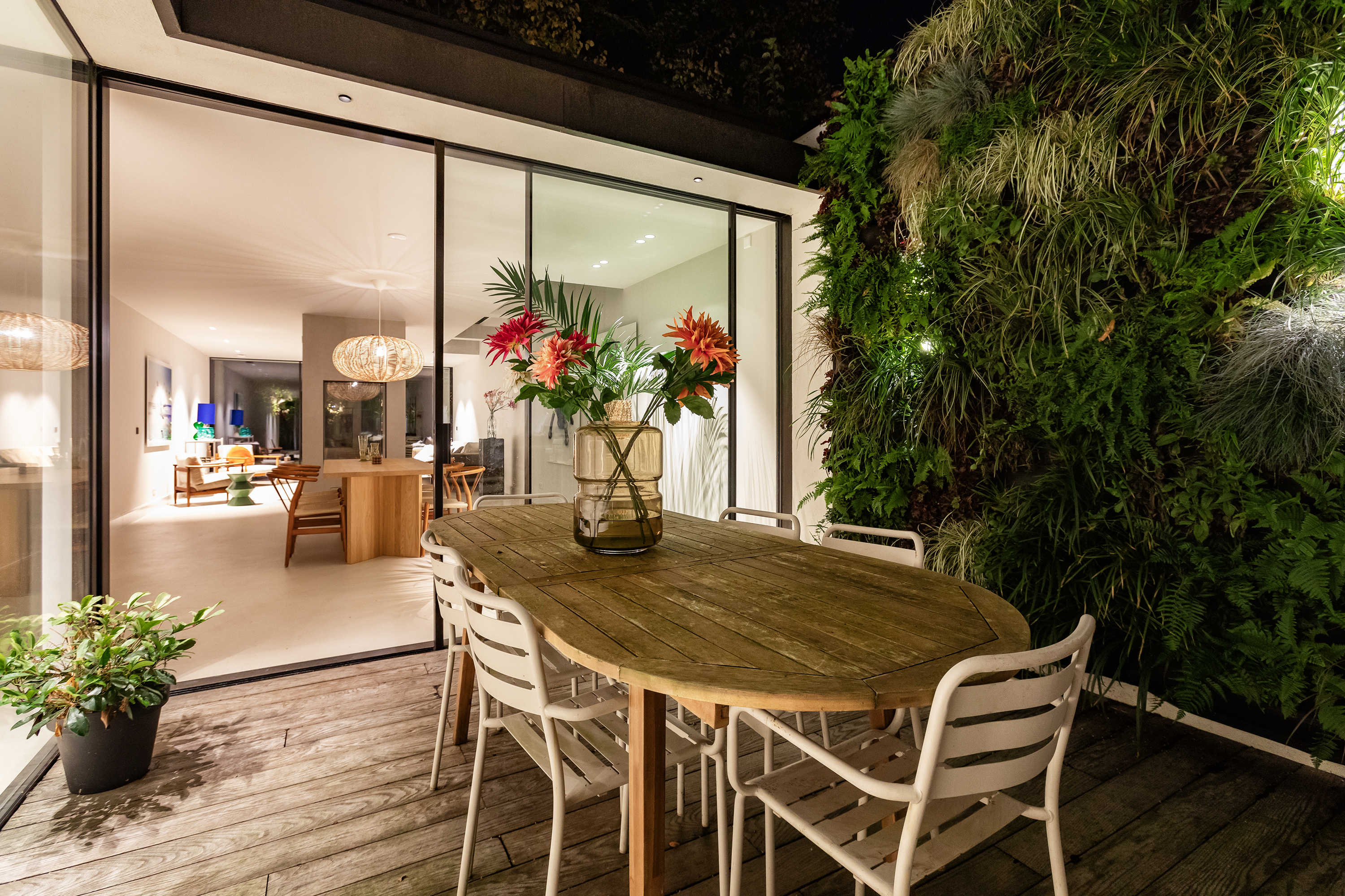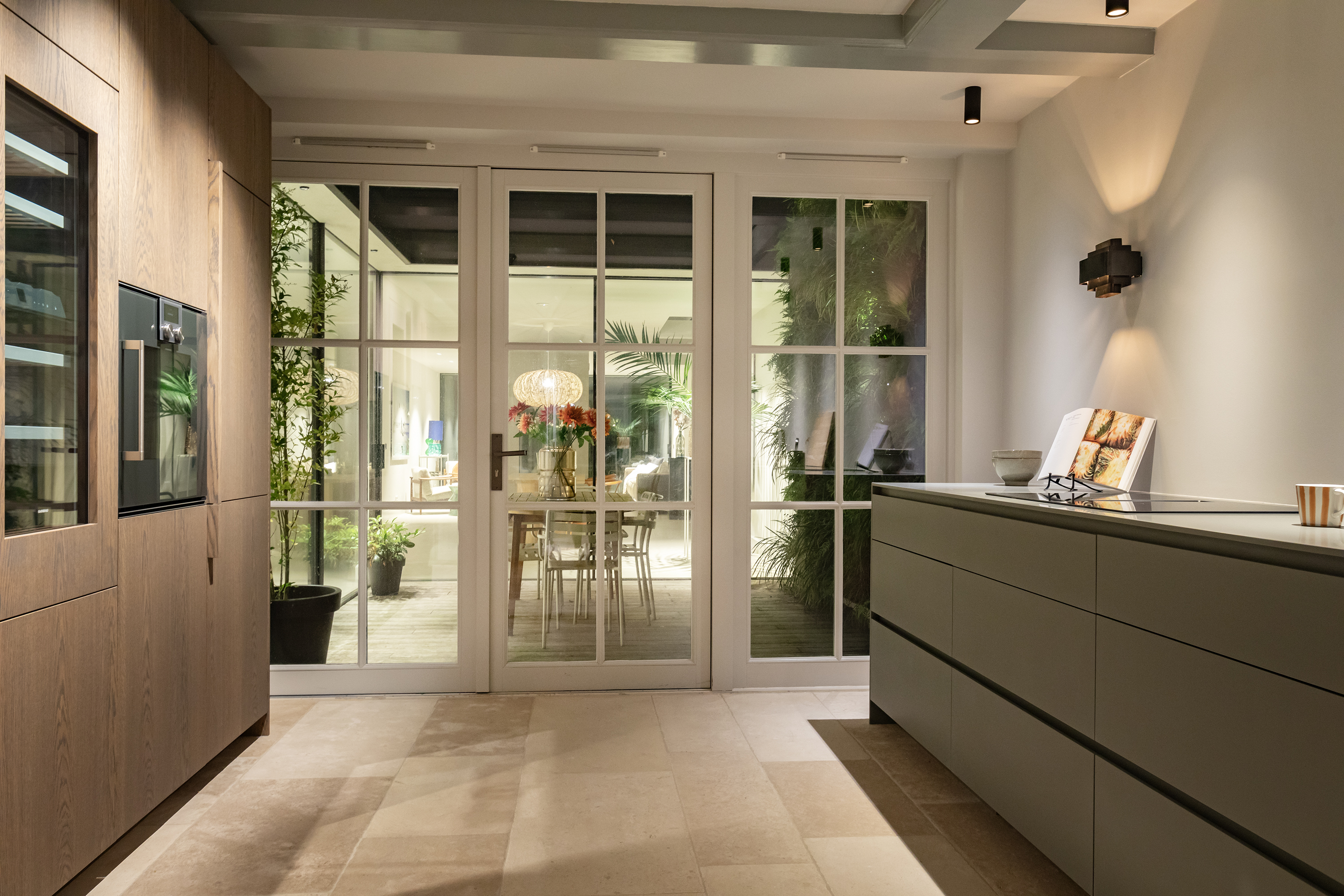 Stunning glazed steel doors lead into the property’s living kitchen. At the front of this floor, there is a dining room with a view of the canal through big windows. The luxury kitchen is equipped with a number of Gaggenau built-in appliances, including a double fridge and freezer, dishwasher, wine climate cabinet, (steam) oven, warming drawer, a sink with a Quooker tap and an induction hob with a built-in extraction system. A spacious patio floods the kitchen with light and can be accessed from both the kitchen and the living room.