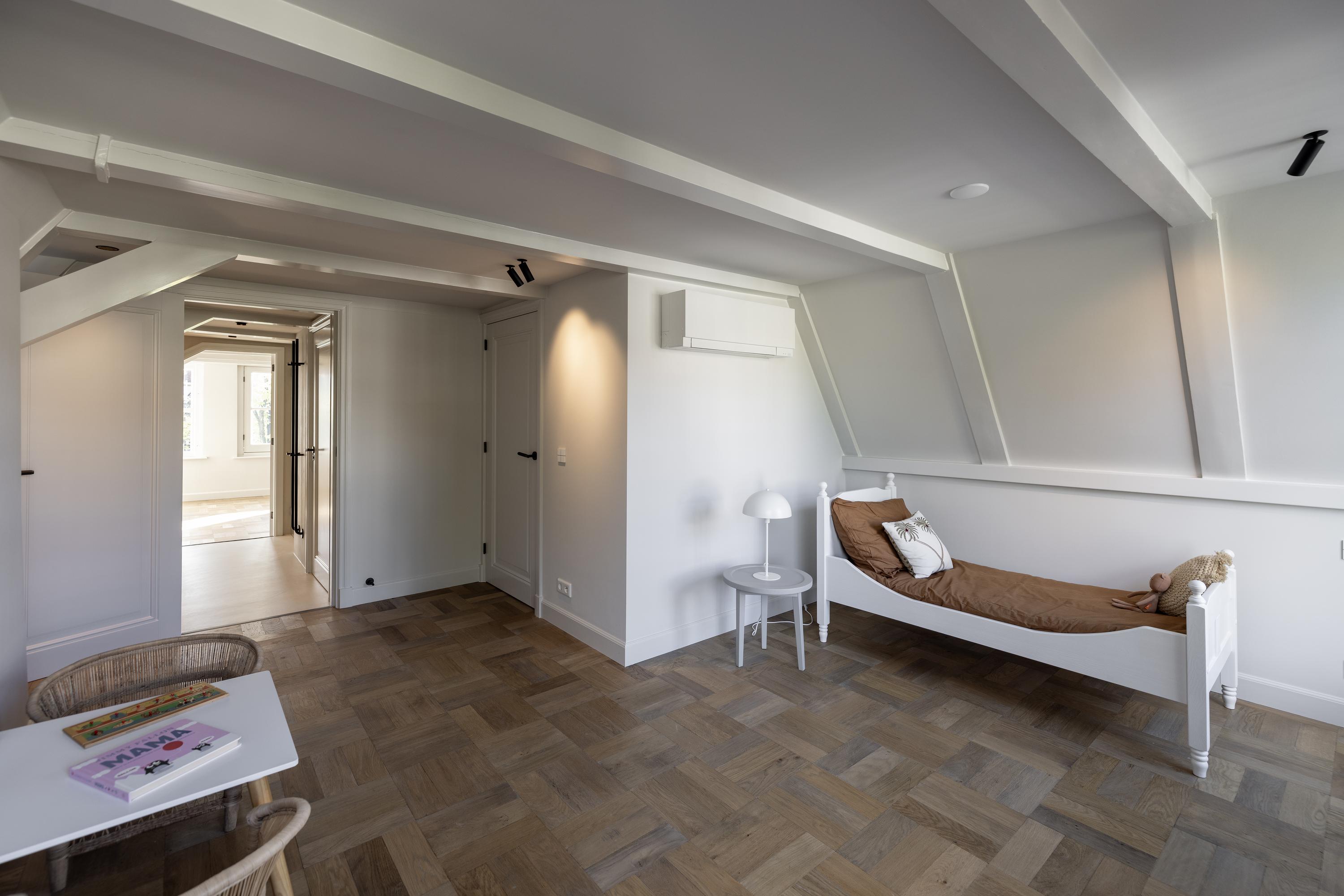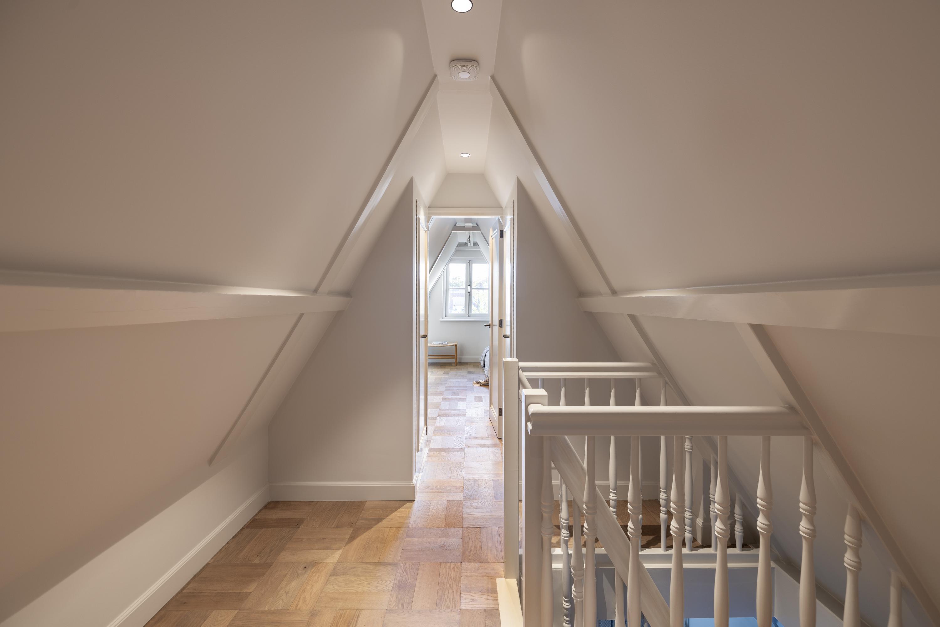 Stairs in the hall lead to the first floor, which is used as an extension of the living space on the ground floor. The landing gives access to a separate toilet room, which has been beautifully finished with attractive tiling. At the back of this floor, everything is in place to create a lounge-TV room (for example). The space at the front of this floor has a beautiful view of the canal and would work well as a study. At the back, there is a view of the extension’s green sedum roof.