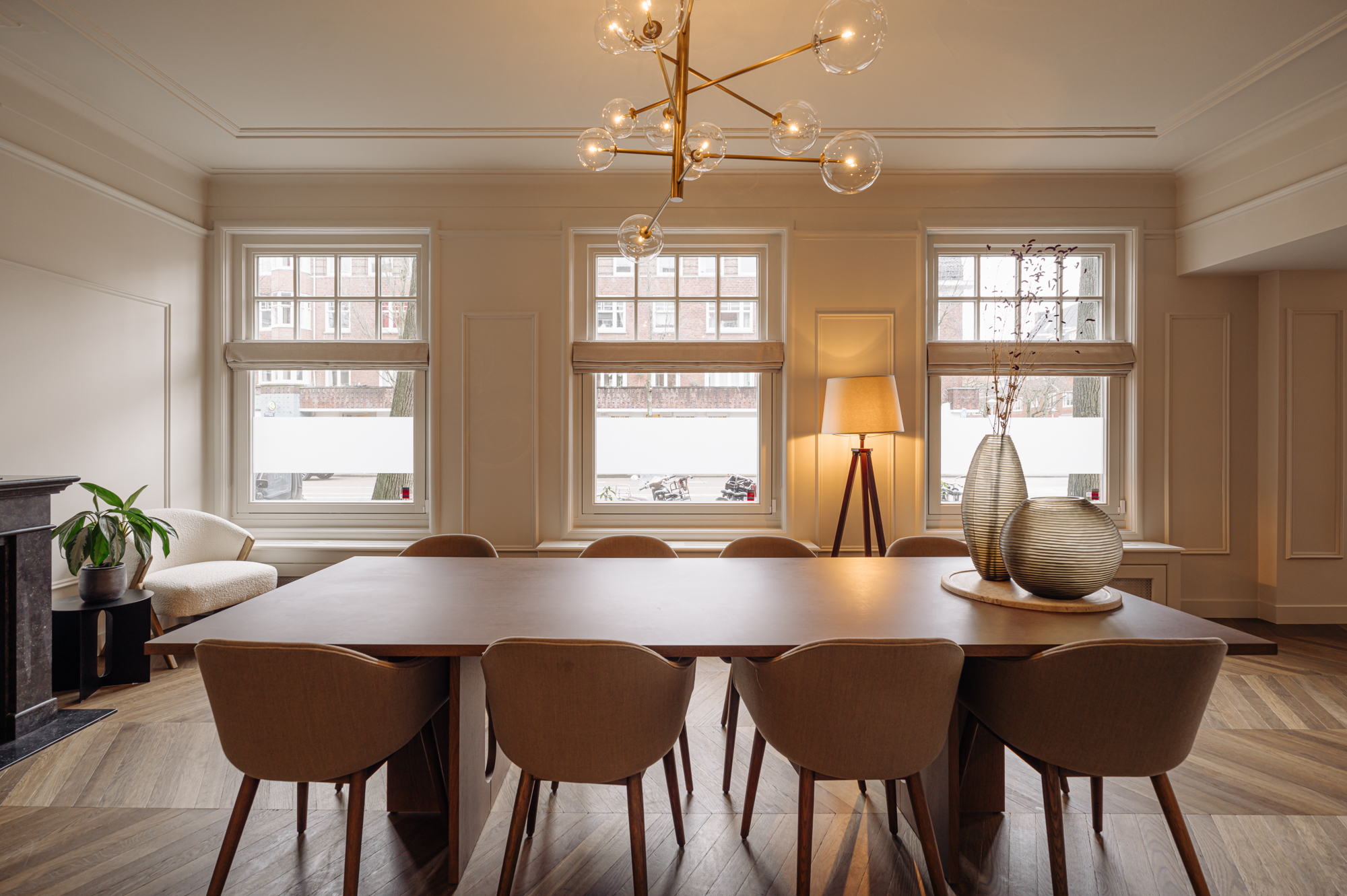 This spacious, beautifully-renovated, luxury ground-floor apartment (approx. 277 m²) is located in the very popular Amsterdam Zuid. The property has five large bedrooms, three stylish bathrooms and a sunny south-west-facing garden. The location is ideal: parks, arterial roads, shops and international schools are all close by, making it the perfect place for comfortable and stylish city living.