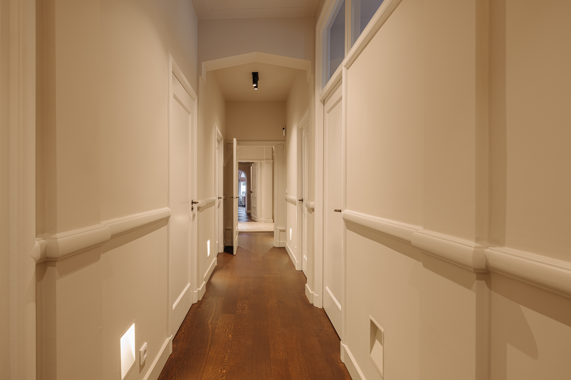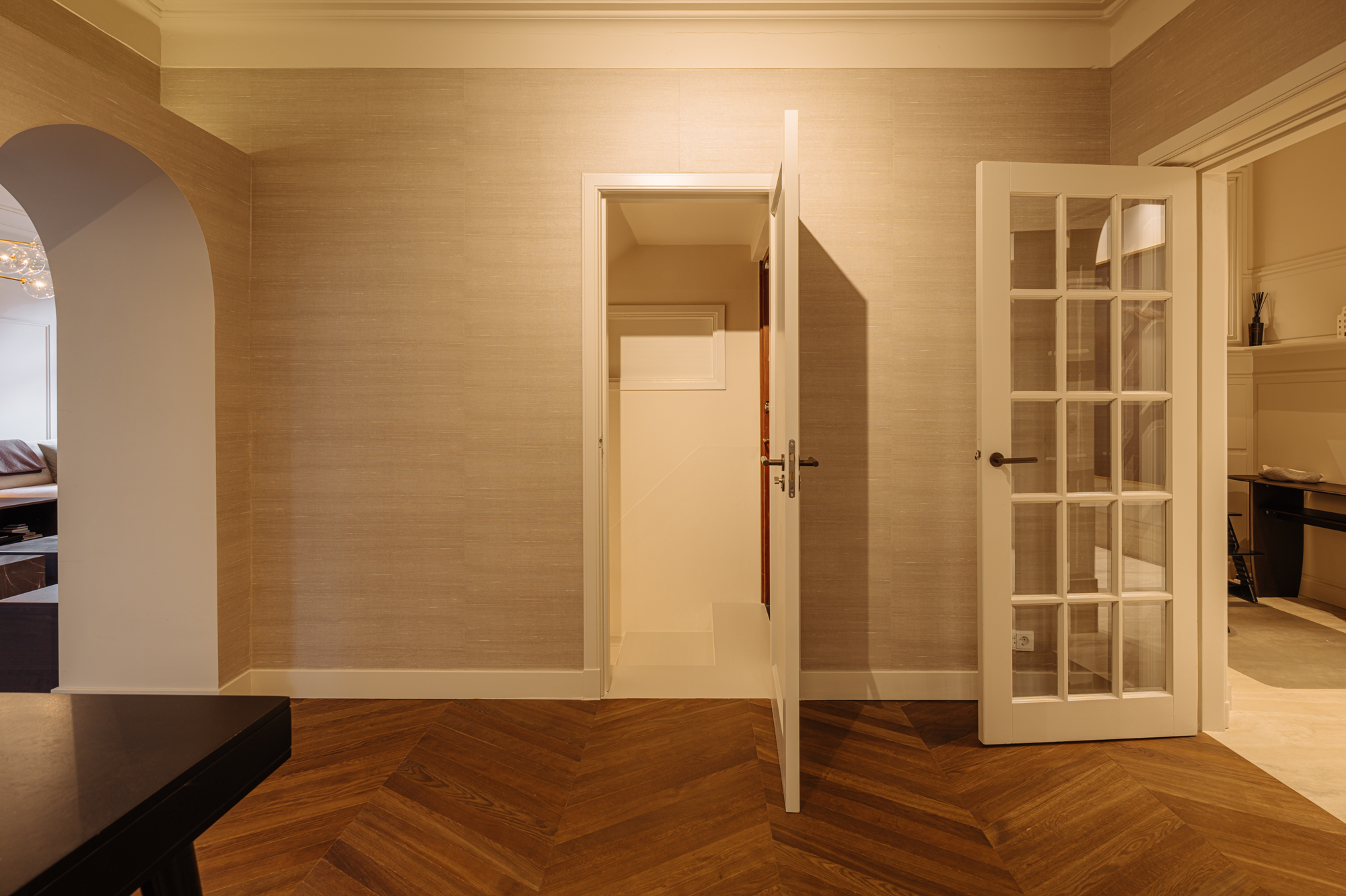 The apartment is entered via an ample hall that creates an immediate sense of space and elegance. The hall also gives access to a separate guest toilet and all the property’s other rooms. A large living room with a semi-open kitchen can be found on the right. The bedrooms and bathrooms are on the left.